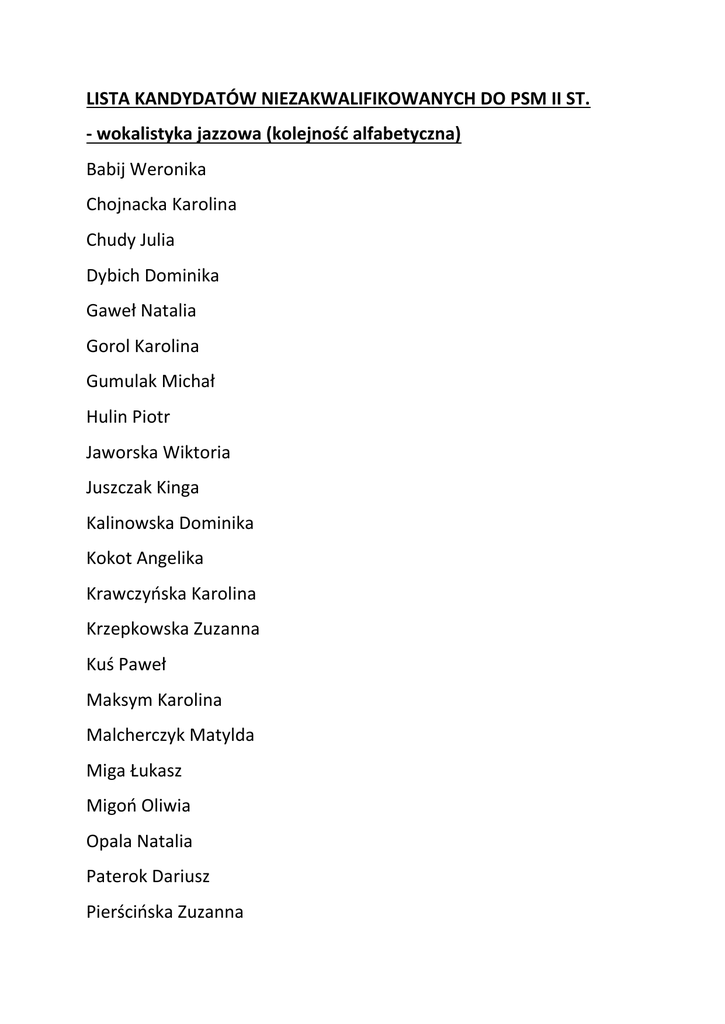 LISTA KANDYDATÓW NIEZAKWALIFIKOWANYCH DO PSM II ST. - wokalistyka jazzowa (kolejność alfabetyczna) Babij Weronika Chojnacka Karolina Chudy Julia Dybich Dominika Gaweł Natalia Gorol Karolina Gumulak Michał Hulin Piotr Jaworska Wiktoria Juszczak Kinga Kalinowska Dominika Kokot Angelika Krawczyńska Karolina Krzepkowska Zuzanna Kuś Paweł Maksym Karolina Malcherczyk Matylda Miga Łukasz Migoń Oliwia Opala Natalia Paterok Dariusz Pierścińska Zuzanna Pieter Alicja Pilarczyk Katarzyna Przybyła Wiktoria Roj Sara Seifried Katarzyna Skąpska Karolina Smykla Alicja Stryjewska Weronika Śniadek Weronika Toczek Małgorzata Torba Wiktoria Woszczyńska Aneta Zakrzewska Nikolina Zawadzka Daniela Ziomko Weronika nie zgłosili się Piekarczyk Aleksandra Solecka Weronika Ślusarczyk Aleksandra