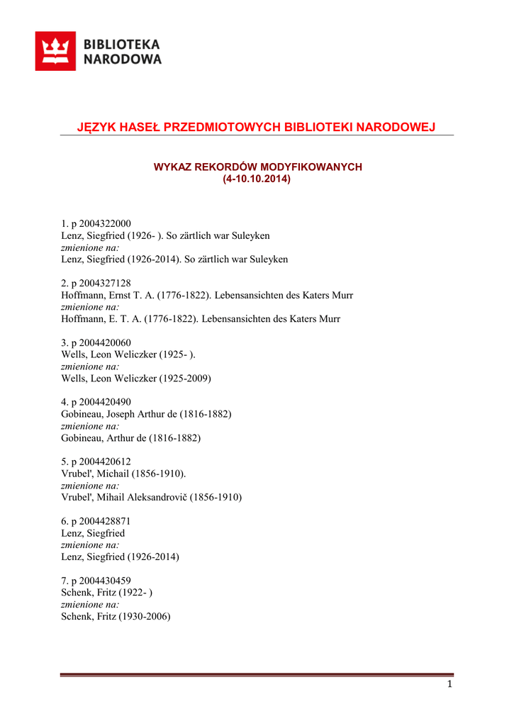 JĘZYK HASEŁ PRZEDMIOTOWYCH BIBLIOTEKI NARODOWEJ WYKAZ REKORDÓW MODYFIKOWANYCH (4-10.10.2014) 1. p 2004322000 Lenz, Siegfried (1926- ). So zärtlich war Suleyken zmienione na: Lenz, Siegfried (1926-2014). So zärtlich war Suleyken 2. p 2004327128 Hoffmann, Ernst T. A. (1776-1822). Lebensansichten des Katers Murr zmienione na: Hoffmann, E. T. A. (1776-1822). Lebensansichten des Katers Murr 3. p 2004420060 Wells, Leon Weliczker (1925- ). zmienione na: Wells, Leon Weliczker (1925-2009) 4. p 2004420490 Gobineau, Joseph Arthur de (1816-1882) zmienione na: Gobineau, Arthur de (1816-1882) 5. p 2004420612 Vrubel', Michail (1856-1910). zmienione na: Vrubel', Mihail Aleksandrovič (1856-1910) 6. p 2004428871 Lenz, Siegfried zmienione na: Lenz, Siegfried (1926-2014) 7. p 2004430459 Schenk, Fritz (1922- ) zmienione na: Schenk, Fritz (1930-2006) 1 8. p 2004432864 Zespół Szkół Rolniczych (Iłowa) zmienione na: Zespół Szkół Ponadgimnazjalnych (Iłowa) 9. p 2004435448 Pantaeva, Irina zmienione na: Pantaeva, Irina (1974- ) 10. p 2004435780 Rister, Herbert zmienione na: Rister, Herbert (1908-1993) 11. p 2004438001 Hoffmann, Ernst T. A. (1776-1822) zmienione na: Hoffmann, E. T. A. (1776-1822) 12. p 2004440177 Bandura, Ludwik (1904-1984) zmienione na: Bandura, Ludwik Ryszard (1904-1984) 13. p 2004514610 Budżet - prawo - Europa Zachodnia zmienione na: Budżet państwowy - prawo - Europa Zachodnia 14. p 2004636568 Publicystyka polska - język - 1956-1989 r. zmienione na: Publicystyka polska - stylistyka - 1956-1989 r. 15. p 2004636569 Publicystyka polska - język - 17 w. zmienione na: Publicystyka polska - stylistyka - 17 w. 16. p 2004636571 Publicystyka polska - język - 1944-1956 r. zmienione na: Publicystyka polska - stylistyka - 1944-1956 r. 17. p 2004792158 Rister, Herbert. Bibliographie der ehemaligen preussischen Ostprovinzen Übergreifende Themen : 1971-1985 zmienione na: Rister, Herbert (1908-1993). Bibliographie der ehemaligen preussischen Ostprovinzen Übergreifende Themen : 1971-1985 2 18. p 2004814619 Językoznawstwo - historia - Polska - do 16 w. zmienione na: Językoznawstwo - historia - Polska - 15-16 w. 19. p 2004823355 Hoffmann, Ernst T. A. (1776-1822) - a Poznań (woj. wielkopolskie) zmienione na: Hoffmann, E. T. A. (1776-1822) - a Poznań (woj. wielkopolskie) 20. p 2004843069 Budżet - Francja - 19-20 w. zmienione na: Budżet państwowy - Francja - 19-20 w. 21. p 2006802306 Frycie, Stanisław (1933- ) zmienione na: Frycie, Stanisław (1933-2013) 22. p 2007628697 Kostrzewski, Janusz (1930- ) zmienione na: Kostrzewski, Janusz (1930-2012) 23. p 2007714505 Rzewuska, Taida ( -1869) zmienione na: Rzewuska, Taida (?-1869) 24. p 2008020384 Budżet - Jugosławia - 1945-1991 r. zmienione na: Budżet państwowy Jugosławia 1945-1991 r. 25. p 2008051709 Zentralverband der Industriellen Oesterreichs (Wien) zmienione na: Centralverband der Industriellen Oesterreichs 26. p 2009025981 Zyngman, Israel zmienione na: Zyngman, Israel (1919- ) 27. p 2009056056 Zakłady Hutniczo-Przetwórcze Metali Nieżelaznych "Hutmen" (Wrocław) zmienione na: Hutmen (Wrocław) 3 28. p 2010021859 Hoffmann, Ernst T. A. zmienione na: Hoffmann, E. T. A. (1776-1822). Fräulein von Scudéri 29. p 2011016149 Ochrona krajobrazu - Białoruś - od 1991 r. zmienione na: Ochrona krajobrazu - Białoruś 30. p 2012012146 Hoffmann, Ernst T. A. (1776-1822) - a Śląsk zmienione na: Hoffmann, E. T. A. (1776-1822) - a Śląsk 31. p 2012028369 Lenz, Siegfried (1926- ) - a Polska zmienione na: Lenz, Siegfried (1926-2014) - a Polska 32. p 2013013551 Podbereska, Konstancja zmienione na: Słuszkowa, Konstancja 33. p 2013013726 KryWaj Krystyna Wajda (wydawnictwo) zmienione na: KryWaj Krystyna Wajda 34. p 2013015219 Dunaj (dolina) - Austria - geografia - 19 w. zmienione na: Dunaj (dolina) - geografia - Austria - 19 w. 35. p 2013015313 Warszawa ulica Swiętojańska zmienione na: Warszawa ulica Świętojańska 36. p 2014018128 Hoffmann, Ernst T. A. (1776-1822). Nussknacker und Mäusekönig zmienione na: Hoffmann, E. T. A. (1776-1822). Nussknacker und Mäusekönig 37. p 2014022021 Hoffmann, Ernst T. A. (1776-1822). Ritter Gluck zmienione na: Hoffmann, E. T. A. (1776-1822). Ritter Gluck 4 38. p 2014058809 Radziwiłłowa, Anna zmienione na: Radziwiłłowa, Anna (fl. 1832) 39. p 2014059900 Ygziabyher, Sybhat Gebre (1936-2012) zmienione na: Gebre Ygziabyher, Sybhat (1936-2012) 40. p 2014060286 Czerski, Janusz (1935- ). Liturgie Kościołów Wschodnich : liturgia Kościoła bizantyjskiego, ormiańskiego i koptyjskiego zmienione na: Czerski, Janusz (1935- ). Liturgie Kościołów Wschodnich 41. p 2014060428 Kamińska, Magdalena. Niecne memy zmienione na: Kamińska, Magdalena (socjolog). Niecne memy 5