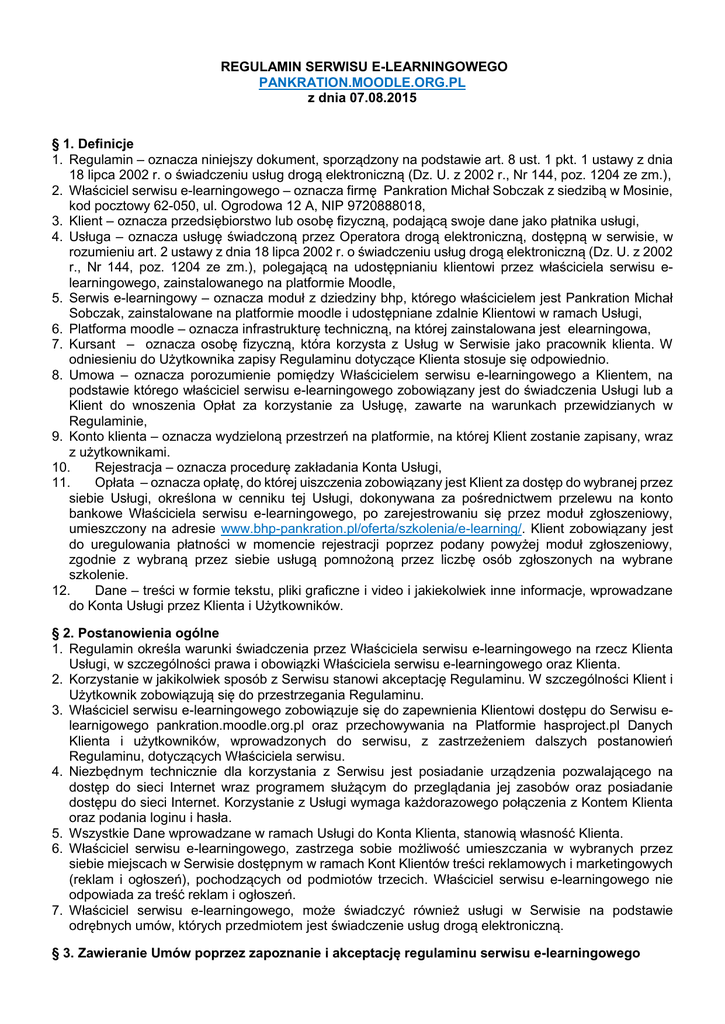 REGULAMIN SERWISU E-LEARNINGOWEGO PANKRATION.MOODLE.ORG.PL z dnia 07.08.2015 § 1. Definicje 1. Regulamin – oznacza niniejszy dokument, sporządzony na podstawie art. 8 ust. 1 pkt. 1 ustawy z dnia 18 lipca 2002 r. o świadczeniu usług drogą elektroniczną (Dz. U. z 2002 r., Nr 144, poz. 1204 ze zm.), 2. Właściciel serwisu e-learningowego – oznacza firmę Pankration Michał Sobczak z siedzibą w Mosinie, kod pocztowy 62-050, ul. Ogrodowa 12 A, NIP 9720888018, 3. Klient – oznacza przedsiębiorstwo lub osobę fizyczną, podającą swoje dane jako płatnika usługi, 4. Usługa – oznacza usługę świadczoną przez Operatora drogą elektroniczną, dostępną w serwisie, w rozumieniu art. 2 ustawy z dnia 18 lipca 2002 r. o świadczeniu usług drogą elektroniczną (Dz. U. z 2002 r., Nr 144, poz. 1204 ze zm.), polegającą na udostępnianiu klientowi przez właściciela serwisu elearningowego, zainstalowanego na platformie Moodle, 5. Serwis e-learningowy – oznacza moduł z dziedziny bhp, którego właścicielem jest Pankration Michał Sobczak, zainstalowane na platformie moodle i udostępniane zdalnie Klientowi w ramach Usługi, 6. Platforma moodle – oznacza infrastrukturę techniczną, na której zainstalowana jest elearningowa, 7. Kursant – oznacza osobę fizyczną, która korzysta z Usług w Serwisie jako pracownik klienta. W odniesieniu do Użytkownika zapisy Regulaminu dotyczące Klienta stosuje się odpowiednio. 8. Umowa – oznacza porozumienie pomiędzy Właścicielem serwisu e-learningowego a Klientem, na podstawie którego właściciel serwisu e-learningowego zobowiązany jest do świadczenia Usługi lub a Klient do wnoszenia Opłat za korzystanie za Usługę, zawarte na warunkach przewidzianych w Regulaminie, 9. Konto klienta – oznacza wydzieloną przestrzeń na platformie, na której Klient zostanie zapisany, wraz z użytkownikami. 10. Rejestracja – oznacza procedurę zakładania Konta Usługi, 11. Opłata – oznacza opłatę, do której uiszczenia zobowiązany jest Klient za dostęp do wybranej przez siebie Usługi, określona w cenniku tej Usługi, dokonywana za pośrednictwem przelewu na konto bankowe Właściciela serwisu e-learningowego, po zarejestrowaniu się przez moduł zgłoszeniowy, umieszczony na adresie www.bhp-pankration.pl/oferta/szkolenia/e-learning/. Klient zobowiązany jest do uregulowania płatności w momencie rejestracji poprzez podany powyżej moduł zgłoszeniowy, zgodnie z wybraną przez siebie usługą pomnożoną przez liczbę osób zgłoszonych na wybrane szkolenie. 12. Dane – treści w formie tekstu, pliki graficzne i video i jakiekolwiek inne informacje, wprowadzane do Konta Usługi przez Klienta i Użytkowników. § 2. Postanowienia ogólne 1. Regulamin określa warunki świadczenia przez Właściciela serwisu e-learningowego na rzecz Klienta Usługi, w szczególności prawa i obowiązki Właściciela serwisu e-learningowego oraz Klienta. 2. Korzystanie w jakikolwiek sposób z Serwisu stanowi akceptację Regulaminu. W szczególności Klient i Użytkownik zobowiązują się do przestrzegania Regulaminu. 3. Właściciel serwisu e-learningowego zobowiązuje się do zapewnienia Klientowi dostępu do Serwisu elearnigowego pankration.moodle.org.pl oraz przechowywania na Platformie hasproject.pl Danych Klienta i użytkowników, wprowadzonych do serwisu, z zastrzeżeniem dalszych postanowień Regulaminu, dotyczących Właściciela serwisu. 4. Niezbędnym technicznie dla korzystania z Serwisu jest posiadanie urządzenia pozwalającego na dostęp do sieci Internet wraz programem służącym do przeglądania jej zasobów oraz posiadanie dostępu do sieci Internet. Korzystanie z Usługi wymaga każdorazowego połączenia z Kontem Klienta oraz podania loginu i hasła. 5. Wszystkie Dane wprowadzane w ramach Usługi do Konta Klienta, stanowią własność Klienta. 6. Właściciel serwisu e-learningowego, zastrzega sobie możliwość umieszczania w wybranych przez siebie miejscach w Serwisie dostępnym w ramach Kont Klientów treści reklamowych i marketingowych (reklam i ogłoszeń), pochodzących od podmiotów trzecich. Właściciel serwisu e-learningowego nie odpowiada za treść reklam i ogłoszeń. 7. Właściciel serwisu e-learningowego, może świadczyć również usługi w Serwisie na podstawie odrębnych umów, których przedmiotem jest świadczenie usług drogą elektroniczną. § 3. Zawieranie Umów poprzez zapoznanie i akceptację regulaminu serwisu e-learningowego 1. Warunkiem korzystania z Usługi jest zawarcie Umowy przez Klienta, przy czym za takie uważa się zarejestrowanie w serwisie, przez moduł zgłoszeniowy umieszczony na adresie: www.bhppankration.pl/oferta/szkolenia/e-learning/, zgłoszenie się na odpowiedni kurs, podanie listy osób i zaakceptowanie poniższego Regulaminu. 2. W przypadku wypełnienia i wysłania formularza rejestracyjnego Operator automatycznie generuje Konto Klienta i powoduje automatycznie, naliczenie opłaty zgodnie z aktualnym cennikiem. 3. Konto Klienta, aktywowane jest po zarejestrowaniu się Klienta, równocześnie za usługę, zostaje naliczona opłata. 4. Faktury VAT z tytułu świadczenia Usługi, dostarczane będą przez Operatora Klientowi w formie elektronicznej (w rozumieniu Rozporządzenia Ministra Finansów w sprawie przesyłania faktur w formie elektronicznej, zasad ich przechowywania oraz trybu udostępniania organowi podatkowemu lub organowi kontroli skarbowej z dnia 17 grudnia 2010 roku (Dz. U. Nr 249, poz. 1661) w panelu Konta Usługi, na co Klient wyraża zgodę. 5. Z chwilą zarejestrowania zgłoszenia oraz zapoznaniu i akceptacji przez Klienta poniższego Regulaminu, właściciel serwisu e-learningowego udziela Klientowi niewyłącznej i nieprzenoszalnej (z prawem odwołania) licencji na korzystanie z Serwisu w ramach Konta Klienta, wyłącznie na potrzeby prowadzonej przez Klienta działalności zawodowej i gospodarczej, przez okres 7 dni. 6. Klient w procesie Rejestracji zobo