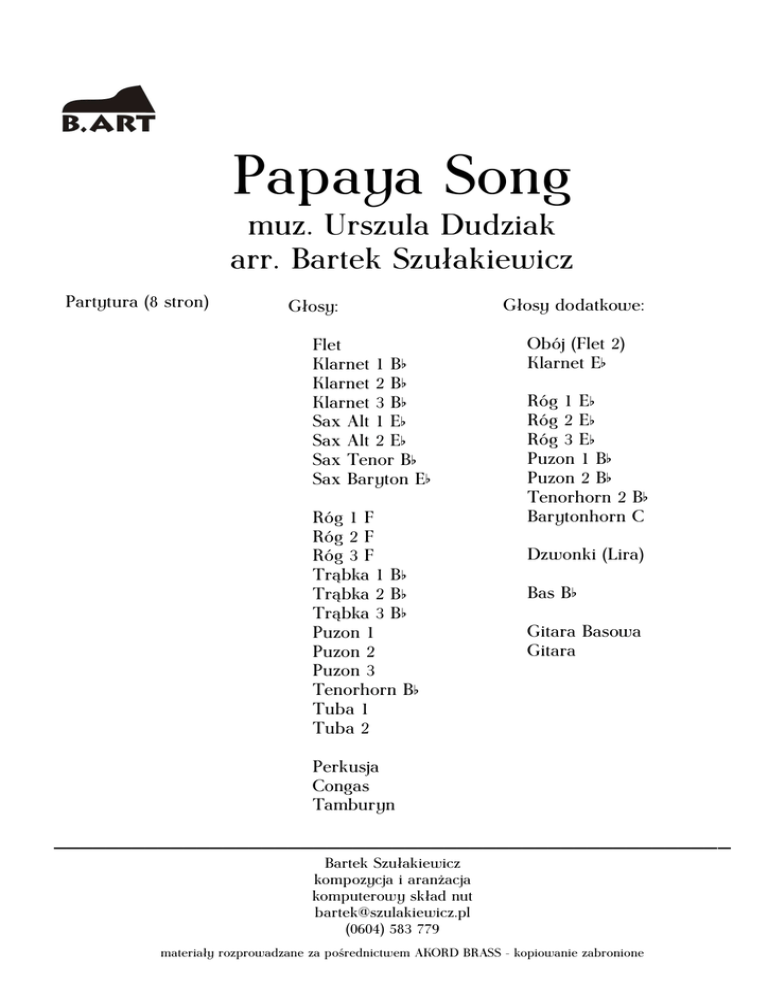 Papaya Song muz. Urszula Dudziak arr. Bartek Szułakiewicz Partytura (8 stron) Głosy: Flet Klarnet 1 B b Klarnet 2 B b Klarnet 3 B b Sax Alt 1 E b Sax Alt 2 E b Sax Tenor B b Sax Baryton E b Róg 1 F Róg 2 F Róg 3 F Trąbka 1 B b Trąbka 2 B b Trąbka 3 B b Puzon 1 Puzon 2 Puzon 3 Tenorhorn B b Tuba 1 Tuba 2 Głosy dodatkowe: Obój (Flet 2) Klarnet E b Róg 1 E b Róg 2 E b Róg 3 E b Puzon 1 B b Puzon 2 B b Tenorhorn 2 B b Barytonhorn C Dzwonki (Lira) Bas B b Gitara Basowa Gitara Perkusja Congas Tamburyn ____________________________________________________ Bartek Szułakiewicz kompozycja i aranżacja komputerowy skład nut [email protected] (0604) 583 779 materiały rozprowadzane za pośrednictwem AKORD BRASS - kopiowanie zabronione muz. Urszula Dudziak arr. Bartek Szułakiewicz Papaya Song q Flet Klarnet 1 B b Klarnet 2 B b bb &bb c b &b c b &b c Klarnet 3 B b &b Sax Alt 1 E b &b Sax Alt 2 E b Sax Tenor B b Sax Baryton E b Róg 1 F Róg 2 F Róg 3 F Trąbka 1 B b Trąbka 2 B b Trąbka 3 B b Puzon 1 Puzon 2 Puzon 3 Tenorhorn B b Bass Perkusja b c = 130 Disco >œ J‰ ƒ >œ J‰ ƒ >œ J‰ ƒ >œ J‰ ƒ > c œ‰ J ƒ >œ &b c J ‰ ƒ > b & b c Jœ ‰ ƒ > j &b c œ ‰ ƒ b > & b b c Jœ ‰ ƒ > b j &bb c œ ‰ ƒ > b & b b c œj ‰ ƒ >œ b &b c J ‰ ƒ > b & b c Jœ ‰ ƒ b c >œ ‰ J ƒ > ? b b c Jœ ‰ bb ƒ > ? b b c j‰ bb œ ƒ > ? b b c œj ‰ bb ƒ > j bb c œ ‰ & œ ƒ Αb ? b b b c œσυσ b œœ ƒ x c œœ ã &b Congas ã Tamburyn ã >œ >œ >œ >œ >œ >œ >œ >œ n >œ >œ >œ >œ J‰J‰J‰ J ‰J‰J‰J‰ J‰J‰J‰J‰ J ‰Œ >œ >œ >œ # >œ >œ >œ >œ n >œ >œ >œ >œ n >œ J‰J‰J‰ J ‰J‰J‰J‰ J‰J‰J‰J‰ J ‰Œ Ó Ó >œ >œ >œ >œ >œ >œ >œ >œ # >œ >œ >œ >œ J‰J‰J‰ J ‰J‰J‰J‰ J‰J‰J‰J‰ J ‰Œ Ó > >œ >œ >œ # >œ >œ >œ >œ ‰ ‰ ‰ J ‰ ‰ ‰ ‰ Jœ J J J J J J Ó >œ ‰J > > ‰ œJ ‰ œJ > > ‰ œJ ‰ œJ ‰ Œ ‰ Ó ^œ ^œ ^œ ^œ ^œ J ‰ Ó ‰ Ó ^œ ^œ ^œ ^œ ^œ J ‰ Ó ‰ Ó ^œ œ^ ^œ ^œ ^œ J ‰ Ó ‰ Ó ^œ œ^ ^œ ^œ ^œ J ‰ Ó ^œ ^œ ^œ œ^ ^œ ‰ Ó J f ^œ ^œ ^œ ^œ ^œ J ‰ Ó f ^^^^^ j œœœœœ ‰ Ó >œ >œ >œ >œ >œ >œ >œ >œ # >œ >œ >œ >œ J‰J‰J‰ J ‰J‰J‰J‰ J‰J‰J‰J‰ J ‰Œ Ó >œ >œ >œ # >œ >œ >œ >œ n >œ J‰J‰J‰ J ‰J‰J‰J‰ J > > ‰ œJ ‰ n œJ ‰ Œ Ó w > > > > > > > > > > > > j j j j j j j j j j j j œ ‰ œ ‰ œ ‰ #œ ‰ œ ‰ œ ‰ œ ‰ œ ‰ œ ‰ œ ‰ œ ‰ œ ‰ Œ w f Ó w >œ ‰ >œ ‰ >œ ‰ n >œ ‰ >œ ‰ >œ ‰ >œ ‰ >œ J J J J J J J J w f Ó w > > > > > > > > > > > > j j j j j j j j j j j j œ ‰ œ ‰ œ ‰ #œ ‰ œ ‰ œ ‰ œ ‰ nœ ‰ œ ‰ œ ‰ œ ‰ nœ ‰ Œ w f Ó w > > > > > > > > > > > > j j j j j j j j j j j j œ ‰ œ ‰ œ ‰ nœ ‰ œ ‰ œ ‰ œ ‰ œ ‰ œ ‰ œ ‰ œ ‰ œ ‰ Œ w f Ó w f ^œ ^œ ^œ œ^ ^œ J ‰ Ó f w > > ‰ œJ ‰ œJ ‰ >œJ ‰ >œJ ‰ >œJ ‰ >œJ ‰ Œ >œ >œ >œ >œ >œ >œ >œ >œ # >œ >œ >œ >œ J‰J‰J‰ J ‰J‰J‰J‰ J‰J‰J‰J‰ J ‰Œ Ó >œ >œ >œ # >œ >œ >œ >œ n >œ J‰J‰J‰ J ‰J‰J‰J‰ J > > ‰ œJ ‰ n œJ ‰ Œ Ó >œ ‰ >œ ‰ >œ ‰ n >œ ‰ >œ ‰ >œ ‰ >œ ‰ >œ ‰ >œ ‰ >œ ‰ >œ ‰ >œ ‰ Œ J J J J J J J J J J J J Ó > > ‰ œJ ‰ œJ >œ >œ >œ >œ >œ >œ ‰J‰ J‰J‰J‰J‰ J ‰Œ Ó > > > > > > > > > > > > j j j j j j j j j j j j œ ‰ œ ‰ œ ‰ nœ ‰ œ ‰ œ ‰ œ ‰ œ ‰ œ ‰ œ ‰ œ ‰ œ ‰ Œ Ó > > > > > j j j j j œ‰œ‰œ‰œ‰ œ ‰Œ Ó >œ J >œ ‰J > j œ‰ > j œ‰ œ >œ n >œ >œ ‰J‰ J ‰J > j œ‰ > j œ‰ œ œœœœ œ œ x x œœœœ > j œ‰ > j œ‰ œ > j nœ ‰ > j #œ ‰ #œ Β συσ œ œ nœ #œ œ nœ x x œœ œ œ >œ ‰J > j œ ‰ > j œ ‰ œ œ œ x œ > j œ ‰ > j œ ‰ œ > j œ ‰ > j œ ‰ œ >œ œ J >œ ‰Œ Ó œ J Χ συσ j‰ Œ Ó œ œœ œ œœ œ œœ œ œœ œ œœ œ œœ œ œœ x x x x x x x fill in œ œ œ œ œ œ œ œ œ œ œ œ œ œœ ‰ ’ ’ J ‰ >œ œ J ‰ >œ œ J ‰ ∑ ∑ ∑ ^œ ^œ ^œ œ^ ^œ ‰ Ó J f ^ ^ ^ ^ ^j œœœœœ ‰ Ó f w f Ó ∑ ^œ œ^ ^œ ^œ ^œ ‰ Ó J ^ ^ ^ ^ ^j œœœœœ ‰ Ó ^ ^ ^ ^ ^j œœœœœ ‰ Ó w w w f w ^œ ^œ ^œ œ^ ^œ J ‰ Ó f ∆ b µα7 ’ ^œ œ^ ^œ ^œ ^œ J ‰ Ó w f >œ ‰ œ J ƒ c œ œ œ œ œ œ œ œ œ œ œ œ œ œ œ œ œ œ œ 5 œ œ œ œ œJ ‰ Œ ƒ c Ó >œ >œ >œ >œ >œ >œ n >œ >œ >œ >œ J J J J J J J J J ‰ ‰ ‰ ‰ ‰ ‰ ‰ ‰ ‰ ‰ J ‰Œ >œ J ^œ ^œ ^œ ^œ ^œ J f ^œ ^œ ^œ ^œ ^œ J f ^œ ^œ ^œ œ^ ^œ J f ^œ ^œ ^œ œ^ ^œ J f A œ œ. œ œ Œ œ œ . œœ œ œ f x x x x xœ x x x x x x x xœ x x x œ œ œ œ f œ œ œ œ œœœœ œœ5œœœœœ f ^œ œ^ ^œ ^œ ^œ ‰ Ó J Χ µι7 œ œ œ. œ œ ‰ n œj œ. œ œ œ nœ x x x x xxxxxxxxxxxx œœ œœ œ œ œ œ œ œ œœœœœœ5œœœœœ œ œ œ œ >œ œ œ œ œ œ œ œ >œ œ œ œ œ œ œ œ >œ œ œ œ œ œ œ œ >œ œ œ œ f materiały rozprowadzane za pośrednictwem AKORD BRASS - kopiowanie zabronione
