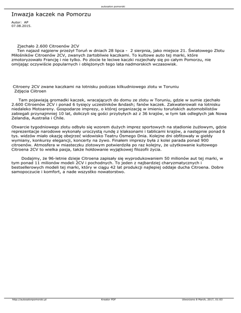autosalon pomorski Inwazja kaczek na Pomorzu Autor: AP 07.08.2015. Zjechało 2.600 Citroenów 2CV Ten najazd najpierw przeżył Toruń w dniach 28 lipca - 2 sierpnia, jako miejsce 21. Światowego Zlotu Miłośników Citroenów 2CV, zwanych żartobliwie kaczkami. To kultowe auto tej marki, które zmotoryzowało Francję i nie tylko. Po zlocie te leciwe kaczki rozjechały się po całym Pomorzu, nie omijając oczywiście popularnych i oblężonych tego lata nadmorskich wczasowisk. Citroeny 2CV zwane kaczkami na lotnisku podczas kilkudniowego zlotu w Toruniu Zdjęcia Ciitroen Tam pojawiają gromadki kaczek, wracających do domu ze zlotu w Toruniu, gdzie w sumie zjechało 2.600 Citroenów 2CV i ponad 6 tysięcy uczestników – fanów kaczek. Zakwaterowali na lotnisku niedaleko Motoareny. Gospodarze imprezy, o której organizację w imieniu toruńskich automobilistów zabiegali przynajmniej 10 lat, doliczyli się gości przybyłych aż z 36 krajów, w tym tak odległych jak Nowa Zelandia, Australia i Chile. Otwarcie tygodniowego zlotu odbyło się wzorem dużych imprez sportowych na stadionie żużlowym, gdzie reprezentacje narodowe wykonały uroczystą rundę z klaksonami i tablicami krajów, a następnie ponad 6 tys. widzów miało okazję obejrzeć widowisko Teatru Ósmego Dnia. Kolejne dni obfitowały w giełdy wymiany, konkursy elegancji, koncerty na żywo. Finałem imprezy była z kolei parada ponad 900 citroenów. Atmosfera w miasteczku zlotowym potwierdziła po raz kolejny, że użytkowanie kultowego Citroena 2CV to wielka pasja, także hołdowanie wyjątkowej filozofii życia. Dodajmy, że 96-letnie dzieje Citroena zapisały się wyprodukowaniem 50 milionów aut tej marki, w tym ponad 11 milionów modeli 2CV i pochodnych. To jeden z najbardziej charyzmatycznych i bestsellerowych modeli tej marki, który w ciągu 42 lat produkcji najlepiej oddaje ducha Citroena. Dobre samopoczucie i komfort, a nade wszystko nowatorstwo. http://autosalonpomorski.pl Kreator PDF Utworzono 8 March, 2017, 01:03