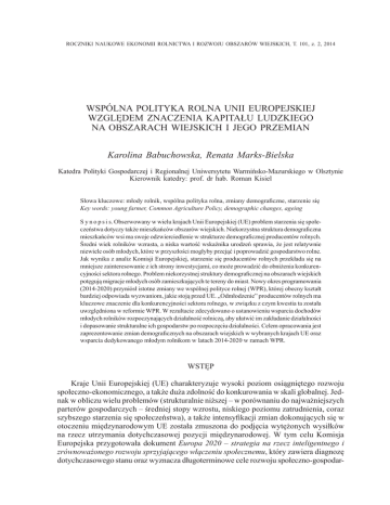 45 WSPÓLNA POLITYKA ROLNA UNII EUROPEJSKIEJ WZGLĘDEM ZNACZENIA KAPITAŁU... ROCZNIKI NAUKOWE EKONOMII ROLNICTWA I ROZWOJU OBSZARÓW WIEJSKICH, T. 101, z. 2, 2014 WSPÓLNA POLITYKA ROLNA UNII EUROPEJSKIEJ WZGLĘDEM ZNACZENIA KAPITAŁU LUDZKIEGO NA OBSZARACH WIEJSKICH I JEGO PRZEMIAN Karolina Babuchowska, Renata Marks-Bielska Katedra Polityki Gospodarczej i Regionalnej Uniwersytetu Warmińsko-Mazurskiego w Olsztynie Kierownik katedry: prof. dr hab. Roman Kisiel Słowa kluczowe: młody rolnik, wspólna polityka rolna, zmiany demograficzne, starzenie się Key words: young farmer, Common Agriculture Policy, demographic changes, ageing S y n o p s i s. Obserwowany w wielu krajach Unii Europejskiej (UE) problem starzenia się społeczeństwa dotyczy także mieszkańców obszarów wiejskich. Niekorzystna struktura demograficzna mieszkańców wsi ma swoje odzwierciedlenie w strukturze demograficznej producentów rolnych. Średni wiek rolników wzrasta, a niska wartość wskaźnika urodzeń sprawia, że jest relatywnie niewiele osób młodych, które w przyszłości mogłyby przejąć i poprowadzić gospodarstwo rolne. Jak wynika z analiz Komisji Europejskiej, starzenie się producentów rolnych przekłada się na mniejsze zainteresowanie z ich strony inwestycjami, co może prowadzić do obniżenia konkurencyjności sektora rolnego. Problem niekorzystnej struktury demograficznej na obszarach wiejskich potęgują migracje młodych osób zamieszkujących te tereny do miast. Nowy okres programowania (2014-2020) przyniósł istotne zmiany we wspólnej polityce rolnej (WPR), której obecny kształt bardziej odpowiada wyzwaniom, jakie stoją przed UE. „Odmłodzenie” producentów rolnych ma kluczowe znaczenie dla konkurencyjności sektora rolnego, w związku z czym kwestia ta została uwzględniona w reformie WPR. W rezultacie zdecydowano o ustanowieniu wsparcia dochodów młodych rolników rozpoczynających działalność rolniczą, aby ułatwić im zakładanie działalności i dopasowanie strukturalne ich gospodarstw po rozpoczęciu działalności. Celem opracowania jest zaprezentowanie zmian demograficznych na obszarach wiejskich w wybranych krajach UE oraz wsparcia dedykowanego młodym rolnikom w latach 2014-2020 w ramach WPR. WSTĘP Kraje Unii Europejskiej (UE) charakteryzuje wysoki poziom osiągniętego rozwoju społeczno-ekonomicznego, a także duża zdolność do konkurowania w skali globalnej. Jednak w obliczu wielu problemów (strukturalnie niższej – w porównaniu do najważniejszych parterów gospodarczych – średniej stopy wzrostu, niskiego poziomu zatrudnienia, coraz szybszego starzenia się społeczeństwa), a także intensyfikacji zmian dokonujących się w otoczeniu międzynarodowym UE została zmuszona do podjęcia wytężonych wysiłków na rzecz utrzymania dotychczasowej pozycji międzynarodowej. W tym celu Komisja Europejska przygotowała dokument Europa 2020 – strategia na rzecz inteligentnego i zrównoważonego rozwoju sprzyjającego włączeniu społecznemu, który zawiera diagnozę dotychczasowego stanu oraz wyznacza długoterminowe cele rozwoju społeczno-gospodar- 46 KAROLINA BABUCHOWSKA, RENATA MARKS-BIELSKA czego. U podstaw przyjętej koncepcji leżą trzy wzajemnie ze sobą powiązane priorytety: inteligentny rozwój – rozwój gospodarki opartej na wiedzy i innowacji; zrównoważony rozwój – wspieranie gospodarki efektywnie korzystającej z zasobów, bardziej przyjaznej środowisku i bardziej konkurencyjnej; rozwój sprzyjający włączeniu społecznemu – wspieranie gospodarki charakteryzującej się wysokim poziomem zatrudnienia i zapewniającej spójność gospodarczą, społeczną i terytorialną [Komunikat Komisji… 2010, s. 8, 11-12]. Powodzenie realizacji przyjętych priorytetów będzie zależało nie tylko od polityki prowadzonej na poziomie UE, ale przede wszystkim od polityk na poziomie krajów członkowskich. Ważnym elementem, a jednocześnie siłą napędową realizowanych działań jest człowiek. Od jego aktywności, zaangażowania, kreatywności zależy powodzenie przyjętej strategii. Z drugiej strony trzeba zauważyć, że większość priorytetów strategii Europa 2020 bezpośrednio dotyczy jej mieszkańców. Również z nimi związany jest jeden z najważniejszych problemów, z którymi musi się zmierzyć UE – problem starzenia się społeczeństwa. Według statystyk w 2060 r. udział osób powyżej 65. roku życia wyniesie 29,5%. Szczególnie intensywny przyrost liczby osób starszych odnotowuje się na obszarach wiejskich. W rozpoczętej perspektywie finansowej na lata 2014-2020 przyjęto, że europejska polityka spójności będzie realizowana w zgodzie z założeniami strategii Europa 2020. Oznacza to równoczesną koordynację i harmonizację wdrażania funduszy europejskich z przyjętą strategią, kwestia ta dotyczy także wdrażania funduszy rolnych [Rozporządzenie Parlamentu Europejskiego i Rady (UE) nr 1303/2013]. Celem opracowania jest zaprezentowanie zmian demograficznych na obszarach wiejskich w wybranych krajach UE oraz wsparcia dedykowanego młodym rolnikom w latach 2014-2020 w ramach wspólnej polityki rolnej (WPR). W rozważaniach posłużono się danymi statystycznymi publikowanymi przez Eurostat. Do analizy danych wykorzystano proste metody statystyczne. Dokonano również krytycznego przeglądu literatury krajowej i zagranicznej w zakresie podjętego tematu oraz przeanalizowano akty prawne UE regulujące kwestie WPR w latach 2014-2020, w szczególności treści związane ze wsparciem młodych rolników. ROLA I ZNACZENIE KAPITAŁU LUDZKIEGO W ROZWOJU SPOŁECZNOEKONOMICZNYM OBSZARÓW WIEJSKICH Rozwój społeczno-gospodarczy jest procesem obejmującym całokształt zmian jakościowych i ilościowych, którym podlega gospodarka, będących wynikiem wzrostu gospodarczego [Korenik 2011, s. 71]. Podejmując próbę odniesienia przytoczonej definicji do rozwoju społeczno-gospodarczego obszarów wiejskich, Monika Stanny