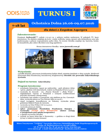 TURNUS I 7-18 lat Ochotnica Dolna 26.06-09.07.2016 dla dzieci z Zespołem Aspergera Zakwaterowanie: Pensjonat Jurkowski***, pokoje 2-3-4-5 os. z pełnym węzłem sanitarnym. W pokojach TV, łącze internetowe. Na obiekcie znajdują się m.in.: winda, stołówka, sauna, jacuzzi, sala dyskotekowa oraz sala konferencyjna z pełnym wyposażeniem audio-video. Na terenie Ośrodka znajduje się: bacówka, boisko do koszykówki, plac zabaw dla dzieci oraz krąg ogniskowy. Strona internetowa Ośrodka: www.jurowski.com.pl Wyżywienie: 3 posiłki dziennie, pierwszym świadczeniem będzie obiad, ostatnim śniadanie w dniu wyjazdu. Możliwość stosowania diety bezmlecznej, bezcukrowej, bezglutenowej. Ośrodek nie prowadzi indywidualnego żywienia. Dojazd na turnus: indywidualny Program turystyczny: • zwiedzanie Szczawnicy: spacer po uzdrowisku - park zdrojowy dolny i górny, pijalnia wód mineralnych, wejście na Bryjarkę (679 m n.p.m.), • wycieczka do Jaworek - rez. „Wąwóz Homole” i „Biała Woda” najpiękniejsze wąwozy w Pieninach z cennymi osobliwościami przyrody ożywionej i nieożywionej, • zwiedzanie ruin zamku w Czorsztynie, rejs statkiem po Jez. Czorsztyńskim, wycieczka piesza na Trzy Korony (982 m n.p.m.), • wjazd wyciągiem krzesełkowym na Palenicę, wycieczka piesza grzbietem Małych Pienin do Jaworek, • wycieczka na Górę Wdżar (767 m n.p.m.), • wycieczka piesza po okolicy, • spływ pontonami Pienińskim Przełomem Dunajca wycieczka TYLKO DLA RODZICÓW (dzieci zostają w pensjonacie pod opieką terapeutów) • 2 ogniska na terenie Ośrodka, • wyjazdy na basen Solar-Spa w Szczawnicy - 1 godzina co drugi dzień (5 razy w trakcie trwania turnusu) Biuro Turystyczne "TAIRON" Turystyka Aktywna i Rehabilitacja Osób Niepełnosprawnych Turka, ul. Berberysowa 2/2, 20-258 Lublin, tel. 81 476 15 04, fax. 81 46 43 431, kom. 609 699 345 www.tairon.pl e-mail: [email protected] facebook.com/b.t.tairon Program terapeutyczny turnusu: Zajęcia prowadzą terapeuci z Ośrodka Diagnoz i Szkoleń Psychologicznych ODIS z Warszawy - grupa 7-8os. w wieku 7-9 lat: • • • • • 60 minut dziennie Trening Umiejętności Społecznych 60 minut dziennie Praca na emocjach: Wprowadzenie do Teorii Umysłu Steermana (poziom: I-III) 60 minut dziennie Grupowa terapia psychologiczno-pedagogiczna: Bajkoterapia 60 minut dziennie Metoda Ruchu Rozwijającego Weroniki Sherborne 60 minut co drugi dzień Rozwój 20 kluczowych umiejętności społecznych wg programu Skillstreaming A. Goldsteina - grupa 7-8os. w wieku 10-12 lat: • 60 minut dziennie Trening Umiejętności Społecznych • 60 minut dziennie Praca na emocjach: Rozwinięcie Teorii Umysłu Steermana (poziom: IV-V ) • 60 minut dziennie Grupowa terapia psychologiczno-pedagogiczna: Artterapia • 60 minut dziennie Metoda Ruchu Rozwijającego Weroniki Sherborne • 60 minut co drugi dzień Rozwój 20 kluczowych umiejętności społecznych wg programu Skillstreaming A. Goldsteina - grupa 7-8os. w wieku 13-15 lat: • 60 minut dziennie Trening Umiejętności Społecznych • 60 minut dziennie Praca na emocjach: Trening Kontroli Zachowań Impulsywnych z elementami Teorii Umysłu Steermana • 60 minut dziennie Grupowa terapia psychologiczna: Psychorysunek i Muzykoterapia • 60 minut dziennie Trening Efektywnej Komunikacji w grupie rówieśniczej z elementami dramy • 60 minut co drugi dzień Rozwój 20 kluczowych umiejętności społecznych wg programu Skillstreaming A. Goldsteina - grupa 7-8os. w wieku 16-18 lat: • 60 minut dziennie Trening Umiejętności Społecznych • 60 minut dziennie Praca na emocjach: Trening Emocji & Komunikacji z elementami Treningu Asertywności • 60 minut dziennie Grupowa terapia psychologiczna: Psychorysunek i Muzykoterapia • 60 minut dziennie Trening Umiejętności Psycho-Społecznych + analiza psychologiczna przyszłej ścieżki zawodowej • 60 minut co drugi dzień Rozwój 20 kluczowych umiejętności społecznych wg programu Skillstreaming A. Goldsteina Zajęcia odbywają się od poniedziałku do piątku (10 dni na turnusie). Wszystkie zajęcia na turnusie są zajęciami grupowymi. - warsztaty psychoedukacyjne dla rodziców - 2 godz. x 5 dni (łącznie 10 godz. na turnusie). Warsztaty odbywają się w czasie zajęć terapeutycznych dla dzieci. Turnus dla 28 dzieci objętych terapią + opiekunowie Cena turnusu: Biuro Turystyczne "TAIRON" Turystyka Aktywna i Rehabilitacja Osób Niepełnosprawnych Turka, ul. Berberysowa 2/2, 20-258 Lublin, tel. 81 476 15 04, fax. 81 46 43 431, kom. 609 699 345 www.tairon.pl e-mail: [email protected] facebook.com/b.t.tairon Niniejsza propozycja nie stanowi oferty w rozumieniu przepisów Kodeksu Cywilnego.