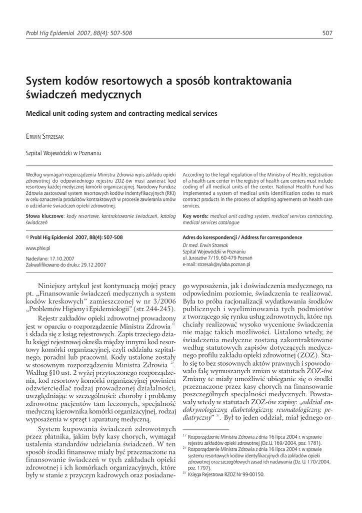 Strzesak Probl HigE.Epidemiol System kodów 2007, 88(4): resortowych 507-508 a sposób kontraktowania wiadczeñ medycznych 507 System kodów resortowych a sposób kontraktowania wiadczeñ medycznych Medical unit coding system and contracting medical services ERWIN STRZESAK Szpital Wojewódzki w Poznaniu Wed³ug wymagañ rozporz¹dzenia Ministra Zdrowia wpis zak³adu opieki zdrowotnej do odpowiedniego rejestru ZOZ-ów musi zawieraæ kod resortowy ka¿dej medycznej komórki organizacyjnej. Narodowy Fundusz Zdrowia zastosowa³ system resortowych kodów indentyfikacyjnych (RKI) w celu oznaczenia produktów kontraktowych w procesie zawierania umów o udzielanie wiadczeñ opieki zdrowotnej. According to the legal regulation of the Ministry of Health, registration of a health care center in the registry of health care centers must include coding of all medical units of the center. National Health Fund has implemented a system of medical units identification codes to mark contract products in the process of adopting agreements on health care services. S³owa kluczowe: kody resortowe, kontraktowanie wiadczeñ, katalog wiadczeñ Key words: medical unit coding system, medical services contracting, medical services catalogue © Probl Hig Epidemiol 2007, 88(4): 507-508 Adres do korespondencji / Address for correspondence www.phie.pl Nades³ano: 17.10.2007 Zakwalifikowano do druku: 29.12.2007 Niniejszy artyku³ jest kontynuacj¹ mojej pracy pt. Finansowanie wiadczeñ medycznych a system kodów kreskowych zamieszczonej w nr 3/2006 Problemów Higieny i Epidemiologii (str. 244-245). Rejestr zak³adów opieki zdrowotnej prowadzony 1/ jest w oparciu o rozporz¹dzenie Ministra Zdrowia i sk³ada siê z ksi¹g rejestrowych. Zapis trzeciego dzia³u ksiêgi rejestrowej okrela miêdzy innymi kod resortowy komórki organizacyjnej, czyli oddzia³u szpitalnego, poradni lub pracowni. Kody ustalone zosta³y 2/ w stosownym rozporz¹dzeniu Ministra Zdrowia . Wed³ug §10 ust. 2 wy¿ej przytoczonego rozporz¹dzenia, kod resortowy komórki organizacyjnej powinien odzwierciedlaæ rodzaj prowadzonej dzia³alnoci, uwzglêdniaj¹c w szczególnoci: choroby i problemy zdrowotne pacjentów tam leczonych, specjalnoæ medyczn¹ kierownika komórki organizacyjnej, rodzaj wyposa¿enia w sprzêt i aparaturê medyczn¹. System kupowania wiadczeñ zdrowotnych przez p³atnika, jakim by³y kasy chorych, wymaga³ ustalenia standardów udzielania wiadczeñ. W ten sposób rodki finansowe mia³y byæ przeznaczone na finansowanie wiadczeñ w tych zak³adach opieki zdrowotnej i ich komórkach organizacyjnych, które by³y w stanie z przyczyn kadrowych oraz posiadane- Dr med. Erwin Strzesak Szpital Wojewódzki w Poznaniu ul. Juraszów 7/19, 60-479 Poznañ e-mail: [email protected] go wyposa¿enia, jak i dowiadczenia medycznego, na odpowiednim poziomie, wiadczenia te realizowaæ. By³a to próba racjonalizacji wydatkowania rodków publicznych i wyeliminowania tych podmiotów z tworz¹cego siê rynku us³ug zdrowotnych, które np. chcia³y realizowaæ wysoko wycenione wiadczenia nie maj¹c takich mo¿liwoci. Ustalono wtedy, ¿e wiadczenia medyczne zostan¹ zakontraktowane wed³ug statutowych zapisów dotycz¹cych medycznego profilu zak³adu opieki zdrowotnej (ZOZ). Sta³o siê to bez stosownych aktów prawnych i spowodowa³o falê wymuszanych zmian w statutach ZOZ-ów. Zmiany te mia³y umo¿liwiæ ubieganie siê o rodki przeznaczone przez kasy chorych na finansowanie poszczególnych specjalnoci medycznych. Powstawa³y wtedy w statutach ZOZ-ów zapisy: oddzia³ endokrynologiczny, diabetologiczny, reumatologiczny, pe3/ diatryczny . By³ to jeden oddzia³, mia³ jednego or1/ Rozporz¹dzenie Ministra Zdrowia z dnia 16 lipca 2004 r. w sprawie rejestru zak³adów opieki zdrowotnej (Dz.U. 169/2004, poz. 1781). 2/ Rozporz¹dzenie Ministra Zdrowia z dnia 16 lipca 2004 r. w sprawie systemu resortowych kodów identyfikacyjnych dla zak³adów opieki zdrowotnej oraz szczegó³owych zasad ich nadawania (Dz. U. 170/2004, poz. 1797). 3/ Ksiêga Rejestrowa RZOZ Nr 99-00150. 508 Probl Hig Epidemiol 2007, 88(4): 507-508 Tabela I. Porównanie kodu resortowego komórki organizacyjnej z kodem produktu kontraktowego Table I. Comparison of medical unit coding with medical contract product coding system L.p. Kod resortowy komórki organizacyjnej Medical unit coding Nazwa produktu kontraktowanego Name of the medical contract product 1 4000 punkt rozliczeniowy w oddziale chorób wewnêtrznych calculation point in the internal medicine department 4.03.4000.023.02 2 4100 punkt rozliczeniowy w oddziale kardiologicznym calculation point in cardiology department 4.03.4100.023.02 3 4500 punkt rozliczeniowy w oddziale chirurgii ogólnej calculation point in the general surgery department 4.03.4500.023.02 4 4501 punkt rozliczeniowy w oddziale chirurgii dzieciêcej calculation point in the pediatric surgery department 4.03.4501.023.02 dynatora i jedna pielêgniarkê oddzia³ow¹, wy³onionych w konkursach odpowiednich izb. A propos, czy komisje konkursowe wiedzia³y, jaki bêdzie profil prowadzonej dzia³alnoci i pod tym k¹tem przeprowadza³y ocenê kandydatów? To w¹tek uboczny. Narodowy Fundusz Zdrowia prawny nastêpca kas chorych, utrzyma³ podobne zasady kontraktowania. Jednoczenie ze wzglêdu na wdra¿anie systemów informatycznych obs³uguj¹cych proces kontraktowania i rozliczania wiadczeñ medycznych, wprowadzono tzw. produkty kontraktowane. Produktom kontraktowym nadano oznaczenia kodowe. Równie¿ wprowadzenia tych zasad kontraktowania nie poprzedzi³a rzetelna analiza skutków oraz odpowiedni akt prawny. W budowie kodu produktu kontraktowanego u¿yto kodu resortowego komórki organizacyjnej zak³adu opieki zdrowotnej. Przedstawia to tabela I. 4/ Zarówno klasyfikacje medyczne (ICD10 , 5/ ICD9CM ) bêd¹ce obecnie podstaw¹ sprawozdawczoci rozliczeniowo-statystyczno-medycznej nie zosta³y utworzone w celu finansowania wiadczeñ medycznych, tak system kodów resortowych
