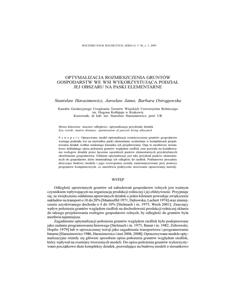 ROCZNIKI NAUKGRUNTÓW ROLNICZYCH, SERIA G, T.WE 96, WSI z. 3, WYKORZYSTUJ¥CA... 2009 OPTYMALIZACJA ROZMIESZCZENIA GOSPODARSTW 77 OPTYMALIZACJA ROZMIESZCZENIA GRUNTÓW GOSPODARSTW WE WSI WYKORZYSTUJ¥CA PODZIA£ JEJ OBSZARU NA PASKI ELEMENTARNE Stanis³aw Harasimowicz, Jaros³aw Janus, Barbara Ostr¹gowska Katedra Geodezyjnego Urz¹dzania Terenów Wiejskich Uniwersytetu Rolniczego im. Hugona Ko³³¹taja w Krakowie Kierownik: dr hab. in¿. Stanis³aw Harasimowicz, prof. UR S³owa kluczowe: macierz odleg³oci, optymalizacja przydzia³u dzia³ek Key words: matrix distance, optimization of parcels being allocated S y n o p s i s. Opracowany model optymalizacji rozmieszczenia gruntów gospodarstw wymaga podzia³u wsi na niewielkie paski elementarne wydzielane w kompleksach projektowania dzia³ek wzd³u¿ ustalonego kierunku ich projektowania. Daje to mo¿liwoæ stosunkowo dok³adnego opisu po³o¿enia gruntów wzglêdem siedlisk oraz pozwala na kszta³towanie roz³ogów dzia³ek przez ³¹czenie s¹siednich pasków elementarnych przydzielanych okrelonemu gospodarstwu. Efektem optymalizacji jest taki przydzia³ pasków elementarnych do gospodarstw, który minimalizuje ich odleg³oæ do siedlisk. Podstawowe procedury dotycz¹ce budowy modelu i jego rozwi¹zania zosta³y zautomatyzowane przy pomocy programów komputerowych, co umo¿liwia praktyczne stosowanie opracowanej metody. WSTÊP Odleg³oæ uprawianych gruntów od zabudowañ gospodarstw rolnych jest wa¿nym czynnikiem wp³ywaj¹cym na organizacjê produkcji rolniczej i jej efektywnoæ. Przyjmuje siê, ¿e zwiêkszenie oddalenia uprawianych dzia³ek o jeden kilometr powoduje zwiêkszenie nak³adów na transport o 10 do 20% [Manteuffel 1971, Dêbowska, Lachert 1974] oraz zmniejszenie uzyskiwanego dochodu o 4 do 10% [Stelmach i in. 1975, Woch 2001]. Znacz¹cy wp³yw po³o¿enia gruntów wzglêdem siedlisk na dochodowoæ produkcji rolniczej sk³ania do takiego projektowania roz³ogów gospodarstw rolnych, by odleg³oæ do gruntów by³a mo¿liwie najmniejsza. Zagadnienie optymalizacji po³o¿enia gruntów wzglêdem siedlisk by³o podejmowane jako zadanie programowania liniowego [Stelmach i in. 1975, Banat i in. 1982, ¯ebrowski, Hopfer 1979] lub w uproszczonej wersji jako zagadnienie transportowe i programowanie binarne [Harasimowicz 1986, Harasimowicz i inni 2006, 2008]. Opracowywane modele optymalizacyjne ró¿ni³y siê g³ównie sposobem opisu po³o¿enia gruntów wzglêdem siedlisk, który wp³ywa³ na rozmiary tworzonych modeli. Do opisu po³o¿enia gruntów wykorzystywano pocz¹tkowo du¿e kompleksy dzia³ek, pozwalaj¹ce na budowê modeli o stosunkowo 78 S. HARASIMOWICZ, J. JANUS, B. OSTR¥GOWSKA ma³ych rozmiarach. Kolejne modele opisywa³y bardziej szczegó³owo to po³o¿enie przy pomocy istniej¹cych dzia³ek gruntowych [Harasimowicz i in. 2006a] lub niewielkich elementów powierzchniowych [Harasimowicz 1986]. W prezentowanym modelu optymalizacji rozmieszczenia gruntów wzglêdem siedlisk do opisu po³o¿enia tych gruntów na terenie wsi wykorzystano paski elementarne o niewielkim obszarze uzyskane przez odpowiedni podzia³ kompleksów projektowania dzia³ek. Pozwoli³o to na stosunkowo dok³adny opis po³o¿enia gruntów wzglêdem siedlisk oraz da³o mo¿liwoæ kszta³towania roz³ogu dzia³ek przez ³¹czenie s¹siednich pasków elementarnych przydzielonych okrelonemu gospodarstwu. Opracowana metoda optymalizacji uk³adu gruntowego bierze pod uwagê dwa kierunki poprawy roz³ogu dzia³ek i gospodarstw: przybli¿enie gruntów do siedlisk oraz wielkoæ i kszta³t dzia³ek. Przybli¿enie gruntów do siedlisk objêto optymalizacj¹ dotycz¹c¹ minimalizacji odleg³oci dzia³ek gruntowych od zabudowañ gospodarczych. Efektem optymalizacji jest taki przydzia³ elementarnych pasków do gospodarstw, który pozwala uzyskaæ najmniejsz¹ odleg³oæ do siedlisk. Poprawny roz³óg dzia³ek uzyskiwany jest przez modyfikacjê uzyskanego rozwi¹zania optymalnego polegaj¹c¹ na grupowaniu pasków danego gospodarstwa w dzia³ki o po¿¹danej wielkoci i kszta³cie. W artykule przedstawiono jedynie zasady optymalizacji rozmieszczenia gruntów gospodarstw na przyk³adzie wsi Wojków po³o¿onej w pobli¿u Rzeszowa. MODEL OPTYMALIZACJI ROZMIESZCZENIA GRUNTÓW WE WSI Podstaw¹ opracowanego modelu optymalizacji rozmieszczenia gruntów we wsi jest podzia³ kompleksów projektowania dzia³ek na niewielkie paski elementarne. Wydzielone paski elementarne maj¹ identyczne powierzchnie lub wartoci, co umo¿liwia zapisanie modelu okrelaj¹cego zmiennoæ odleg³oci do gruntów przy pomocy zmiennych binarnych. W najprostszej postaci rozpatrywany model mo¿na zapisaæ w nastêpuj¹cy sposób: P ¦[ JS LM Q ¦[ LM M M Q Q OLF]ED JRVSRGDUVWZ L P P OLF]ED SDVNyZ HOHPHQWDUQ\FK (1) P Q ¦ ¦O LM L M L M [ LM PLQ gdzie: xij zmienna decyzyjna okrelaj¹ca przydzia³ paska elementarnego i do gospodarstwa j: xij = 1 gdy pasek elementarny nale¿y do gospodarstwa, xij = 0 gdy pasek elementarny nie nale¿y do gospodarstwa, lij odleg³oæ paska elementarnego i od siedliska gospodarstwa j okrelona dla dzia³ki, do której nale¿y rozpatrywany element, gpj powierzchnia gospodarstwa j wyra¿ona liczb¹ pasków elementarnych. Przyjêty model optymalizacji rozmieszczenia gruntów gospodarstw we wsi jest stosunkowo prosty, co daje mo¿liwoæ jego rozwi¹zania efektywnym algorytmem ograniczaj¹cym siê do analizy wymian pasków elementarnych miêdzy gospodarstwami zestawionymi w tzw. macierzy oceny przemieszczeñ [Harasimowicz 1986]. Zastosowanie tego algorytmu pozwala rozwi¹zywaæ rzeczywiste przypadki obejmuj¹ce setki tysiêcy zmiennych decyzyjnych. OPTYMALIZACJA ROZMIESZCZENIA GRUNTÓW GOSPODARSTW WE WSI WYKORZYSTUJ¥CA... 79 PRZYGOTOWANIE DANYCH WYJCIOWYCH I BUDOWA MODELU Podstawowymi danymi niezbêdnymi do wykonania optymalizacji uk³adu gruntowego jest mapa numeryczna i dane ewidencyjne. Opracowano procedury zautomatyzowanego pobierania danych z mapy numerycznej oraz opera