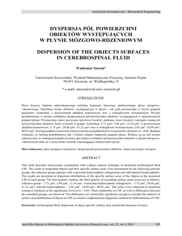 Inżynieria biomedyczna / Biomedical Engineering DYSPERSJA PÓL POWIERZCHNI OBIEKTÓW WYSTĘPUJĄCYCH W PŁYNIE MÓZGOWO-RDZENIOWYM DISPERSION OF THE OBJECTS SURFACES IN CEREBROSPINAL FLUID Waldemar Staroń* Uniwersytet Szczeciński, Wydział Matematyczno-Fizyczny, Instytut Fizyki 70-451 Szczecin, ul. Wielkopolska 15 * e-mail: [email protected] STRESZCZENIE Praca dotyczy badania mikroskopowego techniką kontrastu fazowego niebarwionego płynu mózgowo-rdzeniowego. Określano liczbę obiektów występujących w płynie i ich pola powierzchni w trzech grupach pacjentów: kontrolnej, z poszerzonym układem komorowym oraz z wodogłowiem wewnętrznym. Wyniki przedstawiono w postaci rozkładów dyspersyjnych pól powierzchni obiektów występujących w analizowanych grupach płynu. Wyznaczono miary pozycyjne (pierwszy kwartyl, mediana, trzeci kwartyl,) szeregów rosnących pól powierzchni obiektów, które wynosiły w grupie: kontrolnej: 2,71 m2, 5,48 m2, 12,16 m2; w poszerzonym układem komorowym: 3,73 m2, 29,68 m2, 41,32 m2 oraz w wodogłowiu wewnętrznym: 3,45 m2, 18,89 m2, 40,92 m2. Szeregi poddano testowaniu statystycznemu na podobieństwo na poziomie istotności = 0,05. Badania wykazały, że istnieją podobieństwa, jak i różnice między badanymi grupami płynu. Różnice są na tyle istotne statystycznie, że istnieją przesłanki ku temu, aby analiza rozkładów pól powierzchni obiektów w płynie mózgowo-rdzeniowym stała się w przyszłości metodą wspomagającą różnicowanie płynu. Słowa kluczowe: płyn mózgowo-rdzeniowy, dyspersja pól powierzchni obiektów, miary pozycyjne szeregów ABSTRACT This work describes microscopic examination with a phase contrast technique of unstained cerebrospinal fluid CSF. The count of suspended objects and their specific surface areas were determined for the following patients groups: the reference group, patients with ventricular hydrocephalic enlargement and with internal hydrocephalus. The results are presented as dispersion distributions of the specific surface areas of the objects in the unstained CSF of each group. The first quartile, median, the third quartile of ascending surface areas series are as follows: reference group – 2.71 m2, 5.48 m2, 12.16 m2; ventricular hydrocephalic enlargement – 3.73 m2, 29.68 m2, 41.32 m2; internal hydrocephalus – 3.45 m2, 18.89 m2, 40.92 m2. The series were subjected to statistical testing of similarity at the significance level of = 0.05. There similarities in CSF, as well as differences between the examined groups, are observed. The differences are statistically significant enough to consider the analysis of surface area distribution of objects in CSF as a future complementary diagnostic method for differentiation of CSF. Keywords: cerebrospinal fluid, dispersion of object specific surface area, positional measures of series Acta Bio-Optica et Informatica Medica Inżynieria Biomedyczna, vol. 21, nr 4, 2015 185 Inżynieria biomedyczna / Biomedical Engineering 1. Wstęp Pierwsze wzmianki dotyczące płynu znajdującego się w ludzkiej czaszce, otaczającego mózg, pochodzą z roku 3000 przed nasza erą z Egiptu [1]. Jednakże historycy medycyny przyjmują, że rokiem odkrycia płynu mózgowo-rdzeniowego jest rok 1764, kiedy to Domenico Cotugno (włoski lekarz) podczas sekcji zwłok zaobserwował płyn otaczający mózg i rdzeń kręgowy [2]. Nazwę dla zaobserwowanego przez Cotugno płynu wprowadził w pierwszej połowie XIX wieku François Magendie, nadając mu nazwę: płyn mózgowo-rdzeniowy. Badania płynu w kolejnych latach XIX wieku pozwoliły uzyskać informacje na temat roli i powstawania płynu mózgowo-rdzeniowego w organizmie człowieka. Wiek XX przynosi uzupełnienie i poszerzenie wiadomości dotyczących płynu. Obecnie przyjmuje się, że płyn wytwarzany jest przez sploty naczyniówkowe mózgu (p. rys. 1), które wytwarzają go z osocza krwi, oraz przez wyściółkę układu komorowego [3, 4, 5]. Rys. 1. Fragment splotu naczyniówkowego 1 – nabłonek; 2 – płyn mózgowo-rdzeniowy; 3 – drobne naczynia krwionośne (rysunek zmodyfikowany na podstawie [6]) Dobowa produkcja płynu wynosi około 500–600 ml [7, 8, 9]. Jednakże jednorazowo w przestrzeniach ciała może znajdować się około 100–200 ml. Istnieje więc nadprodukcja płynu, która wymusza jego krążenie[10, 11]. Przepływa on z komór bocznych do trzeciej, dalej przez wodociąg mózgu do czwartej komory, z której przez dwa boczne otwory (Luschki) i środkowy (Magendiego) wypływa na zewnątrz mózgowia i opływa rdzeń kręgowy, kierując się do przestrzeni podpajęczynówkowej mózgu, gdzie przedostaje się do krwioobiegu. Ze względu na przemieszczanie się płynu mózgowo-rdzeniowego w organizmie pełni on trzy funkcje: ochronną, transportową i wydalniczą [5, 12]. Jeżeli jedna z tych funkcji zostanie zachwiana, może to prowadzić do różnorakich schorzeń. Przebieg procesów związanych z krążeniem oraz wchłanianiem płynu mózgowo-rdzeniowego zależy od właściwości płynu. Skład płynu ma wpływ na jego właściwości. Dlatego w trakcie standardowych badań płynu określa się wartości podstawowych parametrów, takich jak: barwa/mętność, stężenie chlorków, stężenie białka całkowitego i immunoglobulin, stężenie glukozy oraz liczba komórek występujących w płynie. Białka, komórki i elementy ich rozpadu zawieszone w płynie tworzą ośrodek dyspersyjny, w którym na fazę rozproszoną (złożona z wymienionych elementów) można scharakteryzować poprzez określenie parametrów geometrycznych obiektów. Jednym z parametrów charakteryzujących obiekty pod względem kształtu jest pole powierzchni obiektu. 2. Cel pracy Celem pracy było wyznaczenie wartości parametrów charakteryzujących szeregi pól powierzchni obiektów występujących w płynie mózgowo-rdzeniowym, w grupie kontrolnej i płynie pochodzącym od pacjentów z rozpoznanym poszerzonym układem komorowym lub 