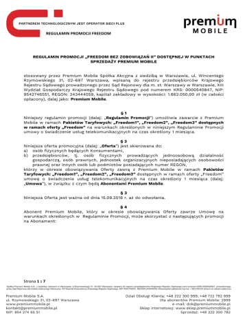 REGULAMINPROMOCJIFREEDOM REGULAMIN PROMOCJI „FREEDOM BEZ ZOBOWIĄZAŃ II” DOSTĘPNEJ W PUNKTACH SPRZEDAŻY PREMIUM MOBILE stosowany przez Premium Mobile Spółka Akcyjna z siedzibą w Warszawie, ul. Wincentego Rzymowskiego 31, 02-697 Warszawa, wpisaną do rejestru przedsiębiorców Krajowego Rejestru Sądowego prowadzonego przez Sąd Rejonowy dla m. st. Warszawy w Warszawie, XIII Wydział Gospodarczy Krajowego Rejestru Sądowego pod numerem KRS: 0000540847, NIP: 9542746551, REGON: 243444059, kapitał zakładowy w wysokości: 1.662.050,00 zł (w całości opłacony), dalej jako: Premium Mobile. §1 Niniejszy regulamin promocji (dalej: „Regulamin Promocji”) umożliwia zawarcie z Premium Mobile w ramach Pakietów Taryfowych: „Freedom1”, „Freedom2”, „Freedom3” dostępnych w ramach oferty „Freedom” na warunkach określonych w niniejszym Regulaminie Promocji umowy o świadczenie usług telekomunikacyjnych na czas określony 1 miesiąca. §2 Niniejsza oferta promocyjna (dalej: „Oferta”) jest skierowana do: a) osób fizycznych będących Konsumentami, b) przedsiębiorców, tj. osób fizycznych prowadzących jednoosobową działalność gospodarczą, osób prawnych, jednostek organizacyjnych nieposiadających osobowości prawnej oraz innych osób lub podmiotów posiadających numer REGON, którzy w okresie obowiązywania Oferty zawrą z Premium Mobile w ramach Pakietów Taryfowych: „Freedom1”, „Freedom2”, „Freedom3” dostępnych w ramach oferty „Freedom” umowę o świadczenie usług telekomunikacyjnych na czas określony 1 miesiąca (dalej: „Umowa”), w związku z czym będą Abonentami Premium Mobile. §3 Niniejsza Oferta jest ważna od dnia 15.09.2016 r. aż do odwołania. §4 Abonent Premium Mobile, który w okresie obowiązywania Oferty zawrze Umowę na warunkach określonych w Regulaminie Promocji, może skorzystać z następujących promocji na Abonament: Strona1z7 REGULAMINPROMOCJIFREEDOM Tabela 1. Wysokość Abonamentu w Ofercie Promocyjnej „FREEDOM BEZ ZOBOWIĄZAŃ II” przy Umowie na czas określony 1 miesiąca: 1 Rabat podstawowy na Abonament w wysokości miesięcznej 2 Opust za E-Rachunek i terminowe płatności 3 Opust za zgody marketingowe 4 Wysokość Abonamentu po uwzględnieniu opustu za E-Rachunek i terminowe płatności, opustu za zgody marketingowe oraz rabatu podstawowego na Abonament (dla Abonentów z aktywną Usługą E-Rachunek , a także Abonentów, którzy posiadają aktywne zgody marketingowe) 5 Wysokość Abonamentu po uwzględnieniu rabatu podstawowego na Abonament (dla Abonentów bez aktywnej Usługi E-Rachunek lub w przypadku braku terminowych płatności należności wynikających z Rachunku Telefonicznego oraz tych którzy nie posiadają aktywnych zgód marketingowych) 1. Freedom1 Freedom2 Freedom3 115,40 zł 135,20 zł 154,80 zł 6,15 zł 6,15 zł 6,15 zł 6,15 zł 6,15 zł 6,15 zł 19,90 zł 24,70 zł 29,70 zł 32,20 zł 37,00 zł 42,00 zł §5 Usługi składające się na promocyjne Pakiety Taryfowe w ramach niniejszej Oferty przedstawia tabela nr 2 poniżej: Tabela 2. Promocyjny Pakiet Taryfowy Freedom1 Freedom2 Freedom3 Liczba minut połączeń głosowych do Bez Bez Bez mobilnych abonentów i użytkowników ograniczeń w ograniczeń w ograniczeń w Premium Mobile, Polkomtel Sp. z o.o., ramach ramach ramach Orange Polska S.A., T-Mobile Polska S.A., Abonamentu Abonamentu Abonamentu Cyfrowego Polsatu S.A., P4 Sp. z o.o., oraz do wszystkich innych abonentów i użytkowników dostawców usług świadczących usługi telekomunikacyjne z wykorzystaniem sieci ww. operatorów jak również do abonentów i użytkowników nie wymienionych powyżej operatorów krajowych komórkowych sieci telekomunikacyjnych (naliczanie sekundowe). Strona2z7 REGULAMINPROMOCJIFREEDOM Liczba SMS do abonentów i użytkowników krajowych telekomunikacyjnych sieci komórkowych Cena za MMS do abonentów i użytkowników krajowych telekomunikacyjnych sieci komórkowych oraz na adresy poczty elektronicznej Cena za minutę połączenia do wszystkich krajowych telekomunikacyjnych sieci stacjonarnych (naliczanie sekundowe) Promocyjny podstawowy pakiet transmisji danych Pakietowa transmisja danych w ramach ograniczonej prędkości po wykorzystaniu podstawowego pakietu transmisji danych Dodatkowy pakiet transmisji danych o wielkości 1 GB Dodatkowy pakiet transmisji danych o wielkości 3 GB 2. 3. 4. 5. 6. 7. 8. Bez Bez Bez ograniczeń w ograniczeń w ograniczeń w ramach ramach ramach Abonamentu Abonamentu Abonamentu 0,29 zł Bezpłatne Bezpłatne 0,29 zł Bezpłatne Bezpłatne 5 GB miesięcznie w ramach Abonamentu w ramach Abonamentu 5 GB miesięcznie w ramach Abonamentu w ramach Abonamentu 10 GB miesięcznie w ramach Abonamentu w ramach Abonamentu 2,50 zł 6,00 zł Abonent może korzystać z usług określonych w Cenniku oferty „Freedom” dla wybranego Pakietu Taryfowego na zasadach w nim określonych w zakresie nieuregulowanym w niniejszym Regulaminie Promocji. Ilekroć w niniejszym Regulaminie usługa jest dostępna bez ograniczeń, Abonent może korzystać z takiej usługi w ramach Abonamentu na warunkach określonych w Umowie, Cenniku i Regulaminie. Wszelkie usługi znajdujące się powyżej w tabeli nie dotyczą krajowych numerów specjalnych, usług o podwyższonej opłacie, infolinii, usług międzynarodowych oraz usług w Roamingu Międzynarodowym oraz innych opłat niewskazanych wyraźnie w Regulaminie Promocji. Opłaty nieokreślone w Regulaminie Promocji naliczane są zgodnie z Cennikiem oferty „Freedom” dla wybranego Pakietu Taryfowego. Promocji określonych w Regulaminie Promocji nie można łączyć z innymi promocjami określonymi w innych regulaminach promocji lub warunkach takich promocji stosowanych przez Premium Mobile, chyba, że takie regulaminy lub warunki promocji wyraźnie stanowią inaczej. Kwoty wskazane w Regulaminie Promocji są kwotami wyrażonymi w złotych polskich i są powiększone o wysokość należnego podat