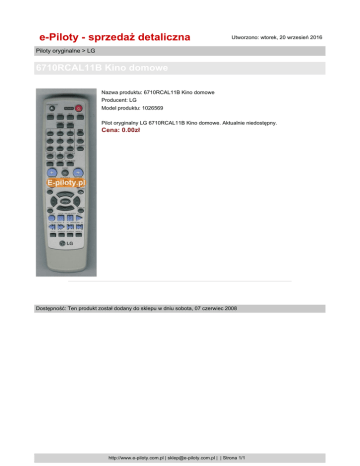 e-Piloty - sprzedaż detaliczna Utworzono: wtorek, 20 wrzesień 2016 Piloty oryginalne > LG 6710RCAL11B Kino domowe Nazwa produktu: 6710RCAL11B Kino domowe Producent: LG Model produktu: 1026569 Pilot oryginalny LG 6710RCAL11B Kino domowe. Aktualnie niedostępny. Cena: 0.00zł Dostępność: Ten produkt został dodany do sklepu w dniu sobota, 07 czerwiec 2008 http://www.e-piloty.com.pl | [email protected] | | Strona 1/1