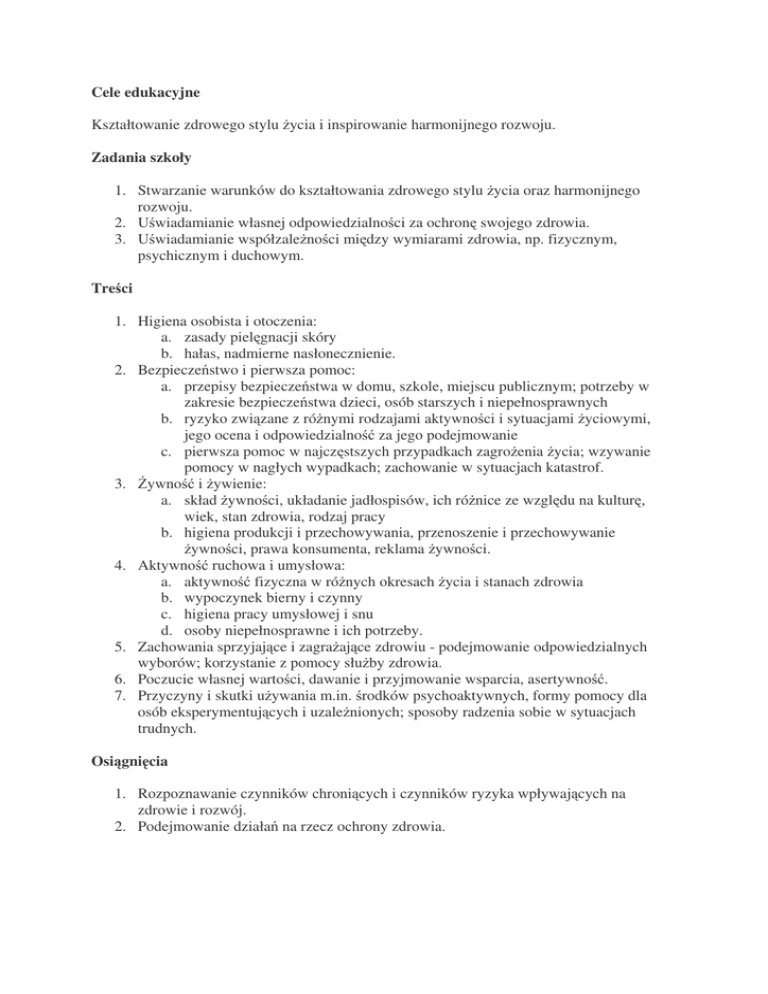 Cele edukacyjne Kształtowanie zdrowego stylu ycia i inspirowanie harmonijnego rozwoju. Zadania szkoły 1. Stwarzanie warunków do kształtowania zdrowego stylu ycia oraz harmonijnego rozwoju. 2. U wiadamianie własnej odpowiedzialno ci za ochron swojego zdrowia. 3. U wiadamianie współzale no ci mi dzy wymiarami zdrowia, np. fizycznym, psychicznym i duchowym. Tre ci 1. Higiena osobista i otoczenia: a. zasady piel gnacji skóry b. hałas, nadmierne nasłonecznienie. 2. Bezpiecze stwo i pierwsza pomoc: a. przepisy bezpiecze stwa w domu, szkole, miejscu publicznym; potrzeby w zakresie bezpiecze stwa dzieci, osób starszych i niepełnosprawnych b. ryzyko zwi zane z ró nymi rodzajami aktywno ci i sytuacjami yciowymi, jego ocena i odpowiedzialno za jego podejmowanie c. pierwsza pomoc w najcz stszych przypadkach zagro enia ycia; wzywanie pomocy w nagłych wypadkach; zachowanie w sytuacjach katastrof. 3. ywno i ywienie: a. skład ywno ci, układanie jadłospisów, ich ró nice ze wzgl du na kultur , wiek, stan zdrowia, rodzaj pracy b. higiena produkcji i przechowywania, przenoszenie i przechowywanie ywno ci, prawa konsumenta, reklama ywno ci. 4. Aktywno ruchowa i umysłowa: a. aktywno fizyczna w ró nych okresach ycia i stanach zdrowia b. wypoczynek bierny i czynny c. higiena pracy umysłowej i snu d. osoby niepełnosprawne i ich potrzeby. 5. Zachowania sprzyjaj ce i zagra aj ce zdrowiu - podejmowanie odpowiedzialnych wyborów; korzystanie z pomocy słu by zdrowia. 6. Poczucie własnej warto ci, dawanie i przyjmowanie wsparcia, asertywno . 7. Przyczyny i skutki u ywania m.in. rodków psychoaktywnych, formy pomocy dla osób eksperymentuj cych i uzale nionych; sposoby radzenia sobie w sytuacjach trudnych. Osi gni cia 1. Rozpoznawanie czynników chroni cych i czynników ryzyka wpływaj cych na zdrowie i rozwój. 2. Podejmowanie działa na rzecz ochrony zdrowia.