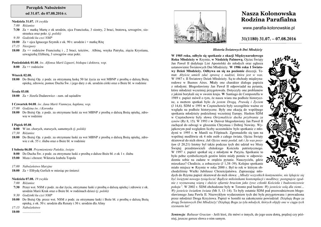 Porządek Nabożeństw od 31.07. do 07.08.2016 r. Niedziela 31.07. 18 zwykła 7:00 Różaniec 7:30 Za + matkę Martę z ok urodzin, ojca Franciszka, 3 siostry, 2 braci, bratową, szwagrów, siostrzeńca oraz pokr. (j. polski) 9:30 Godzinki ku czci NMP 10:00 Za + ojca Ignacego Szymik z ok. 90 r. urodzin i + matkę Ritę 17:15 Nieszpory 18:00 Za ++ rodziców Franciszkę i , 2 braci, teściów, Albinę, wnyka Patryka, zięcia Krystiana, szwagierkę Elżbietę, 3 szwagrów oraz pokr. Poniedziałek 01.08. św. Alfonsa Marii Liguori, biskupa i doktora, wsp. 8:00 Za ++ rodziców Wtorek 02.08. 18:00 Do Bożej Op. z podz. za otrzymaną łaskę 50 lat życia za wst MBNP z prośbą o dalszą Bożą opiekę, zdrowie, pomoc Ducha Św. i jego dary z ok. urodzin córki oraz o Boże bł. w rodzinie Środa 03.08. 18:00 Za + Józefa Dudarewicz - zam. od sąsiadów I Czwartek 04.08. św. Jana Marii Vianneya, kapłana, wsp. 17:00 Godzina św. i Koronka 18:00 Do Bożej Op. z podz. za otrzymane łaski za wst MBNP z prośbą o dalszą Bożą opiekę, zdrowie w rodzinie I Piątek 05.08. 8:00 W int. chorych, starszych, samotnych (j. polski) 17:30 Różaniec 18:00 Do Bożej Op. z podz. za otrzymane łaski za wst MBNP z prośbą o dalszą Bożą opiekę, zdrowie z ok. 55 r. ślubu oraz o Boże bł. w rodzinie I Sobota 06.08. Przemienienie Pańskie, święto 8:00 Do Ducha Św. z podz. za otrzymane łaski z prośbą o dalsze Boże bł. z ok 1 r. ślubu 15:00 Msza i chrzest: Wiktoria Izabela Topola ——–—–——–—–—————————–—————–——————— 17:00 Nabożeństwo Maryjne 18:00 Za + Elfrydę Gerlich w miesiąc po śmierci Niedziela 07.08. 19 zwykła 7:00 Różaniec 7:30 Przez wst. NSM z podz. za dar życia, otrzymane łaski z prośbą o dalszą opiekę i zdrowie z ok. urodzin Marii Kruk oraz o Boże bł. w rodzinach dzieci (j. polski) 9:30 Godzinki ku czci NMP 10:00 Do Bożej Op. przez wst. NSM z podz. za otrzymane łaski i Boże bł. z prośbą o dalszą Bożą opiekę, z ok. 50 r. urodzin dla Renaty i 30 r. urodzin dla Aliny 17:15 Nabożeństwo 18:00 …………….. Nasza Kolonowska Rodzina Parafialna www.parafia-kolonowskie.pl 31(1180) 31.07. – 07.08.2016 Historia Światowych Dni Młodzieży W 1985 roku, odbyło się spotkanie z okazji Międzynarodowego Roku Młodzieży w Rzymie, w Niedzielę Palmową. Ojciec Święty Jan Paweł II dedykuje List Apostolski do młodych oraz ogłasza ustanowienie Światowych Dni Młodzieży. W 1986 roku I Światowy Dzień Młodzieży. Odbywa on się na poziomie diecezji. Temat: Abyście umieli zdać sprawę z nadziei, która jest w was. W 1987 r. II Światowy Dzień Młodzieży. Są to obchody międzynarodowe w Buenos Aires. Miały one charakter dialogu papieża z młodymi. Błogosławiony Jan Paweł II odpowiadał na pytania, które młodzież wcześniej przygotowała. Dotyczyły one problemów z jakimi borykali się w swoim kraju. W Santiago de Compostella w 1989 r. papież mówił o tym, że nasza wiara ma podłoże historyczne, a mottem spotkań było Ja jestem Drogą, Prawdą i Życiem (J 14,6). ŚDM w 1991 w Częstochowie były szczególnie ważne ze względu na podłoże historyczne. Były one okazją do wspólnego spotkania młodzieży podzielonej wcześniej Europy. Hasłem ŚDM w Częstochowie były słowa Otrzymaliście ducha przybrania za synów (Rz 8, 15). W 1993 r w Denver błogosławiony Jan Paweł II zachęcał do odwagi w głoszeniu Chrystusa i Dobrej Nowiny. Wyjątkowym pod względem liczby uczestników było spotkanie z młodymi w 1995 r. w Manili na Filipinach. Zgromadziło się tam na wspólnej modlitwie ok 4 mln osób z całego świata. Ojciec Święty skierował do nich słowa: Jak Ojciec mnie posłał, tak i Ja was posyłam (J 20,21) Istotny był także podczas tych dni udział we Mszy Świętej przedstawicieli chińskiego Kościoła patriotycznego. W 1997 r. papież spotkał się z młodymi w Paryżu. Spotkanie to było pełne symbolicznych gestów które miały pomóc w odpowiedzeniu sobie na zadane w orędziu pytanie. Nauczycielu, gdzie mieszkasz? Chodźcie, a zobaczycie (J 1,38–39). Kolejne spotkanie miało miejsce w Rzymie w roku 2000 r. Był to rok w którym obchodziliśmy Wielki Jubileusz Chrześcijaństwa. Zapraszając młodych do Rzymu papież skierował do nich słowa: „Młodzi wszystkich kontynentów, nie lękajcie się być świętymi nowego tysiąclecia! Bądźcie miłośnikami kontemplacji i modlitwy; postępujcie zgodnie z wyznawaną wiarą i służcie ofiarnie braciom jako żywe członki Kościoła i budowniczowie pokoju”. W 2002 r. ŚDM obchodzone były w Toronto pod hasłem: Wy jesteście solą dla ziemi… Wy jesteście światłem świata (Mt 5, 13–14). To były ostatnie ŚDM pod przewodnictwem błogosławionego Jana Pawła II. Niezwykłym wydarzeniem tych dni była przygotowana i prowadzona przez młodzież Droga Krzyżowa. Papież w homilii na zakończenie powiedział: Dziękuję Bogu za drogę Światowych Dni Młodzieży! Dziękuję Bogu za tylu młodych, których objęły one w ciągu tych szesnastu lat! Sentencja: Baltasar Gracian - Jeśli ktoś, źle mówi o innych, do jego uszu dotrą, prędzej czy później, jeszcze gorsze słowa o nim samym. 31/2016 Po śmierci papieża błogosławionego Jana Pawła II obchodom ŚDM przewodniczył Ojciec Święty Benedykt XVI kontynuując tradycję międzynarodowych spotkań. Odbyły się one kolejno: w 2005 r. w Kolonii, w 2008 r. w Sydney oraz w 2011 r. w Madrycie. W Koloni mottem ŚDM były słowa: Przybyliśmy oddać Mu pokłon (Mt 2, 2) Papież mówił: Przedstawcie Chrystusowi swe radości i swe smutki, pozwalając, aby swoim światłem rozjaśnił On wasze umysły i swoją łaską dotknął waszych serc. W Sydney Benedykt XVI przypomniał o wrodzonej godności każdego ludzkiego życia, od chwili poczęcia aż do naturalnej śmierci, a także wyjaśnił sens troski o naturalne środowisko. Zachęcał do zastanowienia się nad ty