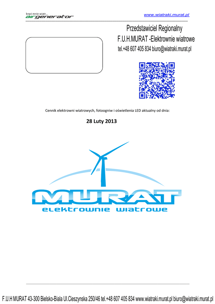 www.wiatraki.murat.pl __________________________________________________________________________________ Przedstawiciel Regionalny F.U.H.MURAT -Elektrownie wiatrowe tel.+48 607 405 834 [email protected] Cennik elektrowni wiatrowych, fotoogniw i oświetlenia LED aktualny od dnia: 28 Luty 2013 _________________________________________________________________________________________________________________ F.U.H MURAT 43-300 Bielsko-Biala Ul.Cieszynska 250/46 tel.+48 607 405 834 www.wiatraki.murat.pl [email protected] www.wiatraki.murat.pl __________________________________________________________________________________ Spis treści Elektrownia wiatrowa M300 ................................................................................................................... 3 Elektrownia wiatrowa M400 (M+) .......................................................................................................... 4 Elektrownia wiatrowa SkyWing (S-series) ............................................................................................... 5 Elektrownia wiatrowa AirGenerator (E/EW-series) ................................................................................ 6 Elektrownia wiatrowa Ventus (Y-type).................................................................................................... 7 Pionowa elektrownia wiatrowa VAWT (M-type) .................................................................................... 8 Zaawansowane elektrownie wiatrowe FD-series.................................................................................... 9 Maszty do elektrowni wiatrowych ........................................................................................................ 10 Elektronika do wiatraków i fotoogniw .................................................................................................. 11 Fotoogniwa QXPV .................................................................................................................................. 12 Oświetlenie uliczne, parkowe i ogrodowe ............................................................................................ 13 Główne atuty ulicznych lamp LED ......................................................................................................... 14 Kolektory słoneczne do grzania wody ................................................................................................... 15 Mierniki wiatru..... ................................................................................................................................. 16 _________________________________________________________________________________________________________________ F.U.H MURAT 43-300 Bielsko-Biala Ul.Cieszynska 250/46 tel.+48 607 405 834 www.wiatraki.murat.pl [email protected] www.wiatraki.murat.pl __________________________________________________________________________________ Elektrownia wiatrowa M300 Zestaw podstawowy z wbudowanym kontrolerem do ładowania akumulatora 12V/(24V) Komplet do samodzielnego montażu z przeznaczeniem do zastosowań mobilnych (jacht, kemping). Służy głównie do zasilania oświetlenia. Może być wykorzystany do zasilania oświetlenia znaków drogowych lub zasilania małych przekaźników sygnałowych. Moc znamionowa 100W, maksymalna 300W. Po prawej zestaw części montażowych: Cena zestawu: 1039 zł _________________________________________________________________________________________________________________ F.U.H MURAT 43-300 Bielsko-Biala Ul.Cieszynska 250/46 tel.+48 607 405 834 www.wiatraki.murat.pl [email protected] www.wiatraki.murat.pl __________________________________________________________________________________ Elektrownia wiatrowa M400 (M+) Zestaw podstawowy z wbudowanym kontrolerem do ładowania akumulatora 12V/(24V) Elektrownia do samodzielnego montażu na rurze ɸ58 Parametry techniczne: Może służyć do zasilania oświetlenia lub odbiorników o mocy nie przekraczającej zwykle 80W. Często we współpracy z fotoogniwami. Krzywa mocy Napięcie znamionowe(DCV) 12/24 Moc Maksymalna(W) 400 Prędkość startowa (M/S) 1.5 Prędkość przetrwania(M/S) 35 Typ generatora PMG Średnica wirnika (M) 1.5 Ilość łopat 3 Materiał łopat Kompozyt Kontroler Wbudowany Ochrona Hamulec elektromagnetyczny Planowana żywotność(lat) 15-20 Opakowanie Skrzynia ze sklejki Wymiary paczki(mm) 118*39*32 Waga brutto(kg) 22 Cena zestawu: 1399 zł _________________________________________________________________________________________________________________ F.U.H MURAT 43-300 Bielsko-Biala Ul.Cieszynska 250/46 tel.+48 607 405 834 www.wiatraki.murat.pl [email protected] www.wiatraki.murat.pl __________________________________________________________________________________ Kontroler Light Street model WWS Elektrownia wiatrowa SkyWing (EW-series) Zestaw podstawowy 24V/(48V) w komplecie z kontrolerem light street do sterownia oświetleniem. Najczęściej ten model elektrowni jest stosowany do zasilania oświetlenia ulicznego. Zwykle pracuje we współpracy z fotoogniwami. Dzięki zewnętrznemu kontrolerowi z funkcją czasowego i zmierzchowego załączania odbiorników jest najprostszym systemem do autonomicznego zasilania lamp. Czasem wykorzystywana do oświetlenia wysokich masztów. Elektrownia wiatrowa S-series występuje w wersjach o mocach: Model 400W 600W 1000W Moc znamionowa (W) 400 600 1 000 Moc maksymalna (W) 800 1000 1 600 Napięcie znamionowe (DCV) 24 24 24 Prąd znamionowy (DCA) 16 25 41 Średnica wirnika (m) 1,5 1,6 1,8 Startowa prędkość wiatru (m/s) 2,5 2,5 2,5 Znamionowa prędkość wiatru (m/s) 12 13 13 Graniczna prędkość wiatru (m/s) 45 45 45 Rodzaj generatora PMG (generator na magnesy stałe) Masa generatora (kg) 16 16,5 18 Materiał łopaty śmigła włókno węglowe Ilość łopat śmigła 3 3 3 Odchylanie do kierunku wiatru mech. Cena zestawu 400W: 2419 zł Cena zestawu 600W: 3069 zł Cena zestawu 1kW: 3959 zł __________________________