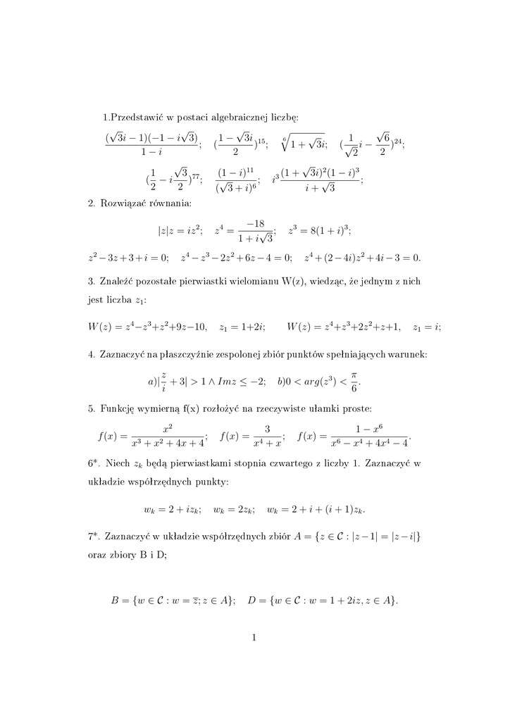 1.Przedstawi¢ w postaci algebraicznej liczb¦: 2. Rozwi¡za¢ równania