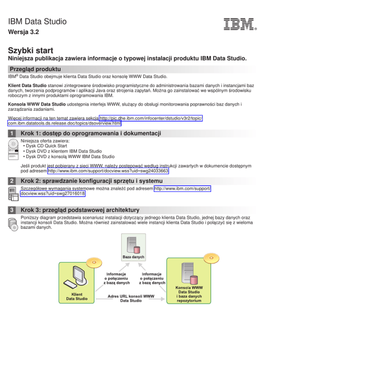 IBM Data Studio Wersja 3.2 Szybki start Niniejsza publikacja zawiera informacje o typowej instalacji produktu IBM Data Studio. Przegląd produktu IBM® Data Studio obejmuje klienta Data Studio oraz konsolę WWW Data Studio. Klient Data Studio stanowi zintegrowane środowisko programistyczne do administrowania bazami danych i instancjami baz danych, tworzenia podprogramów i aplikacji Java oraz strojenia zapytań. Można go zainstalować we wspólnym środowisku roboczym z innymi produktami oprogramowania IBM. Konsola WWW Data Studio udostępnia interfejs WWW, służący do obsługi monitorowania poprawności baz danych i zarządzania zadaniami. Więcej informacji na ten temat zawiera sekcja http://pic.dhe.ibm.com/infocenter/dstudio/v3r2/topic/ com.ibm.datatools.ds.release.doc/topics/dsoverview.html. 1 Krok 1: dostęp do oprogramowania i dokumentacji Niniejsza oferta zawiera: v Dysk CD Quick Start v Dysk DVD z klientem IBM Data Studio v Dysk DVD z konsolą WWW IBM Data Studio Jeśli produkt jest pobierany z sieci WWW, należy postępować według instrukcji zawartych w dokumencie dostępnym pod adresem http://www.ibm.com/support/docview.wss?uid=swg24033663. 2 Krok 2: sprawdzanie konfiguracji sprzętu i systemu Szczegółowe wymagania systemowe można znaleźć pod adresem http://www.ibm.com/support/ docview.wss?uid=swg27016018. 3 Krok 3: przegląd podstawowej architektury Poniższy diagram przedstawia scenariusz instalacji dotyczący jednego klienta Data Studio, jednej bazy danych oraz instancji konsoli Data Studio. Można również zainstalować wiele instancji klienta Data Studio i połączyć się z wieloma bazami danych. 4 Krok 4: instalowanie produktu IBM Data Studio 1. Otwórz starter klienta Data Studio lub konsoli WWW Data Studio. W systemie Windows uruchom plik setup.exe (jeśli jesteś użytkownikiem 64-bitowego systemu Windows 7 bez uprawnień administratora, uruchom plik setup_win7_nonadmin64.exe). W systemach Linux i UNIX uruchom plik setup. 2. Kliknij w starterze opcję Zainstaluj produkt, aby zainstalować program IBM Installation Manager. 3. Zainstaluj i zaktualizuj klienta lub konsolę WWW Data Studio za pomocą programu Installation Manager. Więcej informacji na ten temat zawiera sekcja dotycząca instalowania klienta Data Studio lub sekcja dotycząca instalowania konsoli WWW Data Studio w starterze lub w sieci WWW: v klient Data Studio: http://pic.dhe.ibm.com/infocenter/dstudio/v3r2/topic/com.ibm.datatools.base.install.doc/topics/ c_install_product.html v konsola WWW Data Studio: http://pic.dhe.ibm.com/infocenter/dstudio/v3r2/topic/ com.ibm.datatools.db.web.health.install.doc/topics/dshm_install.html 5 Krok 5: rozpoczęcie pracy z produktem 1. Skonfiguruj konsolę WWW Data Studio. Jeśli konsola nie została zainstalowana, ale użytkownik zamierza nawiązać połączenie z konsolą zainstalowaną na innym komputerze, można pominąć ten krok. a. Jeśli po zainstalowaniu konsoli WWW Data Studio nie uruchomiono Asysty podczas konfigurowania Data Studio w celu skonfigurowania konsoli, otwórz Asystę z menu Start, klikając opcję Skonfiguruj konsolę WWW Data Studio. b. Otwórz konsolę WWW w przeglądarce i zaloguj się na konto domyślnego administratora, utworzone za pomocą Asysty podczas konfigurowania Data Studio. c. Wykonaj odpowiednie zadania wprowadzające w starterze zadań, zgodnie z wymaganiami używanego środowiska. Jeśli konsola WWW ma być współużytkowana z innymi użytkownikami, wybierz bazę danych repozytorium i skonfiguruj dostęp użytkowników do tej bazy. 2. Skonfiguruj klienta Data Studio do pracy z konsolą WWW. Otwórz klienta i wybierz kolejno opcje Windows > Preferencje. Następnie wybierz kolejno opcje Zarządzanie danymi > Konsola WWW Data Studio. Podaj adres URL konsoli WWW i referencje jej użytkownika. 3. Dodaj połączenie z bazą danych. Połączenia można dodawać z dowolnego składnika. Można również importować i eksportować połączenia, aby wymieniać je między składnikami. Aby dodać połączenie z poziomu konsoli WWW, kliknij kolejno opcje Otwórz > Bazy danych. Aby dodać połączenie z poziomu klienta, kliknij przycisk Nowe połączenie z bazą danych w widoku Eksploratora administracyjnego. Konsola WWW wymaga połączenia z każdą bazą danych, która ma być monitorowana lub dla której mają być uruchamiane zadania. Klient wymaga połączenia z każdą administrowaną bazą danych oraz z każdą bazą, dla której są tworzone aplikacje. 4. W kliencie wybierz kolejno opcje Pomoc > Starter zadań, aby wyświetlić kilka najważniejszych zadań i rozpocząć pracę. 5. Jeśli planowane jest strojenie instrukcji SQL za pomocą asysty przepływu pracy narzędzia Query Tuner, skonfiguruj bazę danych lub podsystem DB2, w których są wykonywane te instrukcje. Patrz http://pic.dhe.ibm.com/infocenter/ dstudio/v3r2/topic/com.ibm.datatools.qrytune.configothers.doc/topics/configuretuning_ds.html. Więcej informacji ? Więcej informacji można znaleźć w następujących serwisach: v Wsparcie dla oprogramowania: www.ibm.com/support/entry/portal/overview/software/information_management/ ibm_data_studio v Strona produktu IBM Data Studio: http://www.ibm.com/software/data/optim/data-studio/ v Przewodnik informacyjny IBM Data Studio: http://www.ibm.com/developerworks/data/roadmaps/ roadmap_datastudio.html IBM Data Studio, wersja 3.2. Licensed Materials - Property of IBM. © Copyright IBM Corp. 2012. Użytkowników z instytucji rządowych USA obowiązują warunki umowy GSA ADP Schedule Contract z IBM Corp. IBM, logo IBM oraz ibm.com są znakami towarowymi lub zastrzeżonymi znakami towarowymi International Business Machines Corporation w Stanach Zjednoczonych i/lub w innych krajach. Powyższe nazwy oraz inne nazwy znaków towarowych IBM oznaczone zostały przy ich pierwszym wystąpieniu w tym tekście odpowiednim symbolem (® lub ™) oznaczającym, że w chwili opublikowania tej informacji znaki te były zarejestrowane w Stana