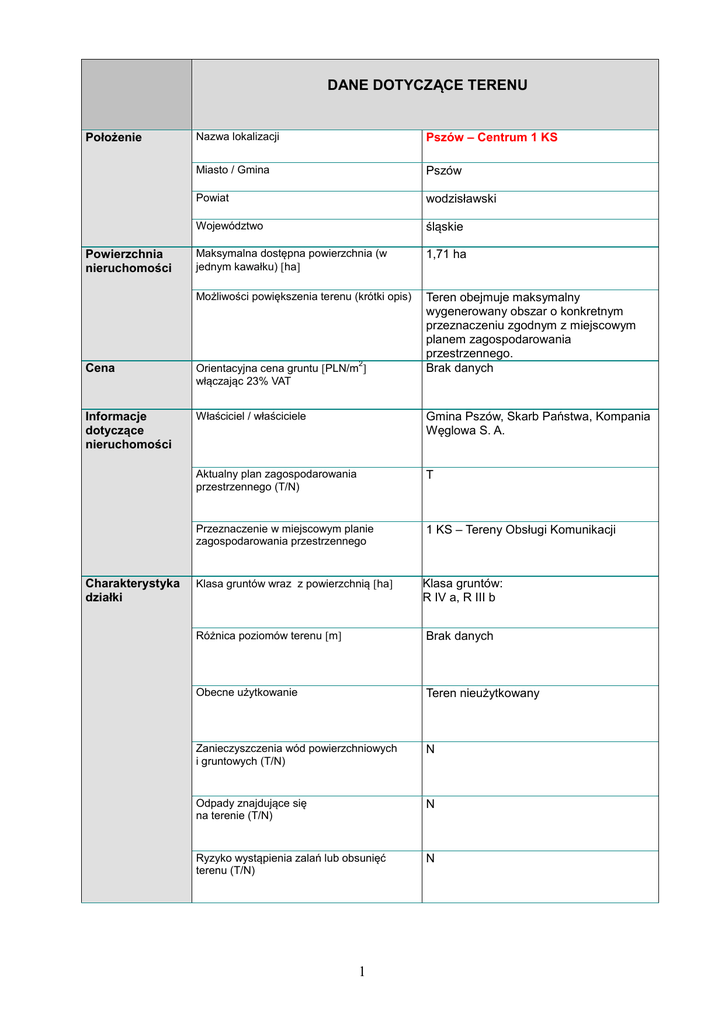 DANE DOTYCZĄCE TERENU Położenie Powierzchnia nieruchomości Nazwa lokalizacji Pszów – Centrum 1 KS Miasto / Gmina Pszów Powiat wodzisławski Województwo śląskie Maksymalna dostępna powierzchnia (w jednym kawałku) ha 1,71 ha Możliwości powiększenia terenu (krótki opis) Teren obejmuje maksymalny wygenerowany obszar o konkretnym przeznaczeniu zgodnym z miejscowym planem zagospodarowania przestrzennego. Brak danych Cena Orientacyjna cena gruntu PLN/m włączając 23% VAT Informacje dotyczące nieruchomości Właściciel / właściciele Gmina Pszów, Skarb Państwa, Kompania Węglowa S. A. Aktualny plan zagospodarowania przestrzennego (T/N) T Przeznaczenie w miejscowym planie zagospodarowania przestrzennego 1 KS – Tereny Obsługi Komunikacji Charakterystyka działki 2 Klasa gruntów wraz z powierzchnią ha Klasa gruntów: R IV a, R III b Różnica poziomów terenu m Brak danych Obecne użytkowanie Teren nieużytkowany Zanieczyszczenia wód powierzchniowych i gruntowych (T/N) N Odpady znajdujące się na terenie (T/N) N Ryzyko wystąpienia zalań lub obsunięć terenu (T/N) N 1 Połączenia transportowe Przeszkody podziemne (T/N) T Przeszkody występujące na powierzchni terenu (T/N) N Istniejące ograniczenia ekologiczne (T/N) N Budynki i zabudowania na terenie (T/N) N Droga dojazdowa do terenu (rodzaj drogi i jej szerokość) Bezpośredni dostęp do drogi powiatowej – ul. Traugutta o szer. 6m. Autostrada / droga krajowa km Pszów zlokalizowany jest w pobliżu autostrady A1 (ok. 14 km) oraz niedaleko autostrady A4. Przez teren Pszowa będzie w przyszłości przebiegać planowana Droga Główna Południowa, która obecnie jest już w fazie projektowania. Kolej km Najbliżej zlokalizowana jest kolej w Rydułtowach (ok. 5km). Bocznica kolejowa km - Najbliższe lotnisko międzynarodowe km Międzynarodowy Port Lotniczy Katowice – Pyrzowice (ok. 100 km). Najbliższe miasto wojewódzkie km Katowice (ok. 80 km) Istniejąca infrastruktura Elektryczność na terenie (T/N) T Odległość przyłącza od granicy terenu Gaz na terenie (T/N) - N Odległość przyłącza od granicy działki 2 Ok. 300 m. Woda na terenie (T/N) T Odległość przyłącza od granicy terenu Kanalizacja na terenie (T/N) - N Odległość przyłącza od granicy terenu Ok.,100 m. Odprowadzenie wód deszczowych na terenie (T/N) N Oczyszczalnia ścieków na terenie bądź w bezpośrednim sąsiedztwie N T Telefony (T/N) Odległość przyłącza od granicy terenu - Uwagi Osoby do kontaktu Imię, nazwisko, stanowisko, tel., tel. komórkowy, e-mail, znajomość języków obcych Anna Kobierska-Mróz, 32 455 88 76, [email protected], j. angielski i j. francuski 3