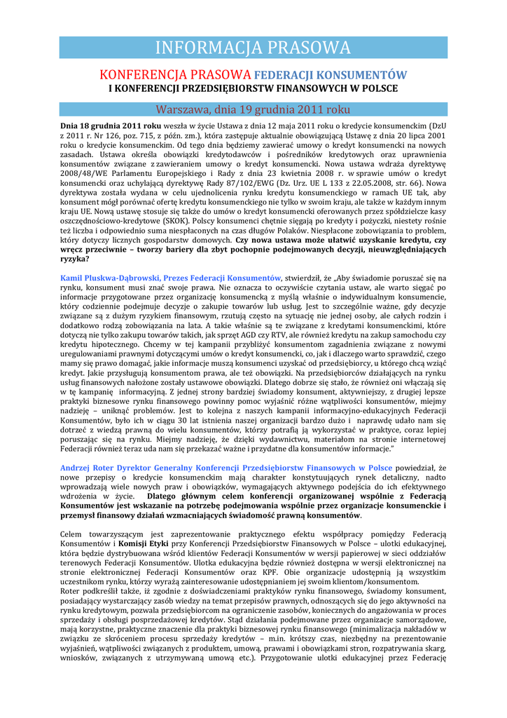 INFORMACJA PRASOWA KONFERENCJA PRASOWA FEDERACJI KONSUMENTÓW I KONFERENCJI PRZEDSIĘBIORSTW FINANSOWYCH W POLSCE Warszawa, dnia 19 grudnia 2011 roku Dnia 18 grudnia 2011 roku weszła w życie Ustawa z dnia 12 maja 2011 roku o kredycie konsumenckim (DzU z 2011 r. Nr 126, poz. 715, z późn. zm.), która zastępuje aktualnie obowiązującą Ustawę z dnia 20 lipca 2001 roku o kredycie konsumenckim. Od tego dnia będziemy zawierać umowy o kredyt konsumencki na nowych zasadach. Ustawa określa obowiązki kredytodawców i pośredników kredytowych oraz uprawnienia konsumentów związane z zawieraniem umowy o kredyt konsumencki. Nowa ustawa wdraża dyrektywę 2008/48/WE Parlamentu Europejskiego i Rady z dnia 23 kwietnia 2008 r. w sprawie umów o kredyt konsumencki oraz uchylającą dyrektywę Rady 87/102/EWG (Dz. Urz. UE L 133 z 22.05.2008, str. 66). Nowa dyrektywa została wydana w celu ujednolicenia rynku kredytu konsumenckiego w ramach UE tak, aby konsument mógł porównać ofertę kredytu konsumenckiego nie tylko w swoim kraju, ale także w każdym innym kraju UE. Nową ustawę stosuje się także do umów o kredyt konsumencki oferowanych przez spółdzielcze kasy oszczędnościowo-kredytowe (SKOK). Polscy konsumenci chętnie sięgają po kredyty i pożyczki, niestety rośnie też liczba i odpowiednio suma niespłaconych na czas długów Polaków. Niespłacone zobowiązania to problem, który dotyczy licznych gospodarstw domowych. Czy nowa ustawa może ułatwić uzyskanie kredytu, czy wręcz przeciwnie – tworzy bariery dla zbyt pochopnie podejmowanych decyzji, nieuwzględniających ryzyka? Kamil Pluskwa-Dąbrowski, Prezes Federacji Konsumentów, stwierdził, że „Aby świadomie poruszać się na rynku, konsument musi znać swoje prawa. Nie oznacza to oczywiście czytania ustaw, ale warto sięgać po informacje przygotowane przez organizację konsumencką z myślą właśnie o indywidualnym konsumencie, który codziennie podejmuje decyzje o zakupie towarów lub usług. Jest to szczególnie ważne, gdy decyzje związane są z dużym ryzykiem finansowym, rzutują często na sytuację nie jednej osoby, ale całych rodzin i dodatkowo rodzą zobowiązania na lata. A takie właśnie są te związane z kredytami konsumenckimi, które dotyczą nie tylko zakupu towarów takich, jak sprzęt AGD czy RTV, ale również kredytu na zakup samochodu czy kredytu hipotecznego. Chcemy w tej kampanii przybliżyć konsumentom zagadnienia związane z nowymi uregulowaniami prawnymi dotyczącymi umów o kredyt konsumencki, co, jak i dlaczego warto sprawdzić, czego mamy się prawo domagać, jakie informacje muszą konsumenci uzyskać od przedsiębiorcy, u którego chcą wziąć kredyt. Jakie przysługują konsumentom prawa, ale też obowiązki. Na przedsiębiorców działających na rynku usług finansowych nałożone zostały ustawowe obowiązki. Dlatego dobrze się stało, że również oni włączają się w tę kampanię informacyjną. Z jednej strony bardziej świadomy konsument, aktywniejszy, z drugiej lepsze praktyki biznesowe rynku finansowego powinny pomoc wyjaśnić różne wątpliwości konsumentów, miejmy nadzieję – uniknąć problemów. Jest to kolejna z naszych kampanii informacyjno-edukacyjnych Federacji Konsumentów, było ich w ciągu 30 lat istnienia naszej organizacji bardzo dużo i naprawdę udało nam się dotrzeć z wiedzą prawną do wielu konsumentów, którzy potrafią ją wykorzystać w praktyce, coraz lepiej poruszając się na rynku. Miejmy nadzieję, że dzięki wydawnictwu, materiałom na stronie internetowej Federacji również teraz uda nam się przekazać ważne i przydatne dla konsumentów informacje.” Andrzej Roter Dyrektor Generalny Konferencji Przedsiębiorstw Finansowych w Polsce powiedział, że nowe przepisy o kredycie konsumenckim mają charakter konstytuujących rynek detaliczny, nadto wprowadzają wiele nowych praw i obowiązków, wymagających aktywnego podejścia do ich efektywnego wdrożenia w życie. Dlatego głównym celem konferencji organizowanej wspólnie z Federacją Konsumentów jest wskazanie na potrzebę podejmowania wspólnie przez organizacje konsumenckie i przemysł finansowy działań wzmacniających świadomość prawną konsumentów. Celem towarzyszącym jest zaprezentowanie praktycznego efektu współpracy pomiędzy Federacją Konsumentów i Komisji Etyki przy Konferencji Przedsiębiorstw Finansowych w Polsce – ulotki edukacyjnej, która będzie dystrybuowana wśród klientów Federacji Konsumentów w wersji papierowej w sieci oddziałów terenowych Federacji Konsumentów. Ulotka edukacyjna będzie również dostępna w wersji elektronicznej na stronie elektronicznej Federacji Konsumentów oraz KPF. Obie organizacje udostępnią ją wszystkim uczestnikom rynku, którzy wyrażą zainteresowanie udostępnianiem jej swoim klientom/konsumentom. Roter podkreślił także, iż zgodnie z doświadczeniami praktyków rynku finansowego, świadomy konsument, posiadający wystarczający zasób wiedzy na temat przepisów prawnych, odnoszących się do jego aktywności na rynku kredytowym, pozwala przedsiębiorcom na ograniczenie zasobów, koniecznych do angażowania w proces sprzedaży i obsługi posprzedażowej kredytów. Stąd działania podejmowane przez organizacje samorządowe, mają korzystne, praktyczne znaczenie dla praktyki biznesowej rynku finansowego (minimalizacja nakładów w związku ze skróceniem procesu sprzedaży kredytów – m.in. krótszy czas, niezbędny na prezentowanie wyjaśnień, wątpliwości związanych z produktem, umową, prawami i obowiązkami stron, rozpatrywania skarg, wniosków, związanych z utrzymywaną umową etc.). Przygotowanie ulotki edukacyjnej przez Federację INFORMACJA PRASOWA – KONFERENCJA PRASOWA FEDERACJI KONSUMENTÓW I KPF Konsumentów gwarantuje nie tylko właściwy poziom merytoryczny tej pracy, ale co ma także kapitalne znaczenie – ulotka edukacyjna jest napisana językiem zrozumiałym dla konsum