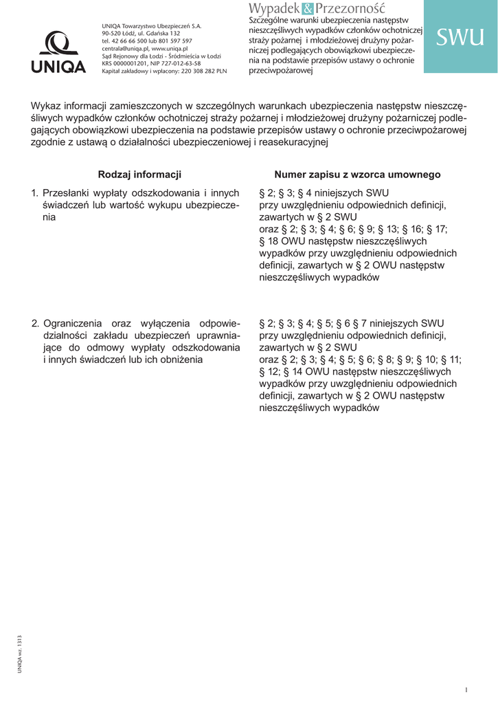 Wypadek & Przezorność UNIQA Towarzystwo Ubezpieczeń S.A. 90-520 Łódź, ul. Gdańska 132 tel. 42 66 66 500 lub 801 597 597 [email protected], www.uniqa.pl Sąd Rejonowy dla Łodzi - Śródmieścia w Łodzi KRS 0000001201, NIP 727-012-63-58 Kapitał zakładowy i wpłacony: 220 308 282 PLN Szczególne warunki ubezpieczenia następstw nieszczęśliwych wypadków członków ochotniczej straży pożarnej i młodzieżowej drużyny pożarniczej podlegających obowiązkowi ubezpieczenia na podstawie przepisów ustawy o ochronie przeciwpożarowej SWU Wykaz informacji zamieszczonych w szczególnych warunkach ubezpieczenia następstw nieszczęśliwych wypadków członków ochotniczej straży pożarnej i młodzieżowej drużyny pożarniczej podlegających obowiązkowi ubezpieczenia na podstawie przepisów ustawy o ochronie przeciwpożarowej zgodnie z ustawą o działalności ubezpieczeniowej i reasekuracyjnej Rodzaj informacji Numer zapisu z wzorca umownego § 2; § 3; § 4 niniejszych SWU przy uwzględnieniu odpowiednich definicji, zawartych w § 2 SWU oraz § 2; § 3; § 4; § 6; § 9; § 13; § 16; § 17; § 18 OWU następstw nieszczęśliwych wypadków przy uwzględnieniu odpowiednich definicji, zawartych w § 2 OWU następstw nieszczęśliwych wypadków 2. Ograniczenia oraz wyłączenia odpowiedzialności zakładu ubezpieczeń uprawniające do odmowy wypłaty odszkodowania i innych świadczeń lub ich obniżenia § 2; § 3; § 4; § 5; § 6 § 7 niniejszych SWU przy uwzględnieniu odpowiednich definicji, zawartych w § 2 SWU oraz § 2; § 3; § 4; § 5; § 6; § 8; § 9; § 10; § 11; § 12; § 14 OWU następstw nieszczęśliwych wypadków przy uwzględnieniu odpowiednich definicji, zawartych w § 2 OWU następstw nieszczęśliwych wypadków UNIQA wz. 1313_v2_2015-12-21 1. Przesłanki wypłaty odszkodowania i innych świadczeń lub wartość wykupu ubezpieczenia 1 §1 Postanowienia ogólne Niniejsze Szczególne Warunki, zwane dalej SWU, mają zastosowanie do umów ubezpieczenia następstw nieszczęśliwych wypadków członków Ochotniczej Straży Pożarnej i Młodzieżowej Drużyny Pożarniczej podlegającej obowiązkowi ubezpieczenia na podstawie przepisów ustawy o ochronie przeciwpożarowej zawieranych pomiędzy UNIQA Towarzystwo Ubezpieczeń S.A. zwane dalej UNIQA TU S.A., a osobami prawnymi, jednostkami samorządu terytorialnego i innymi jednostkami organizacyjnymi nieposiadającymi osobowości prawnej. §2 Definicje 1. Jeżeli z niniejszych SWU nie wynika inaczej, dla znaczenia pojęć użytych w SWU przyjmuje się znaczenie określone w § 2 Ogólnych Warunków Ubezpieczenia następstw nieszczęśliwych wypadków Wypadek&Przezorność, zatwierdzonych Uchwałą Zarządu UNIQA TU S.A. z dnia 28 grudnia 2015r., zwane dalej OWU. 1) długotrwały uszczerbek na zdrowiu - naruszenie sprawności organizmu, spowodowane zdarzeniem objętym ubezpieczeniem, które powoduje upośledzenie czynności organizmu na okres przekraczający 6 miesięcy, mogące ulec poprawie, 2) MDP - Młodzieżowa Drużyna Pożarna, 3) OSP - Ochotnicza Straż Pożarna, 4) przeciętne miesięczne wynagrodzenie - przeciętne miesięczne wynagrodzenie w gospodarce narodowej w poprzednim roku, ogłaszane dla celów emerytalnych w Dzienniku Urzędowym Rzeczypospolitej Polskiej „Monitor Polski” przez Prezesa Głównego Urzędu Statystycznego, stosowane poczynając od drugiego kwartału każdego roku przez okres jednego roku, 5) stały uszczerbek na zdrowiu - trwałe, nie rokujące poprawy uszkodzenie ciała lub rozstrój zdrowia ubezpieczonego spowodowane zdarzeniem objętym ubezpieczeniem. §3 Przedmiot i zakres ubezpieczenia 1. Na zasadach określonych w niniejszych SWU przedmiot ubezpieczenia stanowią są następstwa nieszczęśliwych wypadków członków zaistniałe w trakcie akcji ratowniczo - gaśniczych, wykonywania poleceń służbowych jako członka Ochotniczej Straży Pożarnej lub Młodzieżowej Drużyny Pożarniczej, w trakcie trwania ćwiczeń, szkoleń i zawodów, polegające na uszkodzeniu ciała lub rozstroju zdrowia, powodujące trwały uszczerbek na zdrowiu lub śmierć Ubezpieczonego, które wydarzyły się na terenie Rzeczpospolitej Polskiej i poza jej granicami w okresie ubezpieczenia. 2. Ochroną ubezpieczeniową objęci są członkowie Ochotniczych Straży Pożarnych oraz Młodzieżowych Drużyn Pożarniczych. 3. Umowa ubezpieczenia zawierana jest w wariancie ograniczonym do zdarzeń zaistniałych w trakcie akcji ratowniczo - gaśniczych zgodnie z ust. 1 powyżej. 4. Zakres ubezpieczenia obejmuje następujące świadczenia: 1) jednorazowe odszkodowanie w razie doznania stałego lub długotrwałego uszczerbku na zdrowiu, 2) jednorazowe odszkodowanie z tytułu śmierci Ubezpieczonego wskutek następstw nieszczęśliwych wypadków. §4 Czas trwania umowy ubezpieczenia Umowę ubezpieczenia zawiera się na okres jednego roku. §5 Limity wysokości świadczeń 1. W przypadku zawarcia umowy ubezpieczenia UNIQA TU SA ustala i wypłaca świadczenia dla poszczególnych ryzyk przy łącznym wystąpieniu następujących przesłanek: 2 1) jednorazowe odszkodowanie w razie doznania stałego lub długotrwałego uszczerbku na zdrowiu wynosi 20% przeciętnego wynagrodzenia określonego w § 2 pkt. 4 za 1% stałego uszczerbku na zdrowiu jest wypłacane pod warunkiem, że: a) stały lub długotrwały uszczerbek na zdrowiu jest spowodowany nieszczęśliwym wypadkiem, b) przedłożono UNIQA TU S.A. dokumentację lekarską niezbędną do ustalenia przebiegu i okoliczności powstania nieszczęśliwego wypadku (diagnoza, przebieg leczenia), c) przedłożono UNIQA TU S.A. dokumentację potwierdzającą zaistnienie nieszczęśliwego wypadku. 2) jednorazowe odszkodowanie z tytułu śmierci Ubezpieczonego wskutek następstw nieszczęśliwych wypadków jest wypłacane pod warunkiem, że: a) śmierć nastąpiła wskutek następstw nieszczęśliwego wypadku objętego ochroną ubezpieczeniową, b) śmierć nastąpiła w ciągu 3 