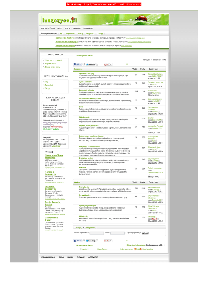 Zrzut strony: http://forum.luszczyce.pl/ STRONA GŁÓWNA BLOG Strona główna forum FORUM FAQ SŁOWNIK Regulamin <--kliknij na adresie O SERWISIE Szukaj Zarejestruj Zaloguj Dermatolog Kraków dermatologia kliniczna, estetyczna chirurgia, alergologia 12 430 44 30 www.instytutdermatologii.com Problemy z Łuszczycą ? Centrum Revitum. Szybka diagnoza. Skuteczna Terapia. Pomagamy. www.przyczynychoroby.pl/Łuszczyca/ Bezpłatne usunięcie bliznowca / keloidu na uszach w Centrum Medycznym Angelius www.angelius.pl MENU FORUM Strona główna forum Teraz jest 31 paź 2012, o 13:45 Wątki bez odpowiedzi Aktywne wątki Zobacz swoje posty Lubię to! 13 Tweetnij 15 0 0 Łuszczyca MENU UŻYTKOWNI KA FAQ Zarejestruj Zaloguj KTO PRZEGLĄDA FORUM Forum przegląda 8 użytkowników :: 3 zidentyfikowanych, 0 ukrytych i 5 gości (dane z ostatnich 5 minut) Najwięcej użytkowników online (56) było 16 maja 2012, o 19:57 Zidentyfikowani użytkownicy: Bing [Bot], Google [Bot], Google Adsense [Bot] Legenda: Administratorzy, Moderatorzy globalni Wątki Posty Ogólnie o łuszczycy Tu umieszczamy tematy dotyczące łuszczycy w ujęciu ogólnym, czyli zwykle nie pasujące do innych działów. Ostatni post 97 1500 Ile mieliście lat jak ... przez MARIUSZ14 wczoraj, o 21:13 Życie z łuszczycą Życie z łuszczycą na co dzień, czyli jak rodzimy sobie z naszą chorobą w codziennych czynnościach. 46 929 Samotni z łuszczycą przez henia 4 paź 2012, o 21:36 Leczenie tradycyjne Tu piszemy o leczeniu tradycyjnym stosowanym w łuszczycy, czyli o maściach, płynach, tabletkach i zastrzykach oraz o światłolecznictwie. 105 2188 dr michaels przez Ksymena 10 minut temu Leczenie niekonwencjonalne Rozmowy na temat leczenia domowego, ziołolecznictwa, suplementacji, terapii niekonwencjonalnych. 70 1030 Leczenie solarium przez anulka13 wczoraj, o 12:49 Dieta Tu jest odpowiednie miejsce, aby porozmawiać na temat spożywanych produktów, diety w łuszczycy. 16 526 Uzdrawiające pokarmy przez antonia 26 paź 2012, o 19:00 Moje leczenie W tym miejscu piszemy o przebiegu swojego leczenia, radzimy się innych odnośnie leczenia własnego przypadku choroby. 51 1839 Zinalfat przez Basieńka44 29 paź 2012, o 17:17 Szpitale, kliniki, sanatoria... Tu pytamy, polecamy i odradzamy sobie szpitale, kliniki, sanatoria oraz lekarzy. 27 153 dermatolog Poznań przez Caterina1331 Łuszczycowe zapalenie stawów Rozmowy dotyczące choroby współistniejącej z łuszczycą, czyli łuszczycowego zapalenia stawów (łuszczycy stawowej). 14 338 Łuszczycowe zapalenie ... przez Poli 19 paź 2012, o 09:11 20 664 Muzyka dla duszy przez henia 24 paź 2012, o 22:24 26 246 Do poczytania przez Jurek85 22 paź 2012, o 14:03 77 261 Rabat - promocja ... przez prostoznatury.com.pl wczoraj, o 13:20 Statystyki Liczba postów: 13643 • Liczba wątków: 1694 • Liczba użytkowników: 877 • Najnowszy użytkownik: UMaximsor Motywacja i samopoczucie Tu wspieramy się nawzajem w sensie psychicznym. Jeśli chcesz się wygadać, nie masz już siły, to jest to dobre miejsce, żeby podzielić się swoimi troskami. Tu pisz na temat motywacji w walce z łuszczycą i łzs oraz metodach poprawiania sobie samopoczucia. Znalezione w sieci Jeśli znalazłeś(aś) w Internecie ciekawy artykuł, stronkę, nowinkę czy jakąkolwiek informację związaną z łuszczycą, poinformuj innych forumowiczów o tym tutaj. Reklama Jeśli chcesz zareklamować swój produkt, to jest to odpowiednie miejsce. Pamiętaj jednak, aby umieszczać reklamy dotyczące tylko tematyki forum. Nowy sposób na łuszczycę 100% naturalny holistyczny produkt, który dopiero w chodzi do Polski. zyjlepiej.com /#!/choroba/l… Koniec z Łuszczycą Preparaty DrMichaels. Na Zaw sze Pozbądź Się Objaw ów . dzisiaj, o 09:40 Ogólnie drm ichaels.com .pl/łuszczy… Leczenie Łuszczycy Sanatorium Smrdaky Słow acja W ody Siarczkow e, 1600 zł / tydzień m edeacentrum .pl/Leczeni… Panie Szukają Panów Tysiące Zainteresow anych Tobą Czeka Zarejestruj się Za Darmo - Teraz! Wątki Posty Ostatni post Przywitaj się! Jesteś nowy(a) na forum? Przywitaj się, przedstaw, napisz kilka słów o sobie, swoich zainteresowaniach, jak rozpoczęła się u Ciebie łuszczyca. 234 2436 Witam wszystkie ... przez irute91@ 27 paź 2012, o 21:37 Po godzinach... Tu możesz porozmawiać na różne tematy niezwiązane z łuszczycą. 44 1014 Grupa wsparcia Warszawa przez Basieńka44 23 paź 2012, o 22:58 Sprawy organizacyjne Tu pisz wszelkie sugestie, uwagi, skargi, zażalenia oraz błędy i trudności dotyczące forum oraz całego portalu luszczyce.pl. 13 146 REGIONizacja biedronek;) przez henia 25 sie 2012, o 17:29 Aktualności Aktualności i nowości dotyczące forum, całego serwisu oraz światka łuszczycy. 41 366 Warsztaty ... przez Paweł 29 paź 2012, o 09:49 www.Randk owa.com /Randk … Uzdrawianie Duszy Uzdraw ianie duchow e. Egzorcyzmy. Ochrona energetyczna.Terapia Duszy. Zal oguj • Zare je s t ruj www.alek sanderdeyev.pl Nazwa użytkownika: Lubię to! 13 Tweetnij Hasło: 0 0 STRONA GŁÓWNA BLOG FORUM SŁOWNIK Zaloguj 15 Ekipa • Usuń ciasteczka • Strefa czasowa: UTC + 1 Strona główna forum Nowości | Zapamiętaj mnie Mapa Strony O SERWISIE Index Mapy strony RSS Lista kanałów Zrzut strony: http://forum.luszczyce.pl/ <--kliknij na adresie Łuszczyca na Facebooku Lubię to! Liczba osób, które lubią Łuszczyca: 451. Małgorzata A nna Milena A leksandra Mirosław Sebastian A nna Marzena Tomek Karolina Wty czka społecznościow a F acebooka Dario Henry k Beata Maria A nna Bartłomiej Zbigniew O lga Ew elina A gnieszka Monika Jurek Joanna Monika 2010-2012 © luszczyce.pl Powered by phpBB © 2000, 2002, 2005, 2007 phpBB Group Przyjazne użytkownikom polskie wsparcie phpBB3 - phpBB3.PL