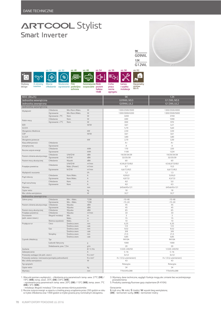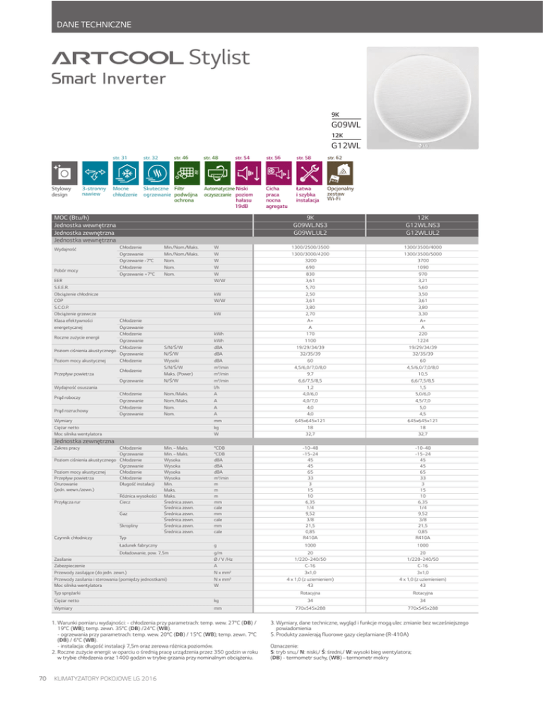 DANE TECHNICZNE Stylist 9K G09WL 12K G12WL str. 31 Stylowy design 3-stronny nawiew str. 32 str. 46 Mocne Skuteczne Filtr chłodzenie ogrzewanie podwójna ochrona str. 48 str. 54 Automatyczne Niski oczyszczanie poziom hałasu 19dB MOC (Btu/h) Jednostka wewnętrzna Jednostka zewnętrzna Jednostka wewnętrzna Wydajność Pobór mocy Chłodzenie Ogrzewanie Ogrzewanie -7°C Chłodzenie Ogrzewanie +7°C Min./Nom./Maks. Min./Nom./Maks. Nom. Nom. Nom. EER S.E.E.R. Obciążenie chłodnicze COP S.C.O.P. Obciążenie grzewcze Klasa efektywności energetycznej kW W/W kW Chłodzenie Ogrzewanie Chłodzenie Roczne zużycie energii Ogrzewanie Chłodzenie Poziom ciśnienia akustycznego Ogrzewanie Poziom mocy akustycznej Chłodzenie Przepływ powietrza Ogrzewanie S/N/Ś/W N/Ś/W Wysoki S/N/Ś/W Maks. (Power) N/Ś/W Chłodzenie Ogrzewanie Chłodzenie Ogrzewanie Nom./Maks. Nom./Maks. Nom. Nom. Chłodzenie Wydajność osuszania Prąd roboczy Prąd rozruchowy W W W W W W/W Wymiary Ciężar netto Moc silnika wentylatora kWh kWh dBA dBA dBA m³/min m³/min m³/min l/h A A A A mm kg W str. 56 str. 58 str. 62 Cicha praca nocna agregatu Łatwa i szybka instalacja Opcjonalny zestaw Wi-Fi 9K G09WL.NS3 G09WL.UL2 12K G12WL.NS3 G12WL.UL2 1300/2500/3500 1300/3000/4200 3200 690 830 3,61 5,70 2,50 3,61 3,80 2,70 A+ A 170 1100 19/29/34/39 32/35/39 60 4,5/6,0/7,0/8,0 9,7 6,6/7,5/8,5 1,2 4,0/6,0 4,0/7,0 4,0 4,0 645x645x121 18 32,7 1300/3500/4000 1300/3500/5000 3700 1090 970 3,21 5,60 3,50 3,61 3,80 3,30 A+ A 220 1224 19/29/34/39 32/35/39 60 4,5/6,0/7,0/8,0 10,5 6,6/7,5/8,5 1,5 5,0/6,0 4,5/7,0 5,0 4,5 645x645x121 18 32,7 -10~48 -15~24 45 45 65 33 3 15 10 6,35 1/4 9,52 3/8 21,5 0,85 R410A -10~48 -15~24 45 45 65 33 3 15 10 6,35 1/4 9,52 3/8 21,5 0,85 R410A 1000 1000 20 1/220~240/50 C-16 3x1,0 4 x 1,0 (z uziemieniem) 43 20 1/220~240/50 C-16 3x1,0 4 x 1,0 (z uziemieniem) 43 Rotacyjna Rotacyjna Jednostka zewnętrzna Zakres pracy Chłodzenie Ogrzewanie Poziom ciśnienia akustycznego Chłodzenie Ogrzewanie Poziom mocy akustycznej Chłodzenie Przepływ powietrza Chłodzenie Orurowanie Długość instalacji (jedn. wewn./zewn.) Różnica wysokości Przyłącza rur Ciecz Gaz Skropliny Czynnik chłodniczy Min. – Maks. Min. – Maks. Wysoka Wysoka Wysoka Wysoka Min. Maks. Maks. Średnica zewn. Średnica zewn. Średnica zewn. Średnica zewn. Średnica zewn. Średnica zewn. °CDB °CDB dBA dBA dBA m³/min m m m mm cale mm cale mm cale Typ Ładunek fabryczny g Doładowanie, pow. 7,5m g/m Ø / V /Hz A N x mm² N x mm² W Zasilanie Zabezpieczenie Przewody zasilające (do jedn. zewn.) Przewody zasilania i sterowania (pomiędzy jednostkami) Moc silnika wentylatora Typ sprężarki Ciężar netto kg 34 34 Wymiary mm 770x545x288 770x545x288 1. Warunki pomiaru wydajności: - chłodzenia przy parametrach: temp. wew. 27°C (DB) / 19°C (WB); temp. zewn. 35°C (DB) /24°C (WB). - ogrzewania przy parametrach: temp. wew. 20°C (DB) / 15°C (WB); temp. zewn. 7°C (DB) / 6°C (WB). - instalacja: długość instalacji 7,5m oraz zerowa różnica poziomów. 2. Roczne zużycie energii: w oparciu o średnią pracę urządzenia przez 350 godzin w roku w trybie chłodzenia oraz 1400 godzin w trybie grzania przy nominalnym obciążeniu. 70 KLIMATYZATORY POKOJOWE LG 2016 3. Wymiary, dane techniczne, wygląd i funkcje mogą ulec zmianie bez wcześniejszego powiadomienia 5. Produkty zawierają fluorowe gazy cieplarniane (R-410A) Oznaczenie: S: tryb snu,/ N: niski,/ Ś: średni,/ W: wysoki bieg wentylatora; (DB) - termometr suchy, (WB) – termometr mokry Klimatyzatory pokojowe LG 2016 1 645 645 121 4.1 Indoor Units G09WL.NS3 / G12WL.NS3 75 Inverter Single 1 645 75 (Jednostki: mm) Nr Nazwa części Uwagi AS-W0963WB0(G09WL) Przedni panel 2 AS-W1263WB0(G12WL) pozycji 1 42 121 2 Odbiornik sygnału 3 Płyta montażowa 42 Miejsce poziomowania Obrys przodu jednostki Obrys tyłu jednostki 36 287 287 36 287 36 19 770 3 Ø55 Ø55 30 20 353 [Unit : mm] Nr pozycji Nazwa części 1 2 3 4 5 Kratka wylotu powietrza 154 24 106 Instal. w prawą str. Instal. w lewą str 138 210 558 [Unit : m 40 43 ASUW0963WB0(G09WL) ASUW1263WB0 ASUW096MUF3(H09AK) ASUW096BUS3 ASUW126MUF3(H12AK) ASUW126BUS3 ASUW096NRR0(A09LL) ANUW126NRR0 (Jednostki: ASUW1862WR0 mm) ASUW1862EF0(P18EL) Miejsce/poziomowania G09WL.UL2 G12WL.UL2 Obrys przodu jednostki Obrys tyłu jednostki 36 287 Ø55 30 42 2 42 Ø55 Instal. w prawą str. 75 75 Instal. w lewą str 645 3 Przyłącze rur chłodniczych (gaz) Przyłącze rur chłodniczych (ciecz) Skrzynka sterująca Wkręt uziemienia - 20 54 40 277.34 43 1 288 CHASSIS CODE: S3 4 3 207 5 2 15.79 267 70 545 Ø464 [Unit : mm] KLIMATYZATORY POKOJOWE LG 2016 71