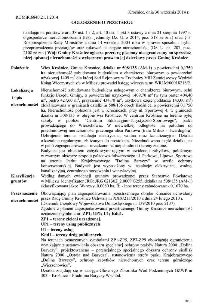 Krośnice, dnia 30 września 2014 r. RGMiR.6840.21.1.2014 OGŁOSZENIE O PRZETARGU działając na podstawie art. 38 ust. 1 i 2, art. 40 ust. 1 pkt 3 ustawy z dnia 21 sierpnia 1997 r. o gospodarce nieruchomościami (tekst jednolity Dz. U. z 2014, poz. 518 ze zm.) oraz § 3 Rozporządzenia Rady Ministrów z dnia 14 września 2004 roku w sprawie sposobu i trybu przeprowadzenia przetargów oraz rokowań na zbycie nieruchomości (Dz. U. nr 207, poz. 2108 ze zm.) Wójt Gminy Krośnice ogłasza przetarg pisemny nieograniczony na sprzedaż niżej opisanej nieruchomości z wyłącznym prawem jej dzierżawy przez Gminę Krośnice Położenie Wieś Krośnice, Gmina Krośnice, działka nr 508/135 (AM-1) o powierzchni 0,1750 ha nieruchomość zabudowana budynkiem o charakterze biurowym o powierzchni użytkowej 1409 m2 dla której Sąd Rejonowy w Trzebnicy VIII Zamiejscowy Wydział Ksiąg Wieczystych z/s w Miliczu prowadzi księgę wieczystą nr WR1M/00018218/2. Nieruchomość zabudowana budynkiem usługowym o charakterze biurowym, pełni funkcję Urzędu Gminy, o powierzchni użytkowej 1409,70 m2 (w tym parter 404,40 i opis m2, piętro 427,60 m2, przyziemie 434,70 m2, użytkowa część poddasza 143,00 m2) nieruchomości zlokalizowana w granicach działki nr 508/135 obręb Krośnice, o powierzchni 0,1750 ha. Nieruchomość położona jest w Krośnicach, przy ul. Sportowej 4, w granicach działki nr 508/135 w obrębie wsi Krośnice. W centrum Krośnice na terenie byłej szkoły w pobliżu "Centrum Edukacyjno-Turystyczno-Sportowego", parku prowadzącego do Wierzchowic. W niewielkiej odległości na południe od przedmiotowej nieruchomości przebiega ulica Parkowa (trasa Milicz - Twardogóra). Uzbrojenie terenu: instalacja elektryczna, wodna oraz kanalizacyjna. Działka o kształcie regularnym, zbliżonym do prostokąta. Niezabudowana część działki jest w pełni zagospodarowana - urządzono na niej chodniki i tereny zielone. Budynek jest obiektem zabytkowym ujętym w ewidencji zabytków, położonym w zwartym obszarze zespołu pałacowo-folwarcznego ul. Parkowa, Lipowa, Sportowa na terenie Parku Krajobrazowego "Dolina Baryczy" w strefie ochrony konserwatorskiej. Budynek jest wyposażony w instalacje: elektryczną, wodną, kanalizacyjną, centralnego ogrzewania i wentylacyjną. Klasyfikacja Według danych ewidencji gruntów prowadzonej przez Starostwo Powiatowe w Miliczu identyfikator JRG: JRG 021302_2.0009.G255, działka nr 508/135 (AM-1) gruntów sklasyfikowana jako: W-rowy: 0,0080 ha, Bi - inne tereny zabudowane - 0,1670 ha. Lokalizacja Przeznaczenie Obowiązujący plan zagospodarowania przestrzennego obrębu Krośnice uchwalony przez Radę Gminy Krośnice Uchwalą nr XXX/215/2010 z dnia 24 lutego 2010 r. nieruchomości (Dziennik Urzędowy Województwa Dolnośląskiego nr 139/2010 poz. 2137) Zgodnie z planem zagospodarowania przestrzennego Gminy Krośnice nieruchomość oznaczono symbolami: ZP1; UP1; U1; Kdd1. ZP1 – tereny zieleni urządzonej, UP1 – tereny usług publicznych U1 – tereny usług Kdd1 – tereny dróg publicznych. Na terenach oznaczonych symbolami ZP1-ZP5, ZP7-ZP9 obowiązują ograniczenia wynikające z ustanowienia obszaru specjalnej ochrony ptaków Natura 2000 „Dolina Baryczy”, projektowanego – potencjalnego specjalnego obszaru ochrony siedlisk Natura 2000 „Ostoja nad Baryczą”, ustanowienia strefy parku Krajobrazowego „Dolina Baryczy”, ochrony zabytków nieruchomych oraz terenu górniczego „Wierzchowice”. Działka znajduję się w zasięgu Głównego Zbiornika Wód Podziemnych GZWP nr 303 – Krośnice – Pradolina Baryczy Wschód. str. 1 Mapka Kontakt Dodatkowych informacji udziela: mgr Dorota Perlińska - kierownik Referatu Gospodarki Mieniem i Rolnictwa tel. (071) 38 46 024, mail [email protected]. lub osobiście w godzinach pracy urzędu. Przetarg odbędzie się dnia 1 grudnia 2014 w Urzędzie Gminy w Krośnicach ul. Sportowa 4, pokój nr 7 (sala konferencyjna), 1. Cena wywoławcza - 3 936 000,00 zł 2. Wadium – 394 000,00 zł Cena wywoławcza jest ceną netto. Przy zbyciu ww. nieruchomości zastosowanie będą miały przepisy ustawy z dnia 11 marca 2004 r. o podatku od towarów i usług. str. 2 WARUNKI PRZETARGU 1. Przedmiotem przetargu jest sprzedaż nieruchomości z prawem jej dzierżawy przez Gminę Krośnice na okres 5 lat od daty podpisania umowy oraz z powrotnym nabyciem prawa własności tej nieruchomości przez Gminę Krośnice po zakończeniu umowy dzierżawy. 2. Warunkiem przystąpienia do przetargu jest wpłacenie określonego w ogłoszeniu wadium, z takim rozliczeniem, aby należna kwota znalazła się na koncie Gminy Krośnice w nieprzekraczalnym terminie do dnia 26 listopada 2014 r. Wpłaty należy dokonać przelewem na konto Gminy Krośnice w Banku Spółdzielczym w Krośnicach nr konta 77 9582 1023 2002 0200 0101 0004. 3. Pisemne zgłoszenie udziału w przetargu należy złożyć najpóźniej w dniu 26 listopada 2014 do godziny 15.00 w Sekretariacie Urzędu Gminy w Krośnicach, pokój nr 17 w zamkniętej kopercie opisanej „Oferta na zakup działki nr 508/135 obręb Krośnice gmina Krośnice wraz z jej dzierżawą”. Zgłoszenie składa się w języku polskim. O dotrzymaniu powyższego terminu decyduje data wpływu oferty do Urzędu Gminy w Krośnicach. Dotyczy to również ofert składanych drogą pocztową. 4. Część jawna przetargu - otwarcie ofert i ich ocena formalna nastąpi w dniu 1 grudnia 2014 r. o godzinie 10:00 w siedzibie Urzędu Gminy Krośnice ul. Sportowa 4, pokój nr 7 (sala konferencyjna). Na otwarciu ofert komisja przetargowa powiadomi oferentów o części niejawnej przetargu. 5. Każdy oferent może złożyć tylko jedną ofertę. 6. W przypadku złożenia równorzędnych ofert komisja przetargowa zorganizuje dodatkowy przetarg ustny ograniczony do oferentów, którzy złożyli te oferty i zawiadomi ich o terminie dodatkowego przetargu. 7. Komisja przetargowa dokonuje wyboru najkorzystniejszej oferty, biorąc p