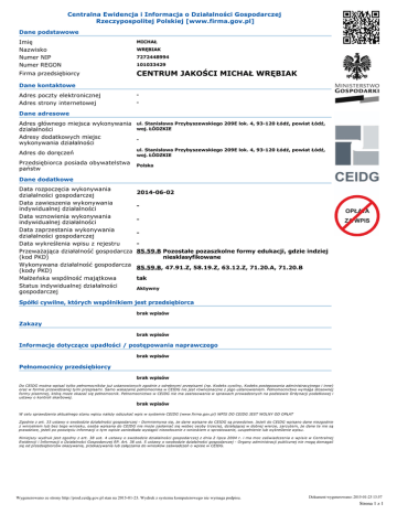 Centralna Ewidencja i Informacja o Działalności Gospodarczej Rzeczypospolitej Polskiej [www.firma.gov.pl] Dane podstawowe Imię Nazwisko Numer NIP Numer REGON MICHAŁ Firma przedsiębiorcy CENTRUM JAKOŚCI MICHAŁ WRĘBIAK WRĘBIAK 7272448994 101033429 Dane kontaktowe Adres poczty elektronicznej Adres strony internetowej Dane adresowe Adres głównego miejsca wykonywania ul. Stanisława Przybyszewskiego 209E lok. 4, 93120 Łódź, powiat Łódź, woj. ŁÓDZKIE działalności Adresy dodatkowych miejsc wykonywania działalności Adres do doręczeń ul. Stanisława Przybyszewskiego 209E lok. 4, 93120 Łódź, powiat Łódź, woj. ŁÓDZKIE Przedsiębiorca posiada obywatelstwa państw Polska Dane dodatkowe Data rozpoczęcia wykonywania działalności gospodarczej Data zawieszenia wykonywania indywidualnej działalności Data wznowienia wykonywania indywidualnej działalności Data zaprzestania wykonywania działalności gospodarczej Data wykreślenia wpisu z rejestru Przeważająca działalność gospodarcza (kod PKD) Wykonywana działalność gospodarcza (kody PKD) Małżeńska wspólność majątkowa Status indywidualnej działalności gospodarczej 20140602 85.59.B Pozostałe pozaszkolne formy edukacji, gdzie indziej niesklasyfikowane 85.59.B, 47.91.Z, 58.19.Z, 63.12.Z, 71.20.A, 71.20.B tak Aktywny Spółki cywilne, których wspólnikiem jest przedsiębiorca brak wpisów Zakazy brak wpisów Informacje dotyczące upadłości / postępowania naprawczego brak wpisów Pełnomocnicy przedsiębiorcy brak wpisów Do CEIDG można wpisać tylko pełnomocników już ustanowionych zgodnie z odrębnymi przepisami (np. Kodeks cywilny, Kodeks postępowania administracyjnego i inne) oraz w formie przewidzianej tymi przepisami. Samo wskazanie pełnomocnika w CEIDG nie jest równoznaczne z jego ustanowieniem. Pełnomocnictwo wymaga stosownej formy pisemnej, którą może okazać się pełnomocnik. Pełnomocnictwo w CEIDG nie ma zastosowania w sprawach prowadzonych na podstawie Ordynacji podatkowej i ustawy o kontroli skarbowej. brak wpisów W celu sprawdzenia aktualnego stanu wpisu należy odszukać wpis w systemie CEIDG (www.firma.gov.pl) WPIS DO CEIDG JEST WOLNY OD OPŁAT Zgodnie z art. 33 ustawy o swobodzie działalności gospodarczej Domniemywa się, że dane wpisane do CEIDG są prawdziwe. Jeżeli do CEIDG wpisano dane niezgodnie z wnioskiem lub bez tego wniosku, osoba wpisana do CEIDG nie może zasłaniać się wobec osoby trzeciej, działającej w dobrej wierze, zarzutem, że dane te nie są prawdziwe, jeżeli po powzięciu informacji o tym wpisie zaniedbała wystąpić niezwłocznie z wnioskiem o sprostowanie, uzupełnienie lub wykreślenie wpisu. Niniejszy wydruk jest zgodny z art. 38 ust. 4 ustawy o swobodzie działalności gospodarczej z dnia 2 lipca 2004 r. i ma moc zaświadczenia o wpisie w Centralnej Ewidencji i Informacji o Działalności Gospodarczej RP. Art. 38 ust. 5 ustawy o swobodzie działalności gospodarczej Organy administracji publicznej nie mogą domagać się od przedsiębiorców okazywania, przekazywania lub załączania do wniosków zaświadczeń o wpisie w CEIDG. Wygenerowano ze strony http://prod.ceidg.gov.pl stan na 20150123. Wydruk z systemu komputerowego nie wymaga podpisu. Dokument wygenerowano: 20150123 13:57 Strona 1 z 1