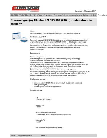 Utworzono : 08 marzec 2017 OGRZEWANIE PODŁOGOWE > Przewody grzejne > Przewody jednostronnie zasilanene Elektra seria DM > Przewód gr Przewód grzejny Elektra DM 10/2050 (205m) - jednostronnie zasilany Model : Przewód grzejny Elektra DM 10/2050 (205m) - jednostronnie zasilany Producent : ELEKTRA Przewody grzejne ELEKTRA DM są gotowymi do układania zestawami grzejnymi wyprodukowanymi zgodnie z normą PN-EN 60335-1. Składają się z cienkiego przewodu grzejnego zakończonego przewodem zasilającym. System jest przeznaczony do zastosowań wewnętrznych i stanowi ogrzewanie bezpośrednie. Montaż bezpośrednio pod posadzką w elastycznym kleju lub w masie samopoziomującej. Zastosowanie Ogrzewanie podstawowe Dobierając przewody grzejne ELEKTRA DM należy wziąć pod uwagę: - zapotrzebowanie pomieszczeń na ciepło - odległość między przewodami ułożonymi na powierzchni niezabudowanej stałymi elementami (powierzchnia grzejna pomieszczenia) nie może być większa niż 12,5 cm, aby nie tworzyły się strefy niedogrzane. Odległość między przewodami nie może być mniejsza niż 5cm Ogrzewanie uzupełniające - „efekt ciepłej podłogi” Powierzchnia podłogi, którą chcemy „dogrzać wymaga mocy grzejnej od 80 do 120W/m2. Zastosowanie wyższej mocy jednostkowej (tylko dla posadzek z terakoty) umożliwia szybsze osiągnięcie wymaganej temperatury. Opakowanie zawiera: � przewód grzejny ELEKTRA (przy większych długościach na szpuli), � kartę gwarancyjną, � obszerną broszurę/instrukcję montażu. Dane techniczne: Typ �Elekrta DM 10/2050 Długość [m] �205,0 Rodzaj przewodu grzejnego �dwużyłowy, ekranowany jednostronnie zasilany Moc maty [W] �2050 Moc jednostkowa przewodu grzejnego kontakt : - [email protected] Strona 1 Utworzono : 08 marzec 2017 OGRZEWANIE PODŁOGOWE > Przewody grzejne > Przewody jednostronnie zasilanene Elektra seria DM > Przewód gr Przewód grzejny Elektra DM 10/2050 (205m) - jednostronnie zasilany �10 W/m Napięcie zasilania �230V- 50/60 Hz Cena : 1.333,32 zł Brutto ( 1.084,00 zł Netto) Dostępność: Produkt dostępny w naszym sklepie od 14 lipiec 2009 kontakt : - [email protected] Strona 2