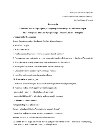„Sztuką jest umieraćdla Ojczyzny, ale większą sztuką jest dobrze dla niej żyć” Kardynał Stefan Wyszyński Regulamin konkursu literackiego i plastycznego organizowanego dla szkół noszących imię Kardynała Stefana Wyszyńskiego i szkół z Gminy Tarnogród I. Organizator konkursu: Szkoła Podstawowa im. Kardynała Stefana Wyszyńskiego w Różańcu Drugim II. Cele konkursu: 1. Rozbudzanie aktywności twórczej najmłodszych uczniów 2. Poznawanie oraz wcielanie w życie wartości i ideałów, którym służył Kardynał Wyszyński 3. Kształtowanie umiejętności samodzielnej twórczości literackiej 4. Rozwijanie uzdolnień i zainteresowań dzieci i młodzieży 5. Ukazanie wzorca osobowego wybitnego Polaka 6. Umożliwienie uczniom osiągnięcia sukcesu III. Założenia organizacyjne: 1. Konkurs adresowany jest do uczniów szkoły podstawowej i gimnazjum. 2. Konkurs będzie przebiegał w dwóch kategoriach: - kategoria I - klasy I – III szkoły podstawowej - kategoria II klasy IV – VI szkoły podstawowej i gimnazja IV. Warunki uczestnictwa: Kategoria I: prace plastyczne Temat : „Kardynał Stefan Wyszyński w oczach dzieci”. Uczestnicy wykonują prace plastyczne zgodnie z tematem. Format pracy A-4, technika wykonania dowolna Do każdej pracy, na jej odwrocie, należy dołączyć informację: imię i nazwisko autora pracy, klasa, szkoła, imię i nazwisko nauczyciela/opiekuna. Kategoria II Napisz list do Prymasa, w którym wyrazisz swój podziw i uznanie dla wartości, jakimi kierował się w życiu. W kategorii II wymagane są prace w formie papierowej pisane ręcznie w formacie A4. Kryterium oceny prac : - realizacja i oryginalność ujęcia tematu. - strona językowa, interpunkcyjna oraz estetyka. V. Uwagi organizatora: - Prace będą oceniane oddzielnie dla szkół podstawowych i gimnazjów. - Praca musi być wykonana tylko przez jednego autora. - Szkoła wysyła lub dostarcza prace do organizatora konkursu - maksymalnie 5 prac w pierwszej kategorii i 3 prace w II kategorii - komisja konkursowa ocenia i wybiera najlepsze prace VI.Terminy konkursowe: 1. Termin składania prac: 07.01.2015r. 2. Ogłoszenie wyników i rozdanie nagród w dniu spotkania opłatkowego szkół prymasowskich 24 stycznia 2015 r. w Szkole Podstawowej w Różańcu Drugim. Najciekawsze prace zostaną wyeksponowane na wystawie poświęconej Kardynałowi Stefanowi Wyszyńskiemu VII. Prace należy przesłać na adres: Szkoła Podstawowa im. Kardynała Stefana Wyszyńskiego Różaniec Drugi 171 23-420 Tarnogród woj. lubelskie Tel. Kontaktowy: 846899347 Osoba do kontaktu: Zofia Zając
