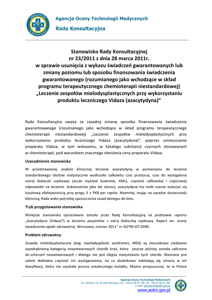 Agencja Oceny Technologii Medycznych Rada Konsultacyjna Stanowisko Rady Konsultacyjnej nr 23/2011 z dnia 28 marca 2011r. w sprawie usunięcia z wykazu świadczeń gwarantowanych lub zmiany poziomu lub sposobu finansowania świadczenia gwarantowanego (rozumianego jako wchodzące w skład programu terapeutycznego chemioterapii niestandardowej) „Leczenie zespołów mielodysplastycznych przy wykorzystaniu produktu leczniczego Vidaza (azacytydyna)” Rada Konsultacyjna uważa za zasadną zmianę sposobu finansowania świadczenia gwarantowanego (rozumianego jako wchodzące w skład programu terapeutycznego chemioterapii niestandardowej) „Leczenie zespołów mielodysplastycznych przy wykorzystaniu produktu leczniczego Vidaza (azacytydyna)”, poprzez umieszczenie preparatu Vidaza, w tym wskazaniu, w katalogu substancji czynnych stosowanych w chemioterapii, pod warunkiem znacznego obniżenia ceny preparatu Vidaza. Uzasadnienie stanowiska W przedstawionej analizie klinicznej leczenie azacytydyną w porównaniu do leczenia standardowego istotnie statystycznie wydłużało całkowity czas przeżycia, czas do wystąpienia ostrej białaczki szpikowej (acute myeloid leukemia, AML), częstość całkowitej i częściowej odpowiedzi na leczenie. Jednocześnie jako lek sierocy, azacytydyna ma małe szanse wykazać się kosztową efektywnością przy progu 3 x PKB per capita. Niemniej, mając na uwadze skuteczność kliniczną, Rada widzi potrzebę uproszczenia zasad dostępu do leku. Tryb przygotowania stanowiska Niniejsze stanowisko opracowane zostało przez Radę Konsultacyjną na podstawie raportu „Azacytydyna (Vidaza®) w leczeniu pacjentów z ostrą białaczką szpikową. Raport ws. oceny świadczenia opieki zdrowotnej. Warszawa, marzec 2011” nr AOTM-OT-0390. Problem zdrowotny Zespoły mielodysplastyczne (ang. myelodysplastic syndromes, MDS) są stosunkowo niedawno wyodrębnioną kategorią nowotworowych chorób krwi, która jeszcze później została zaliczona do schorzeń nowotworowych i dlatego nie jest objęta statystykami tych chorób. Nieznana jest zatem dokładna częstość ich występowania, na co dodatkowo nakładają się zmiany w ich klasyfikacji, która nie uzyskała jeszcze ostatecznego kształtu. Można przypuszczać, że w Polsce Agencja Oceny Technologii Medycznych Al. Lotników 22, 02-668 Warszawa, tel. +48 22 56 67 200 fax +48 22 56 67 202 e-mail: [email protected] www.aotm.gov.pl Stanowisko Rady Konsultacyjnej AOTM nr 23/2011 z dnia 28 marca 2011r. na różne formy MDS zapada około 2000 osób rocznie. Są to choroby występujące w każdym wieku, ale ich częstość zwiększa się w miarę starzenia, kiedy również zwiększa się częstość wtórnych MDS rozwijających się u rekonwalescentów po radio− lub chemioterapii. Istotą zespołów mielodysplastycznych jest obecność nowotworowego klonu komórek krwi, który cechuje szybkie tworzenie i natychmiastowa śmierć komórek, ale jednocześnie tłumienie normalnego krwiotworzenia. To powoduje obraz chorobowy, w którym przeważają niedobory prawidłowych krwinek, najczęściej niedokrwistość, a komórki nowotworowe są stosunkowo nielicznie. Zespoły mielodysplastyczne mogą ewoluować w kierunku ostrych białaczek szpikowych i z tego powodu bywają też określane jako stany przedbiałaczkowe. W sumie MDS reprezentują spektrum od chorób bardzo zbliżonych do aplazji szpiku, po choroby bardzo podobne do ostrych białaczek. Ogólnie rzecz ujmując, są to choroby trudno poddające się leczeniu i u osób młodych rokujące bardzo źle. Jednakże przebieg jest bardzo różnorodny — istnieją chorzy na MDS z wieloletnim przeżyciem bez leczenia.1 Obecna standardowa terapia Miejscami rozpoznawania i leczenia MDS są kliniki hematologii i oddziały hematologiczne dysponujące odpowiednimi możliwościami diagnostycznymi, w szczególności zatrudniające doświadczonego hematopatologa i posiadające pracownię cytogenetyczną, a także możliwości lecznicze odpowiednie do sytuacji. Chorzy kwalifikujący się do leczenia transplantacyjnego powinni być kierowani do ośrodków dysponujących tą metodą leczenia. Pacjenci >65. r.ż. i młodsi chorzy nie kwalifikujący się do leczenia transplantacyjnego mogą być leczeni na oddziałach hematologicznych, a schyłkowe etapy choroby można leczyć na oddziałach internistycznych bliskich miejsca zamieszkania.1 Nie ma ogólnie przyjętych, opartych na wynikach badań zasad postępowania leczniczego w MDS, dlatego większość międzynarodowych zespołów ekspertów zaleca objęcie chorego badaniem klinicznym, jeśli jest dostępne.1 Podstawową decyzją jest określenie, czy pacjenta należy leczyć agresywnie, czy zachowawczo. U wszystkich chorych <65 lat powinno się rozważyć terapię agresywną. U osób z niskim wskaźnikiem rokowniczym celowe jest opóźnienie decyzji o rozpoczęciu leczenia agresywnego i obserwacja oraz leczenie zachowawcze (objawowe). Progresja choroby lub pierwotna choroba z pośrednim i wysokim wskaźnikiem rokowniczym jest wskazaniem do terapii agresywnej, takiej samej jak w ostrej białaczce szpikowej (indukcja remisji, konsolidacja). Dalsze postępowanie zależy od tego, czy chory ma rodzinnego tkankowo zgodnego dawcę komórek krwiotwórczych (szybki allogeniczny przeszczep szpiku), czy nie (leczenie jak w ostrych białaczkach). Pacjenci, którzy nie uzyskują remisji całkowitej po agresywnej chemioterapii, i osoby, u których choroba nawraca po wcześniejszej remisji, powinny być leczone zachowawczo.1 Agresywna chemioterapia w MDS jest obarczona większymi powikłaniami niż w ostrej białaczce szpikowej. Wynika to z faktu, że klon nowotworowy silniej tłumi normalną hematopoezę, co oznacza znacznie większe koszty leczenia wspomagającego tej fazy terapii. Po zakończeniu konsolidacji, w razie utrzymywania się remisji całkowitej, należy przeszczepić szpik. Jeśli istnieją przeciwwskazania lub brak zgody na przeszczepienie sz