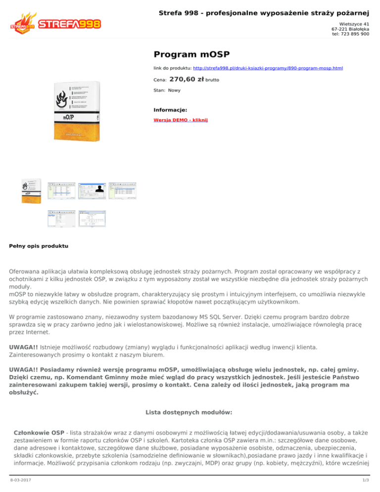 Strefa 998 - profesjonalne wyposażenie straży pożarnej Wietszyce 41 67-221 Białołęka tel: 723 895 900 Program mOSP link do produktu: http://strefa998.pl/druki-ksiazki-programy/890-program-mosp.html Cena: 270,60 zł brutto Stan: Nowy Informacje: Wersja DEMO - kliknij Pełny opis produktu Oferowana aplikacja ułatwia kompleksową obsługę jednostek straży pożarnych. Program został opracowany we współpracy z ochotnikami z kilku jednostek OSP, w związku z tym wyposażony został we wszystkie niezbędne dla jednostek straży pożarnych moduły. mOSP to niezwykle łatwy w obsłudze program, charakteryzujący się prostym i intuicyjnym interfejsem, co umożliwia niezwykle szybką edycję wszelkich danych. Nie powinien sprawiać kłopotów nawet początkującym użytkownikom. W programie zastosowano znany, niezawodny system bazodanowy MS SQL Server. Dzięki czemu program bardzo dobrze sprawdza się w pracy zarówno jedno jak i wielostanowiskowej. Możliwe są również instalacje, umożliwiające równoległą pracę przez Internet. UWAGA!! Istnieje możliwość rozbudowy (zmiany) wyglądu i funkcjonalności aplikacji według inwencji klienta. Zainteresowanych prosimy o kontakt z naszym biurem. UWAGA!! Posiadamy również wersję programu mOSP, umożliwiającą obsługę wielu jednostek, np. całej gminy. Dzięki czemu, np. Komendant Gminny może mieć wgląd do pracy wszystkich jednostek. Jeśli jesteście Państwo zainteresowani zakupem takiej wersji, prosimy o kontakt. Cena zależy od ilości jednostek, jaką program ma obsłużyć. Lista dostępnych modułów: Członkowie OSP - lista strażaków wraz z danymi osobowymi z możliwością łatwej edycji/dodawania/usuwania osoby, a także zestawieniem w formie raportu członków OSP i szkoleń. Kartoteka członka OSP zawiera m.in.: szczegółowe dane osobowe, dane adresowe i kontaktowe, szczegółowe dane służbowe, posiadane wyposażenie osobiste, odznaczenia, ubezpieczenia, składki członkowskie, przebyte szkolenia (samodzielne definiowanie w słownikach),posiadane prawo jazdy i inne kwalifikacje i informacje. Możliwość przypisania członkom rodzaju (np. zwyczajni, MDP) oraz grupy (np. kobiety, mężczyźni), które wcześniej 8-03-2017 1/3 można samodzielnie zdefiniować w słownikach Samochody i sprzęt silnikowy - informacje ogólne o pojeździe/sprzęcie (marka, model, nr rejestracyjny itp.), okres ważności przeglądu, ubezpieczenia, normy zużycia paliwa/oleju. Tankowania - lista tankowań (z możliwością filtracji), wybór obiektu tankowania, ogólne dane (data, rodzaj paliwa, ilość, wartość, nr faktury, dane sprzedawcy i odbiorcy). Akcje i inne wyjazdy - lista zdarzeń z podziałem na typy interwencji (pożar, wypadek itp.). Kartoteka zdarzenia zawiera: szczegółowe dane podstawowe m.in: rodzaj zdarzenia (definiowany w słownikach), nr zdarzenia, datę, adres, lokalizację itp., samochody i sprzęt silnikowy użyte w akcji oraz listę uczestników. Ewidencja działań ratowniczo-gaśniczych umożliwia późniejsze raportowanie zużycia materiałów (paliwo, olej, przejechane km.). Ponadto z poziomu tego modułu można generować wniosek o ekwiwalent a także zestawienie działań ratowniczo-gaśniczych Wniosek o ekwiwalent - Konfigurowalny wydruk druku "Wniosek o ekwiwalent" Zużycie materiałów - zestawienie zużycia poszczególnych pojazdów i sprzętu silnikowego, z możliwością filtracji oraz ogólnym podsumowaniem. Czas pracy - czas pracy członków OSP, zarejestrowany w działaniach ratowniczo gaśniczych. Filtracja wg podziału na rodzaje i grupy, cały czas, w okresie od... do... Księga inwentarzowa - ewidencja wszystkich środków z podziałem na trwałe i nietrwałe oraz możliwością filtracji wg właściciela (wszyscy, gmina, OSP) Magazyny - możliwość definiowania różnych magazynów, przesunięcia między magazynami, przypisywanie sprzętu do członków OSP, do samochodów, ewidencja ruchów między magazynami Składki - ewidencja składek : roczne, okolicznościowe, inne. Możliwość filtrowania danych (np. składki za bieżący rok) oraz wydruk z podsumowaniem Kasa - zarządzanie kasą i stanem konta jednostki; możliwość wystawiania dokumentów KP (wpłata do kasy), KW (wypłata z kasy), BP (wpłata na konto), BW (wypłata z konta). Generowanie podsumowania w formie raportu kasowego Zarząd - skład zarządu oraz komisji rewizyjnej jednostki w poszczególnych okresach czasu Zawody - lista zawodów (data, szczebel, zdobyte miejsce, grupa/drużyna, ilość biorących udział kobiet/mężczyzn/chłopców/dziewcząt), grupowanie (szczebel gminny/powiatowy/wojewódzki/gminny) filtracja (cały czas, w okresie od... do..., grupa/drużyna), zestawienie w formie raportu Przypomnienia- lista przypominająca o zbliżających się zdarzeniach (badania, przeglądy itp.), wyświetlanie przy starcie (wł/wył), przypomnienie przed zdarzeniem: (ilość dni), odznaczenie wykonanych 8-03-2017 2/3 DEMO PROGRAMU - kliknij 8-03-2017 3/3