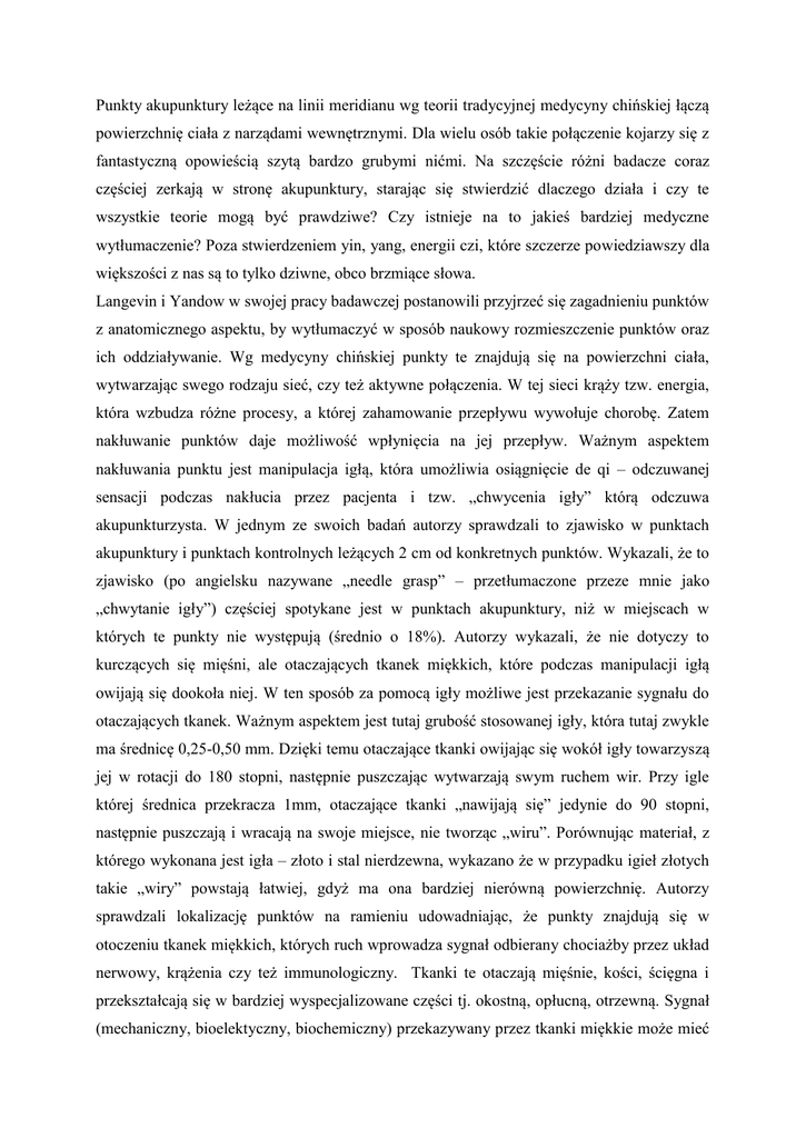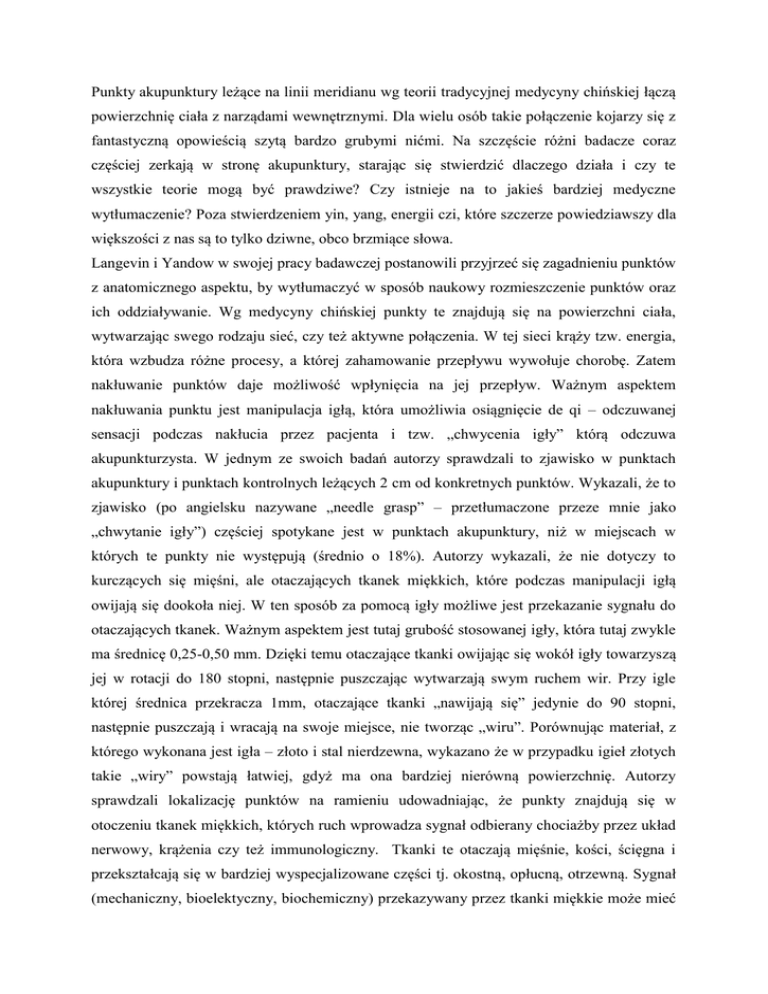 Punkty akupunktury leżące na linii meridianu wg teorii tradycyjnej medycyny chińskiej łączą powierzchnię ciała z narządami wewnętrznymi. Dla wielu osób takie połączenie kojarzy się z fantastyczną opowieścią szytą bardzo grubymi nićmi. Na szczęście różni badacze coraz częściej zerkają w stronę akupunktury, starając się stwierdzić dlaczego działa i czy te wszystkie teorie mogą być prawdziwe? Czy istnieje na to jakieś bardziej medyczne wytłumaczenie? Poza stwierdzeniem yin, yang, energii czi, które szczerze powiedziawszy dla większości z nas są to tylko dziwne, obco brzmiące słowa. Langevin i Yandow w swojej pracy badawczej postanowili przyjrzeć się zagadnieniu punktów z anatomicznego aspektu, by wytłumaczyć w sposób naukowy rozmieszczenie punktów oraz ich oddziaływanie. Wg medycyny chińskiej punkty te znajdują się na powierzchni ciała, wytwarzając swego rodzaju sieć, czy też aktywne połączenia. W tej sieci krąży tzw. energia, która wzbudza różne procesy, a której zahamowanie przepływu wywołuje chorobę. Zatem nakłuwanie punktów daje możliwość wpłynięcia na jej przepływ. Ważnym aspektem nakłuwania punktu jest manipulacja igłą, która umożliwia osiągnięcie de qi – odczuwanej sensacji podczas nakłucia przez pacjenta i tzw. „chwycenia igły” którą odczuwa akupunkturzysta. W jednym ze swoich badań autorzy sprawdzali to zjawisko w punktach akupunktury i punktach kontrolnych leżących 2 cm od konkretnych punktów. Wykazali, że to zjawisko (po angielsku nazywane „needle grasp” – przetłumaczone przeze mnie jako „chwytanie igły”) częściej spotykane jest w punktach akupunktury, niż w miejscach w których te punkty nie występują (średnio o 18%). Autorzy wykazali, że nie dotyczy to kurczących się mięśni, ale otaczających tkanek miękkich, które podczas manipulacji igłą owijają się dookoła niej. W ten sposób za pomocą igły możliwe jest przekazanie sygnału do otaczających tkanek. Ważnym aspektem jest tutaj grubość stosowanej igły, która tutaj zwykle ma średnicę 0,25-0,50 mm. Dzięki temu otaczające tkanki owijając się wokół igły towarzyszą jej w rotacji do 180 stopni, następnie puszczając wytwarzają swym ruchem wir. Przy igle której średnica przekracza 1mm, otaczające tkanki „nawijają się” jedynie do 90 stopni, następnie puszczają i wracają na swoje miejsce, nie tworząc „wiru”. Porównując materiał, z którego wykonana jest igła – złoto i stal nierdzewna, wykazano że w przypadku igieł złotych takie „wiry” powstają łatwiej, gdyż ma ona bardziej nierówną powierzchnię. Autorzy sprawdzali lokalizację punktów na ramieniu udowadniając, że punkty znajdują się w otoczeniu tkanek miękkich, których ruch wprowadza sygnał odbierany chociażby przez układ nerwowy, krążenia czy też immunologiczny. Tkanki te otaczają mięśnie, kości, ścięgna i przekształcają się w bardziej wyspecjalizowane części tj. okostną, opłucną, otrzewną. Sygnał (mechaniczny, bioelektyczny, biochemiczny) przekazywany przez tkanki miękkie może mieć potencjalnie ogromne znaczenie, łącząc różne części ciała jak i wpływając na fizjologię, gdyż otaczają takie struktury jak nerwy, naczynia krwionośne czy limfatyczne. Źródło FEATURE ARTICLE Relationship of Acupuncture Points and Meridiansto Connective Tissue PlanesHELENE M. LANGEVIN* AND JASON A. YANDOW THE ANATOMICAL RECORD (NEW ANAT.) 269:257–265, 2002