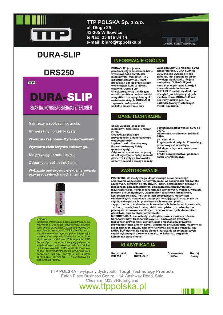 TTP POLSKA Sp. z o.o. ul. D³uga 25 43-365 Wilkowice tel/fax: 33 816 04 14 e-mail: [email protected] DURA-SLIP DRS250 SUPERSZYBKI KLEJ SMAR NAJNOWSZEJ GENERACJI Z TEFLONEM INFORMACJE OGÓLNE DURA-SLIP jest jasnoprzeŸroczystym smarem na bazie wysokowartoœciowych olei mineralnych i mikrosfer PTFE (politetrafluoroetylen), które pracuj¹ jak dobrze przylegaj¹ce i wype³niaj¹ce kulki w ³o¿ysku tocznym. DURA-SLIP charakteryzuje siê najni¿szym wspó³czynnikiem tarcia spoœród wszystkich dostêpnych na rynku materia³ów sta³ych. DURA-SLIP zapewnia profesjonalne i unikalne smarowanie przy wysokich (250°C) i niskich (-50°C) temperaturach. DURA-SLIP nie wysycha, nie wytapia siê, nie zamarza, jest odporny na wodê, nie ulega wyp³ukaniu, nie jest nasi¹kliwy. DURA-SLIP jest neutralny, odporny na korozjê i ma w³aœciwoœci ochronne. DURA-SLIP nadaje siê do du¿ych obci¹¿eñ, jak i do precyzyjnych mechanizmów. DURA-SLIP ma neutralny odczyn pH i nie uszkadza tworzyw sztucznych, metali, kauczuku. DANE TECHNICZNE Najni¿szy wspó³czynnik tarcia. Uniwersalny i przeŸroczysty. Wyd³u¿a czas pomiêdzy smarowaniami. Wytwarza efekt ³o¿yska kulkowego. Nie przyci¹ga brudu i kurzu. Odporny na du¿e obci¹¿enia. Wykazuje perfekcyjny efekt smarowania przy precyzyjnych mechanizmach. UWAGA Wszystkie informacje, ³¹cznie z ilustracjami s¹ wiarygodne. Jednak¿e u¿ytkownicy powinni sami oceniæ przydatnoœæ ka¿dego produktu do w³aœciwych zastosowañ. TTP Polska Sp. z o.o. nie gwarantuje dok³adnoœci pe³nej informacji i zrzeka siê odpowiedzialnoœci odnoœnie u¿ytkowania produktów. Zobowi¹zania TTP Polska Sp. z o.o. ograniczaj¹ siê jedynie do standardowych warunków sprzeda¿y produktu i w ¿adnym wypadku TTP Polska Sp. z o.o. nie ponosi odpowiedzialnoœci za przypadkowe i poœrednie szkody powsta³e na skutek sprzeda¿y, u¿ywania i niew³aœciwego stosowania produktu. Sk³ad: wysokie jakoœci olej mineralny i cz¹steczki (5 mikron) PTFE. Dodatki: zwiêkszaj¹ce przyczepnoœæ, antykorozyjnoœæ i wodoodpornoœæ. Lepkoœæ: lekko tiksotropowy. Barwa: bezbarwny / bia³y (przeŸroczysty). Odpornoœæ chemiczna: odporny na sól, agresywne opary, morskie powietrze i wp³ywy œrodowiska, odporny na s³abe kwasy i zasady. Temperatura stosowania: -50°C do 250°C. Odpornoœæ na ciœnienie: (ASTM D 2596) pH: neutralny. Przydatnoœæ do u¿ycia: 12 miesiêcy, przechowywaæ w suchym, ch³odnym miejscu, chroniæ przed mrozem. Œrodki bezpieczeñstwa: podano w karcie charakterystyki. ZASTOSOWANIE PRZEMYS£: do efektywnego, d³ugotrwa³ego i ekonomicznego smarowania wszystkich ruchomych czêœci w: podajnikach rolkowych i szynowych, pompach elektrycznych, linach, przek³adniach zêbatych i ³añcuchach, pompach zêbatych, pompach zanurzeniowych (oœ), ³o¿yskach (walce, kulki), mechanizmach dŸwigowych, windach, walcach, m³otach pneumatycznych, urz¹dzeniach tokarskich i frezerskich, kosiarkach do trawy, instrumentach precyzyjnych, maszynach w³ókienniczych, maszynach t³ocz¹cych i wybijaj¹cych, maszynach do szycia, wytrz¹saczach i przesiewaczach kruszyw i piasku, zagêszczaczach, szyberdachach, wrzecionach, betoniarkach, zaworach, zamkach, osiach, broni palnej, elektronarzêdziach, urz¹dzeniach w przemyœle drzewnym, metalowym, tworzyw sztucznych, drukarniach, górnictwie, ogrodnictwie, lotnictwie itp. MOTORYZACJA: samochody, motocykle, rowery, maszyny rolnicze, transport wodny, transport ko³owy, …..: smarowanie otwartych ³añcuchów, prowadnice i zawiasy, okna i mechanizmy drzwiowe, prowadnice foteli, anteny, zamki, urz¹dzenia pneumatyczne, maszyny do robót ziemnych, dŸwigi, elementy ruchome i blokuj¹ce wahaczy, itp. DURA-SLIP doskonale nadaje siê do smarowania wspó³pracuj¹cych czêœci wykonanych zarówno z mealu, jak i plastiku, wzglêdnie kombinacji plastik/metal. KLASYFIKACJA Kod artyku³u DSL250 Nazwa DURA-SLIP Opakowanie 400ml TTP POLSKA - wy³¹czny dystrybutor Tough Technology Products Eaton Place Business Centre, 114 Washway Road, Sale Cheshire, M33 7RF, England www.ttppolska.pl Rodzaj Smary