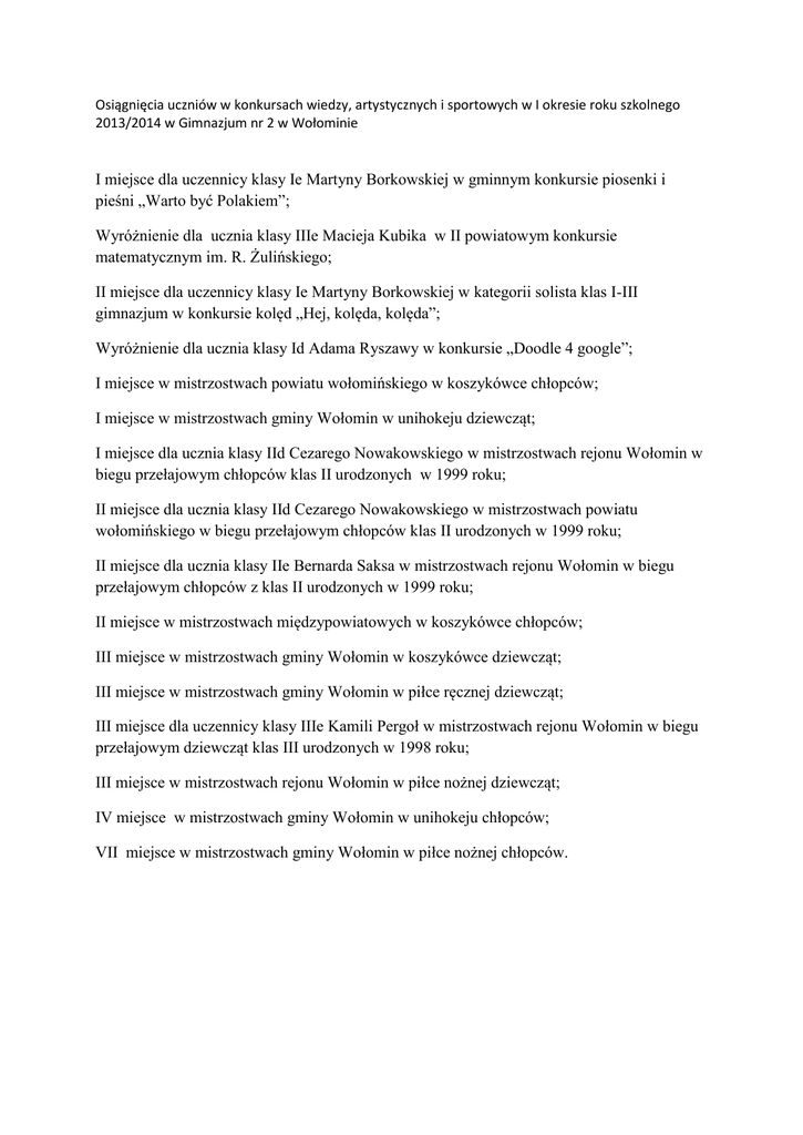 Osiągnięcia uczniów w konkursach wiedzy, artystycznych i sportowych w I okresie roku szkolnego 2013/2014 w Gimnazjum nr 2 w Wołominie I miejsce dla uczennicy klasy Ie Martyny Borkowskiej w gminnym konkursie piosenki i pieśni „Warto być Polakiem”; Wyróżnienie dla ucznia klasy IIIe Macieja Kubika w II powiatowym konkursie matematycznym im. R. Żulińskiego; II miejsce dla uczennicy klasy Ie Martyny Borkowskiej w kategorii solista klas I-III gimnazjum w konkursie kolęd „Hej, kolęda, kolęda”; Wyróżnienie dla ucznia klasy Id Adama Ryszawy w konkursie „Doodle 4 google”; I miejsce w mistrzostwach powiatu wołomińskiego w koszykówce chłopców; I miejsce w mistrzostwach gminy Wołomin w unihokeju dziewcząt; I miejsce dla ucznia klasy IId Cezarego Nowakowskiego w mistrzostwach rejonu Wołomin w biegu przełajowym chłopców klas II urodzonych w 1999 roku; II miejsce dla ucznia klasy IId Cezarego Nowakowskiego w mistrzostwach powiatu wołomińskiego w biegu przełajowym chłopców klas II urodzonych w 1999 roku; II miejsce dla ucznia klasy IIe Bernarda Saksa w mistrzostwach rejonu Wołomin w biegu przełajowym chłopców z klas II urodzonych w 1999 roku; II miejsce w mistrzostwach międzypowiatowych w koszykówce chłopców; III miejsce w mistrzostwach gminy Wołomin w koszykówce dziewcząt; III miejsce w mistrzostwach gminy Wołomin w piłce ręcznej dziewcząt; III miejsce dla uczennicy klasy IIIe Kamili Pergoł w mistrzostwach rejonu Wołomin w biegu przełajowym dziewcząt klas III urodzonych w 1998 roku; III miejsce w mistrzostwach rejonu Wołomin w piłce nożnej dziewcząt; IV miejsce w mistrzostwach gminy Wołomin w unihokeju chłopców; VII miejsce w mistrzostwach gminy Wołomin w piłce nożnej chłopców. Osiągnięcia uczniów w konkursach wiedzy, plastycznych, muzycznych oraz zawodach sportowych w II okresie roku szkolnego 2013/2014: -I miejsce w Ogólnopolskim Konkursie Matematycznym Preteksty ucznia klasy IIIe Macieja Kubika; -I miejsce dla ucznia klasy IIIe Macieja Kubika w powiatowym konkursie „Zielony motyl”; -I miejsce dla ucznia klasy IIIe Patryka Zaniewskiego w powiatowym konkursie „Zielony motyl”; -I miejsce dla ucznia klasy IIIe Michała Kosakowskiego w powiatowym konkursie „Zielony motyl”; -I miejsce dla ucznia klasy IIIe Tomasza Zawadzkiego w powiatowym konkursie „Zielony motyl”; -II miejsce dla uczniów klasy IIe Damiana Pszczółkowskiego, Konrada Godlewskiego i Dawida Pożyczki w powiatowym konkursie „Zielony motyl”; -II miejsce uczennicy klasy Ie Martyny Borkowskiej w kategorii piosenka w Dziecięcym Przeglądzie Artystycznym o nagrodę „Szklanego Misia”; -I miejsce drużyny klas I-III gimnazjum w gminnym konkursie pod honorowym patronatem Burmistrza Wołomina „Szekspir forever”; - I miejsce ucznia klasy IIIe Macieja Kubika w konkursie literackim „Najbardziej twórczą ze wszystkich jest praca nad sobą, która pozwala odnajdywać urok młodości”; - wyróżnienie w eliminacjach powiatowych w Festiwalu Piosenki o Zdrowiu”; -wyróżnienia dla Macieja Kubika, Marty Kamieńskiej, Dominiki Mikołajczak, Julii Krawczykowskiej, Karoliny Żółtowskiej, Natalii Gawryś w X Powiatowym Konkursie Recytatorskim Poezji K.K. Baczyńskiego; - I miejsce ucznia klasy IIIe Patryka Zaniewskiego w mistrzostwach Polski juniorów i juniorek do lat 16 w trójboju siłowym klasycznym; -III miejsce w finale powiatu wołomińskiego w unihokeju dziewcząt; -IV miejsce w mistrzostwach rejonu Wołomin w koszykówce chłopców; -III miejsce w mistrzostwach gminy Wołomin w piłce ręcznej dziewcząt. Ponadto uczniowie klasy IIIe Maciej Kubik oraz Patryk Zaniewski otrzymali stypendium Burmistrza Wołomina dla szczególnie uzdolnionych uczniów-absolwentów gimnazjum.
