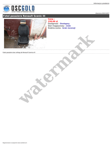 Informacje o produkcie Utworzono 08-03-2017 Fotel pasażera Renault Scenic III Cena : 150,00 zł er m ar k Dostępność : Dostępny Stan magazynowy : niski Średnia ocena : brak recenzji w at Fotel pasażera bez airbag do Renault Scenica III Wygenerowano w programie www.oscGold.com