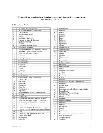 Wykaz ulic na terenie miasta Łodzi zaliczonych do kategorii dróg gminnych. Stan na dzień 1.01.2011 r. Dzielnica Łódź Polesie 1. 2. 3. 4. 5. 6. 7. 8. 9. 10. 11. 12. 13. 14. 15. 16. 17. 18. 19. 20. 21. 22. 23. 24. 25. 26. 27. 28. 29. 30. 31. 32. 33. 34. 35. 36. 37. 38. 39. 40. 41. 42. 43. I Korpusu Pancernego WP 28 Pułku Strzelców Kaniowskich Artylerzystów Piotra Bardowskiego Barska Batalionu Platerówek Biegunowa (odc. Krakowska – Spadochroniarzy) Bobowa Bohaterów Monte Cassino Bohaterów Września Bratysławska (odc. bez wylotu – Pienista / Wileńska – aleja Księdza Biskupa Władysława Bandurskiego) Bronowa Bruska Krzysztofa Cedry Chłopickiego Chodkiewicza Cyganka Czołgistów Denna Długosza Filarecka Fizylierów Garnizonowa Gimnastyczna (odc. Maratońska – Armii Łódź) Grochowa Grzybowa Gwardzistów Husarska Huta Jagodnica Jagodnica Jarzynowa (odc. Solec - Srebrzyńska) Jerzego Jęczmienna Karolewska (odc. aleja Księdza Biskupa Władysława Bandurskiego – Wileńska) Kolarska (odc. Maratońska - Smulska) Komandosów Krańcowa Krzemieniecka (odc. Karolewska – aleja Księdza Biskupa Władysława Bandurskiego) Kusa Kwiatowa (odc. Złotno – pos. nr 39) Kwiatów Polskich Laskowicka Legnicka 1.01.2011 r. 44. 45. 46. 47. 48. 49. 50. 51. 52. 53. 54. 55. 56. 57. 58. 59. 60. 61. 62. 63. 64. 65. 66. 67. 68. 69. 70. 71. 72. 73. 74. 75. 76. 77. 78. 79. 80. 81. 82. 83. 84. 85. 86. 87. 88. 89. 90. Lemieszowa Liniowa Lipowa Lorentza Lublinek Łaska Łubinowa Łucznicza ŁyŜwiarska Mania Michałowicza Mielczarskiego Minerska Mińska Mocarna Mundurowa Namiotowa Napoleońska Nowy Józefów Obozowa Odolanowska Okrzei Michała Ossowskiego Owsiana Parafialna Partyzantów F. Perla Perłowa Pienista (odc. Maczka - Zamiejska) Pionierska Płatowcowa Pługowa PodchorąŜych (odc. Złotno - Szczecińska) Podjazdowa Kpt Stefana Pogonowskiego Poniatowskiego Praussa Pszenna Rembielińskiego Rezedowa Rokitny Rowerowa Rusałki Rzepakowa Rzeszowska Ks. Harcmistrza Ignacego Skorupki (odc. Wólczańska – Stefanowskiego ) Smulska 1 91. 92. 93. 94. 95. 96. 97. 98. 99. 100. 101. 102. 103. 104. Snopowa Spadochroniarzy Stare Złotno Prof. Bohdana Stefanowskiego (odc. Radwańska - Skorupki) Sułkowskiego Synów Pułku Syrokomli Szańcowa Szarych Szeregów Szeregowa Tarnowska Tobruk Towarowa (odc. al. Jana Pawła II – bez wylotu) Wapienna 1.01.2011 r. 105. 106. 107. 108. 109. 110. 111. 112. 113. 114. 115. 116. 117. 118. 119. Warneńska Ludwika Waryńskiego Wieczność Wileńska Wilsona Wygodna Wyspiańskiego Zakręt Zaporowa Zasieczna Zbrojna Zwiadowcza Mikoł. Zyndrama śniwna śubrowej 2 Uchwała Nr LXXXVI/1902/02 Rady Miejskiej w Łodzi z dnia 11 września 2002 r. w sprawie zaliczenia i pozbawienia kategorii dróg. Załącznik Nr 1 do uchwały Nr LXXXVI/1902/02 Rady Miejskiej w Łodzi z dnia 11 września 2002 r. Wykaz dróg gminnych, które zalicza się do kategorii dróg powiatowych Lp. 1. 2. Nazwa ulicy Pienista Proletariacka Od Obywatelska Wróblewskiego Do Maczka Wołowa Załącznik Nr 2 do uchwały Nr LXXXVI/1902/02 Rady Miejskiej w Łodzi z dnia 11 września 2002 r. Wykaz dróg powiatowych, które pozbawia się kategorii dróg powiatowych i zalicza się do kategorii dróg gminnych Lp. 1. 2. 3. 4. 5. 6. 7. 8. 9. 10. 11. 12. 13. 14. Nazwa ulicy Biegunowa Bratysławska Bratysławska Długosza Fizylierów Karolewska Krzemieniecka Lipowa Pogonowskiego 28 Pułku Strzelców Kaniowskich Rembielińskiego Spadochroniarzy Stefanowskiego Wileńska Od Krakowska Wileńska Obywatelska Pietrusińskiego Złotno Bandurskiego Karolewska Próchnika Legionów 1-Maja Do Spadochroniarzy Bandurskiego Sztormowa Skarpowa Spadochroniarzy Wileńska Bandurskiego Kopernika Skłodowskiej - Curie Skłodowskiej - Curie al. Politechniki Złotno Radwańska Mińska InŜynierska Biegunowa Skorupki Retkińska Załącznik Nr 4 do uchwały Nr LXXXVI/1902/02 Rady Miejskiej w Łodzi z dnia 11 września 2002 r. Wykaz dróg gminnych, które pozbawia się kategorii drogi publicznej 1. 2. 3. 4. 5. 6. 7. 8. 9. DróŜka Dyskowa Grotowa Jachtowa Południowa Zagrodniki Skorupki (Stefanowskiego – al. Politechniki) Śrutowa pl. Witosa Obowiązuje od 1.01.2003 r. Uchwała Nr XIX/240/03 Rady Miejskiej w Łodzi z dnia 24 września 2003 r. w sprawie zaliczenia dróg do kategorii dróg powiatowych oraz pozbawienia dróg kategorii dróg gminnych. Załącznik Nr 1 do uchwały Nr XIX/240/03 Rady Miejskiej w Łodzi z dnia 24 września 2003 r. Wykaz dróg gminnych, które zalicza się do kategorii dróg powiatowych Lp. 1. Nazwa ulicy Wołowa Od InŜynierska Do Proletariacka Załącznik Nr 2 do uchwały Nr XIX/240/03 Rady Miejskiej w Łodzi z dnia 24 września 2003r. Wykaz dróg, które pozbawia się kategorii dróg gminnych Lp. 1. 2. 3. 4. 5. 6. 7. 8. 9. 10. 11. 12. 13. 14. 15. 16. 17. 18. 19. Nazwa ulicy Artyleryjska Augustyniaka Azaliowa Azotowa Bajana Barlickiego Pl. Barona H. „Smukłego” (daw. ul. Kniewskiego) Biwakowa Bobslejowa Bojerowa Brus Bystra Cieplarniana Ciepła Daniłowskiego Dembińskiego DruŜynowa Dywizjonu 303 Floriańska Od 20. 21. Gazowa Górna bez wylotu/ teren PKP śuŜlowa śuŜlowa Konstantynowska Ikara Cedry Zana Al. Unii bez wylotu/ Maratońska Kwiatowa Boh. Monte Cassino bez wylotu/ Cm. przy ul. Ogrodowej Srebrzyńska Srebrzyńska 22. 23. 24. 25. 26. Gryczana Gwarków Hippiczna Hubala Jarzynowa Wykowa Ikara Oszczepowa Al. Wyszyńskiego Srebrzyńska 27. 28. 29. 30. 31. 32. 33. 34. 35. 36. 37. 38. 39. 40. 41. 42. 43. 44. 45. 46. 47. 48. 49. 50. Kajakowa Lokajskiego Lontowa Mała Naftowa Omłotowa Orzechowa Pietrusińskiego PodchorąŜych Prochowa Ptasia Rychlińskiego Sandomierska Saperów Sieciowa Slalomowa Sowia Sumowa Szermiercza Szkutnicza Tenisowa Towarowa Trójskok Wykowa bez wylotu/ Maratońska Rajdowa Konstantynowska Zielona Al. Włókniarzy Siewna Jarzynowa bez wylotu/ Srebrzyńska Szczecińska Konstantynowska Al. Włókniarzy Długosza Wileńska Krańcowa Sumowa bez wylotu/ śuŜlowa Proletariacka Wł. Kr