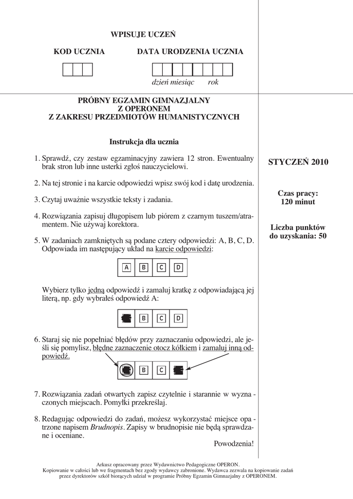 WPISUJE UCZE¡ KOD UCZNIA DATA URODZENIA UCZNIA dzieƒ miesiàc rok PRÓBNY EGZAMIN GIMNAZJALNY Z OPERONEM Z ZAKRESU PRZEDMIOTÓW HUMANISTYCZNYCH Instrukcja dla ucznia 1. Sprawdê, czy zestaw egzaminacyjny zawiera 12 stron. Ewentualny brak stron lub inne usterki zg∏oÊ nauczycielowi. STYCZE¡ 2010 2. Na tej stronie i na karcie odpowiedzi wpisz swój kod i dat´ urodzenia. Czas pracy: 120 minut 3. Czytaj uwa˝nie wszystkie teksty i zadania. 4. Rozwiàzania zapisuj d∏ugopisem lub piórem z czarnym tuszem/atramentem. Nie u˝ywaj korektora. 5. W zadaniach zamkni´tych sà podane cztery odpowiedzi: A, B, C, D. Odpowiada im nast´pujàcy uk∏ad na karcie odpowiedzi: A B C Liczba punktów do uzyskania: 50 D i zamaluj kratk´ z odpowiadajàcà jej Wybierz tylko jednà odpowiedê B literà, np. gdy wybra∏eÊ odpowiedê A: B C D 6. Staraj si´ nie pope∏niaç b∏´dów przy zaznaczaniu odpowiedzi, ale jeÊli si´ pomylisz, b∏´dne zaznaczenie otocz kó∏kiem i zamaluj innà odpowiedê. B C D 7. Rozwiàzania zadaƒ otwartych zapisz czytelnie i starannie w wyzna czonych miejscach. Pomy∏ki przekreÊlaj. 8. Redagujàc odpowiedzi do zadaƒ, mo˝esz wykorzystaç miejsce opa trzone napisem Brudnopis. Zapisy w brudnopisie nie b´dà sprawdzane i oceniane. Powodzenia! Arkusz opracowany przez Wydawnictwo Pedagogiczne OPERON. Kopiowanie w ca∏oÊci lub we fragmentach bez zgody wydawcy zabronione. Wydawca zezwala na kopiowanie zadaƒ przez dyrektorów szkó∏ bioràcych udzia∏ w programie Próbny Egzamin Gimnazjalny z OPERONEM. Przedmioty humanistyczne Próbny Egzamin Gimnazjalny z OPERONEM i „Gazetà Wyborczà” Pieniàdze to nie wszystko Tekst I Matkà pieniàdza, tak jak wszystkich epokowych wynalazków, by∏a potrzeba. [...] Pojawienie si´ pieniàdza by∏o równie donios∏ym wydarzeniem w dziejach ludzkoÊci, jak opanowanie umiej´tnoÊci krzesania ognia czy wynalezienie ko∏a. Dzi´ki niemu izolowane dotàd plemiona zacz´∏y nawiàzywaç kontakty, by sprzedawaç to, co posiada∏y w nadmiarze i kupowaç to, czego im brakowa∏o. Odwa˝ni kupcy zapuszczali si´ w dalsze regiony, szukajàc nowych, atrakcyjnych dóbr. Rozwija∏ si´ handel, post´powa∏a specjalizacja, krótko mówiàc – powstawa∏a gospodarka. DoÊç szybko zauwa˝ono, ˝e poÊrednikiem w wymianie niekoniecznie muszà byç dobra u˝ytkowe. Najlepiej w tej roli sprawdza∏y si´ przedmioty dajàce si´ policzyç lub zwa˝yç, odporne na zniszczenie i na tyle rzadkie, ˝e wzbudza∏y powszechne po˝àdanie. [...] W regionach pasterskich miernikiem wartoÊci by∏o przede wszystkim byd∏o, jeszcze dziÊ w niektórych krajach afrykaƒskich wysokoÊç posagu okreÊla si´ liczbà krów, kóz czy wielb∏àdów. Od Dalekiego Wschodu po Europ´ równie wysoko ceniono sól. Traperzy w Pó∏nocnej Ameryce p∏acili skórkami bobrowymi, na Syberii i Ba∏kanach podobnà rol´ pe∏ni∏y futra kun. Nazwa waluty Chorwacji – kuna – to pozosta∏oÊç po tam tych czasach. Tak ogromna ró˝norodnoÊç Êrodków p∏atniczych utrudnia∏a ˝ycie kupców. Byli nara˝eni na ogromne straty, gdy nieumiej´tnie dobrali towar na wymian´. To, co w jednym regionie uchodzi∏o za wielkie bogactwo, w innym nie mia∏o wartoÊci. Wiele produktów, zw∏aszcza gdy przewo˝ono je na dalsze odleg∏oÊci, traci∏o swoje w∏aÊciwoÊci. Ziarna gni∏y, materia∏y p∏owia∏y, sól si´ rozp∏ywa∏a. Rozwiàzanie znaleêli w III tysiàcleciu p.n.e. mieszkaƒcy Mezopotamii. Tabliczki z pismem klinowym informujà, ˝e za kupowane produkty i wyÊwiadczone us∏ugi p∏acono dok∏adnie odwa˝anym srebrem. To by∏ strza∏ w dziesiàtk´. Srebro idealnie spe∏nia∏o wszystkie warunki, jakich oczekiwano od pieniàdza. By∏o trwa∏e, cenne, podzielne, ∏atwe w transporcie. Wkrótce odkryto, ˝e jeszcze doskonalszym miernikiem wartoÊci jest z∏oto. Oba kruszce tak skutecznie wypar∏y konkurencyjne dobra, ˝e chocia˝ handel wymienny „towar za towar” odbywa∏ si´ nadal, synonimem pieniàdza sta∏y si´ w∏aÊnie one. Nie utraci∏y tej pozycji przez ponad czterdzieÊci wieków. Ka˝da transakcja op∏acana metalami szlachetnymi wymaga∏a nie tylko negocjowania ceny, ale tak˝e odwa˝ania pieni´dzy. Pó∏ biedy, gdy kupiec dysponowa∏ drobnymi grudkami, jeÊli jednak posiada∏ jedynie du˝e bry∏y lub sztabki, musia∏ je ciàç i skrobaç. Wygodniejsze by∏oby pos∏ugiwanie si´ kawa∏kami kruszcu o z góry ustalonym ci´˝arze. [...] Rozwiàzanie znaleziono w Lidii, krainie le˝àcej na terenie dzisiejszej Turcji. Jej w∏adcy wpadli na pomys∏, by na z∏otych sztabkach wybijaç znaki, które gwarantujà wartoÊç. Tak w po∏owie VII wieku p.n.e. powsta∏y pierwsze monety. Pos∏ugiwanie si´ nimi tak u∏atwia∏o ˝ycie, ˝e szybko podbi∏y ca∏y region Morza Âródziemnego. Najwi´kszy wk∏ad w rozpropagowanie monet wnieÊli Grecy, oni te˝ wprowadzili zwyczaj wybijania na nich znaków i napisów pozwalajàcych natychmiast rozpoznaç miejsce pochodzenia pieni´dzy. Z∏oto i srebro mia∏y jednak zbyt du˝à wartoÊç, by nawet najmniejszymi monetami mo˝na by∏o p∏aciç za drobne zakupy. Z tym problemem jako pierwsi uporali si´ greccy osadnicy na Sycylii, którzy w V wieku p.n.e. zacz´li wytwarzaç pienià˝ki z bràzu i innych tanich stopów. Tak powsta∏ bilon, czyli monety codziennego u˝ytku o wi´kszej wartoÊci nominalnej ni˝ zu˝yty na ich wykonanie surowiec. Od Greków kruszcowe pieniàdze przej´li Rzymianie, w Êlad za nimi pozosta∏e ludy Europy. Rzymska mennica znajdowa∏a si´ przy Êwiàtyni jednej z najwa˝niejszych bogiƒ – Junony, obdarzanej przydomkiem Ostrzegajàca, czyli po ∏acinie… Moneta. Bite w niej metalowe krà˝ki nazywano potocznie monetami. [...] W momencie, gdy w∏adcy Lidii postawili pierwszy stempel na monecie, rozpocz´∏a si´ trwajàca do dziÊ walka z fa∏szerzami. Wybijanie oznaczeƒ informujàcych o wartoÊci pieniàdza zrodzi∏o bo wiem po