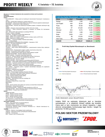 PROFIT WEEKLY 4. kwietnia – 10. kwietnia - 10. kwietnia RELACJA Z VI FORUM STUDENCKICH KÓŁ NAUKOWYCH RYNKU KAPITAŁOWEGO PORTFELE KALENDARZ MAKRO EQUITY CITI HANDLOWY – Niższy wynik na handlowych instrumentach finansowych i rewaluacji za 1Q16 PKO BH – Emisja listów zastawnych o wartości 500 mln zł MILLENNIUM – Nabycie przez Bank Millennium własnych dłużnych papierów wartościowych IDEA BANK – Porozumienie z Getin Holding S.A. BANKI RYNEK – Rozmów nad ostatecznym kształtem projektu o kredytach walutowych ciąg dalszy UNIBEP – Zawarcie umowy budowlanej o wartości 127,5 mln zł netto TRAKCJA – Oferta konsorcjum najtańsza w przetargu na budowę linii tramwajowej Tarchomin ZUE – Oferta spółki najkorzystniejsza w przetargu PKP PLK POLICE – Zmiany w Zarządzie SYNTHOS – Rezygnacja Członka Rady Nadzorczej CIECH – Agenci CBA w siedzibie spółki ORBIS – Spółka chce wypłacić 1,5 zł dywidendy na akcję z zysku za 2015 roku ORBIS - Połączenie ze spółką zależną EMPERIA - …nie jest już lubelska. Przenosi się do stolicy. ATAL – Emisja obligacji JWC/LOKUM/POLNORD/MARVIPOL/DOMDEV – Sprzedaż w 1Q16 ROBYG – 570 lokali przekazanych w 1Q16 VANTAGE – Strategia 2016 ABC DATA – Dywidenda 39 groszy na akcję ? TAURON – Nowa stacja elektroenergetyczna i zaawansowanie budowy bloku elektrowni Jaworzno III GRUPA DUON – Prawdopodobne zdjęcie z giełdy i przymusowy wykup akcji ENERGA – Na półmetku testów projektu Living Lab ENERGA – Zainteresowanie spółki zakupem elektrociepłowni od EDF ENERGETYKA RYNEK – Wywiad z Ministrem Energii KREDYT INKASO – Powołanie nowej Rady Nadzorczej ALTUS TFI – Wartość aktywów pod zarządzaniem wyniosła 10,26 mld zł QUERCUS TFI – Wzrost AuM z 3,5 mld zł do 3,76 mld zł m/m ASSECO POLAND – Umowa z ARiMR ASSECO POLAND – Plany związane ze sprzedażą spółki CR Partners COMARCH – Oferta Spółki najkorzystniejsza w przetargu Ministerstwa Finansów COMARCH – Uzyskanie zezwolenia na prowadzenie działalności w Krakowie PKP CARGO – Powołanie trzech nowych członków zarządu PKP ARGO – Ogłoszenie o zwołaniu Zwyczajnego Walnego Zgromadzenia PKP CARGO – Pozytywna opinia w sprawie rekomendacji dotyczącej nie wypłacania dywidendy za rok 2015 GROCLIN – podpisanie listu intencyjnego UNIWHEELS – 1,65 euro dywidendy ? VISTULA – Podsumowanie wywiadu z Prezesem Zarządu PGNiG – Były prezes PGE szefem PGNiG Upstream International PGNiG – Aktualizacja strategii do 2022 roku LOTOS – Budowa instalacji projektu EFRA NEWAG - Rekomendacja Zarządu ZETKAMA – Optymistyczne szacunki na bieżący rok ZPUE – Zwiększa moc IZO-BLOK - Emisja 300 tys. nowych akcji BORYSZEW ZPUE KGHM – Wzrost wartości akcji spółki oraz rozmowy na temat Sierra Gorda SCM BOGDANKA – Porozumienie płacowe WIRTUALNA POLSKA – Holding nie wypłaci dywidendy za 2015 rok ORANGE POLSKA – Raport dotyczący zakresu stosowania Dobrych Praktyk 4FUN MEDIA – Program opcji menadżerskich - 6. grudnia Profit Akcji Spółek Wzrostowych – PERFORMANCE Akcje L. akcji Początek Koniec Zmiana Robyg 3759 2,95 2,95 0,00% CD Projekt 430 25,35 26,00 2,56% Forte 188 57,00 59,99 5,25% Neuca 57 313,00 310,00 -0,96% Monnari 810 15,70 15,50 -1,27% Vistula 3797 2,99 3,03 1,34% Ergis 2439 4,51 4,63 2,66% Amica 58 173,00 170,55 -1,42% Inter Cars 45 219,00 205,00 -6,39% 105505,47 105686,55 0,17% RAZEM Profit Akcji Spółek Wzrostowych vs. Benchmark 6% 4% 2% 0% -2%6-11 26-12 14-02 5-04 -4% -6% -8% Profit Akcji Spółek Wzrostowych PZU Akcji Małych i Średnich Spółek Quercus Agresywny Pioneer Dynamicznych Spółek DAX MAKRO Tydzień bez fanfar MIEDŹ – Bieżąca sytuacja rynkowa ZŁOTO – Bieżąca sytuacja rynkowa ROPA – Bieżąca sytuacja rynkowa 750 mln zł na B + R w zasięgu MSP Lasy Państwowe z prawem pierwokupu lasów prywatnych od 1 maja RPP: Obecny poziom stóp procentowych sprzyja gospodarce INVESTMENT BANKING PBKM – Cena maksymalna na poziomie 66,50 zł. I2 DEVELOPMENT – Wycena DM BOŚ Rozwiązanie największej fuzji w branży farmaceutycznej Akcjonariusze Starwood Hotels & Resorts Worldwide Inc. i Marriott International Inc. zaakceptowali warunki fuzji TRADING EURPLN – Wybicie z równoległego kanału spadkowego USDPLN – Odwrócenie trendy w perspektywie krótkookresowej? EURUSD – Trend boczny DAX – Analiza z dnia 10 kwietnia 2016 PARTNERZY SKN IK PROFIT: Źródło: Metatrader4, serwer: BossaFX-Demo Indeks DAX na wykresie dziennym jest w trendzie wzrostowym, a w ostatnich dniach odbyła się korekta. Cena jest w tym momencie na silnym wsparciu i jego obrona oznaczałaby kontynuację tego trendu i target na poziomie 10 000 punktów. POLSKI SEKTOR PRZEMYSŁOWY KONTAKT: [email protected] 1 PROFIT WEEKLY 4. kwietnia – 10. kwietnia - 10. kwietnia RELACJA Z VI FORUM STUDENCKICH KÓŁ NAUKOWYCH RYNKU KAPITAŁOWEGO PROFIT NA VI FORUM STUDENCKICH NAUKOWYCH RYNKU KAPITAŁOWEGO KÓŁ Fundacja imienia Lesława A. Pagi 8 kwietnia 2016r. zorganizowała już 6. edycję Forum, które jest projektem adresowanym do studentów – członków kół naukowych i organizacji studenckich działających na wyższych uczelniach, zainteresowanych tematyką rynku kapitałowego, giełdy i ekonomii oraz pragnących poszerzyć swoją wiedzę w tym zakresie. Forum odbyło się w budynku Giełdy Papierów Wartościowych w Warszawie. Po rejestracji uczestnicy zostali zaproszeni do Sali Notowań na powitalną kawę wraz z poczęstunkiem, gdzie można było przywitać się i zamienić kilka słów z członkami kół naukowych z całej Polski. Gdy już większość gości była na miejscu Prezes Fundacji im. Lesława A. Pagi – Ewa Paga oficjalnie powitała gości i rozpoczął się wykład prof. zw. dr hab. Małgorzaty Zaleskiej, prezes GPW, który traktował o aktualnych potrzebach i wyzwaniach, przed jakimi stoi polski rynek kapitałowy. - 6. grudnia Po tej części uczestnicy Forum zostali zaproszeni na wybrane wcześnie