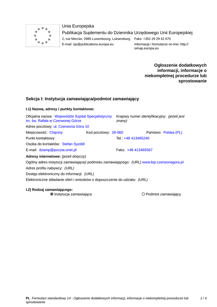 Unia Europejska Publikacja Suplementu do Dziennika Urzędowego Unii Europejskiej 2, rue Mercier, 2985 Luxembourg, Luksemburg Faks: +352 29 29 42 670 E-mail: [email protected] Informacje i formularze on-line: http:// simap.europa.eu Ogłoszenie dodatkowych informacji, informacje o niekompletnej procedurze lub sprostowanie Sekcja I: Instytucja zamawiająca/podmiot zamawiający I.1) Nazwa, adresy i punkty kontaktowe: Oficjalna nazwa: Wojewódzki Szpital Specjalistyczny im. św. Rafała w Czerwonej Górze Krajowy numer identyfikacyjny: (jeżeli jest znany) _____ Adres pocztowy: ul. Czerwona Góra 10 Miejscowość: Chęciny Kod pocztowy: 26-060 Punkt kontaktowy: _____ Państwo: Polska (PL) Tel.: +48 413465240 Osoba do kontaktów: Stefan Syzdół E-mail: [email protected] Faks: +48 413465567 Adresy internetowe: (jeżeli dotyczy) Ogólny adres instytucji zamawiającej/ podmiotu zamawiającego: (URL) www.bip.czerwonagora.pl Adres profilu nabywcy: (URL) _____ Dostęp elektroniczny do informacji: (URL) _____ Elektroniczne składanie ofert i wniosków o dopuszczenie do udziału: (URL) _____ I.2) Rodzaj zamawiającego: Instytucja zamawiająca Podmiot zamawiający PL Formularz standardowy 14 - Ogłoszenie dodatkowych informacji, informacje o niekompletnej procedurze lub sprostowanie 1/4 Sekcja II: Przedmiot zamówienia II.1.1) Nazwa nadana zamówieniu: Dostawa aparatury i sprzętu medycznego wraz z montażem i uruchomieniem na Bloku Operacyjnym. II.1.2) Krótki opis zamówienia lub zakupu:(podano w pierwotnym ogłoszeniu) Dostawa aparatury i sprzętu medycznego wraz z montażem i uruchomieniem na Bloku Operacyjnym: 1.Aparat do znieczulania dla dorosłych - 3 kpl. 2.System monitorujący składający się z 10 sztuk monitorów funkcji życiowych oraz centrali monitorującej - 1 szt. 3.Defibrylator- 1 szt. 4.Sufitowa, dwustanowiskowa kolumna medyczna dla sali pooperacyjnej - 3 kpl. 5.Łóżko do sali pooperacyjnej - 2 szt. 6.Wózek reanimacyjno-transportowy - 4 szt. 7.System elektroniczny z funkcją negatoskopu oraz modułowym systemem integracji i komunikacji bloku operacyjnego - 4 kpl. 8.Dwuczaszowa lampa operacyjna z przygotowaniem pod kamerę oraz dodatkowym monitorem LCD na trzecim ramieniu - 2 szt. 9.Diatermia chirurgiczna z modułem do głębokiego zamykania naczyń - 1kpl. 10.System pomp strzykawkowych do stanowiska znieczulenia, umożliwiający równoczesną infuzję dwóch leków - 3 szt. 11.Wózek anestezjologiczny - 5 szt. 12.Wózek instrumentariuszki - 5 szt. 13.Stół operacyjny - 1 szt. Powyżej 200 000 Euro. Po zamontowaniu w/w urządzeń Wykonawca dokona pomiarów elektrycznych a protokoły przekaże Zamawiającemu. II.1.3) Wspólny Słownik Zamówień (CPV) Główny przedmiot Dodatkowe przedmioty Słownik główny 33100000 33172100 33195000 33182100 33162100 33192120 33192000 33169000 33161000 33194110 33192230 Słownik uzupełniający (jeżeli dotyczy) PL Formularz standardowy 14 - Ogłoszenie dodatkowych informacji, informacje o niekompletnej procedurze lub sprostowanie 2/4 Sekcja IV: Procedura IV.1)Rodzaj procedury(podano w pierwotnym ogłoszeniu) Otwarta Ograniczona Ograniczona przyspieszona Negocjacyjna Negocjacyjna przyspieszona Dialog konkurencyjny Negocjacyjna z uprzednim ogłoszeniem Negocjacyjna bez uprzedniego ogłoszenia Negocjacyjna z publikacją ogłoszenia o zamówieniu Negocjacyjna bez publikacji ogłoszenia o zamówieniu Udzielenie zamówienia bez uprzedniej publikacji ogłoszenia o zamówieniu w Dzienniku Urzędowym Unii Europejskiej IV.2)Informacje administracyjne IV.2.1)Numer referencyjny: (podano w pierwotnym ogłoszeniu) DZ-65-2012 IV.2.2)Dane referencyjne ogłoszenia w przypadku ogłoszeń przesłanych drogą elektroniczną: Pierwotne ogłoszenie przesłane przez eNotices TED eSender Login: ENOTICES_dzp Dane referencyjne ogłoszenia: 2012-041104 rok i numer dokumentu IV.2.3)Ogłoszenie, którego dotyczy niniejsza publikacja: Numer ogłoszenia w Dz.U.: 2012/S 57-093013 z dnia: 22/03/2012 (dd/mm/rrrr) IV.2.4)Data wysłania pierwotnego ogłoszenia: 19/03/2012 (dd/mm/rrrr) PL Formularz standardowy 14 - Ogłoszenie dodatkowych informacji, informacje o niekompletnej procedurze lub sprostowanie 3/4 Sekcja VI: Informacje uzupełniające VI.1) Ogłoszenie dotyczy: Procedury niepełnej Sprostowania Informacji dodatkowych VI.2) Informacje na temat niepełnej procedury udzielenia zamówienia: Postępowanie o udzielenie zamówienia zostało przerwane Postępowanie o udzielenie zamówienia uznano za nieskuteczne Zamówienia nie udzielono Zamówienie może być przedmiotem ponownej publikacji VI.3) Informacje do poprawienia lub dodania : VI.3.1) Zmiana oryginalnej informacji podanej przez instytucję zamawiającą Publikacja w witrynie TED niezgodna z oryginalną informacją, przekazaną przez instytucję zamawiającą Oba przypadki VI.3.2) W ogłoszeniu pierwotnym W odpowiedniej dokumentacji przetargowej (więcej informacji w odpowiedniej dokumentacji przetargowej) W obu przypadkach (więcej informacji w odpowiedniej dokumentacji przetargowej) VI.3.3) Tekst, który należy poprawić w pierwotnym ogłoszeniu Miejsce, w którym znajduje się Zamiast: zmieniany tekst: Termin realizacji zamówienia do VI.3) Informacje dodatkowe 15.06.2012r. VI.3.4) Daty, które należy poprawić w pierwotnym ogłoszeniu Miejsce, w którym znajdują się Zamiast: zmieniane daty: Powinno być: Termin realizacji zamówienia do 5 tygodni od daty podpisania umowy Powinno być: VI.3.5) Adresy i punkty kontaktowe, które należy poprawić VI.3.6) Tekst, który należy dodać do pierwotnego ogłoszenia Miejsce, w którym należy dodać tekst: Tekst do dodania: VI.4) Inne dodatkowe informacje: _____ VI.5) Data wysłania niniejszego ogłoszenia: 05/04/2012 (dd/mm/rrrr) - ID:2012-050522 PL Formularz standardowy 14 - Ogłoszenie dodatkowych informacji, informacje o niekompletnej procedurze lub sprostowanie 4/4