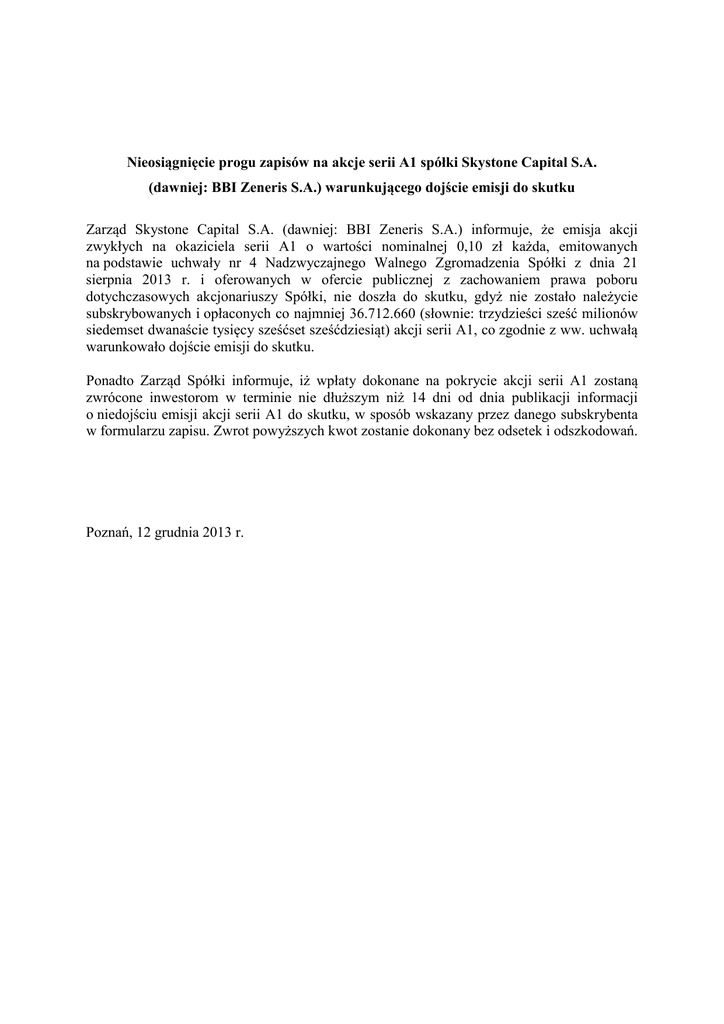Nieosiągnięcie progu zapisów na akcje serii A1 spółki Skystone Capital S.A. (dawniej: BBI Zeneris S.A.) warunkującego dojście emisji do skutku Zarząd Skystone Capital S.A. (dawniej: BBI Zeneris S.A.) informuje, że emisja akcji zwykłych na okaziciela serii A1 o wartości nominalnej 0,10 zł każda, emitowanych na podstawie uchwały nr 4 Nadzwyczajnego Walnego Zgromadzenia Spółki z dnia 21 sierpnia 2013 r. i oferowanych w ofercie publicznej z zachowaniem prawa poboru dotychczasowych akcjonariuszy Spółki, nie doszła do skutku, gdyż nie zostało należycie subskrybowanych i opłaconych co najmniej 36.712.660 (słownie: trzydzieści sześć milionów siedemset dwanaście tysięcy sześćset sześćdziesiąt) akcji serii A1, co zgodnie z ww. uchwałą warunkowało dojście emisji do skutku. Ponadto Zarząd Spółki informuje, iż wpłaty dokonane na pokrycie akcji serii A1 zostaną zwrócone inwestorom w terminie nie dłuższym niż 14 dni od dnia publikacji informacji o niedojściu emisji akcji serii A1 do skutku, w sposób wskazany przez danego subskrybenta w formularzu zapisu. Zwrot powyższych kwot zostanie dokonany bez odsetek i odszkodowań. Poznań, 12 grudnia 2013 r.