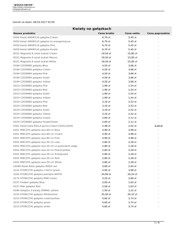 "JESSICA DECOR" http://sklep.myflowers.pl [email protected] Cennik na dzień: 08-03-2017 02:05 Kwiaty na gałązkach Nazwa produktu Cena brutto Cena netto Cena poprzednia K450 Kwiat AMARYLIS gałązka Cream 6,70 zł 5,45 zł - K450 Kwiat AMARYLIS gałązka Lt.orange/mauve 6,70 zł 5,45 zł - K450 Kwiat AMARYLIS gałązka Pink 6,70 zł 5,45 zł - K450 Kwiat AMARYLIS gałązka Purple 6,70 zł 5,45 zł - B151 Magnolia 6 sztuk bukiet Cream 19,50 zł 15,85 zł - B151 Magnolia 6 sztuk bukiet Mauve 19,50 zł 15,85 zł - B151 Magnolia 6 sztuk bukiet White 19,50 zł 15,85 zł - D184 CZOSNEK gałązka Blue 4,50 zł 3,66 zł - D184 CZOSNEK gałązka Cream 4,50 zł 3,66 zł - D184 CZOSNEK gałązka Pink 4,50 zł 3,66 zł - D184 CZOSNEK gałązka Violet 4,50 zł 3,66 zł - D184 CZOSNEK gałązka Yellow 4,50 zł 3,66 zł - D223 CZOSNEK gałązka Pink 1,90 zł 1,54 zł - D223 CZOSNEK gałązka Red 1,90 zł 1,54 zł - D223 CZOSNEK gałązka Violet 1,90 zł 1,54 zł - D223 CZOSNEK gałązka Yellow 1,90 zł 1,54 zł - D224 CZOSNEK gałązka Pink 3,10 zł 2,52 zł - D224 CZOSNEK gałązka Red 3,10 zł 2,52 zł - D224 CZOSNEK gałązka Violet 3,10 zł 2,52 zł - D224 CZOSNEK gałązka Yellow 3,10 zł 2,52 zł - D225 CZOSNEK gałązka Cream 2,60 zł 2,11 zł - D225 CZOSNEK gałązka Purple/Violet 2,60 zł 2,11 zł - K361 Kwiat kalia KALLA guma Cream EXSCLUSIVE 2,48 zł 2,02 zł 3,10 zł K451 MIECZYk gałązka wys.80 cm Blue 4,90 zł 3,98 zł - K451 MIECZYk gałązka wys.80 cm Cream 4,90 zł 3,98 zł - K451 MIECZYk gałązka wys.80 cm Pink 4,90 zł 3,98 zł - K452 MIECZYk gałązka wys.50 cm Lilac 2,80 zł 2,28 zł - K452 MIECZYk gałązka wys.50 cm Lt.green/pink edge 2,80 zł 2,28 zł - K452 MIECZYk gałązka wys.50 cm Peach/yellow 2,80 zł 2,28 zł - K452 MIECZYk gałązka wys.50 cm Pink/purple 2,80 zł 2,28 zł - K452 MIECZYk gałązka wys.50 cm Red 2,80 zł 2,28 zł - K452 MIECZYk gałązka wys.50 cm White 2,80 zł 2,28 zł - LR280 Kwiat Róża gałązka RÓŻA red 3,60 zł 2,93 zł - S154 STORCZYK gałązka z liśćmi green 4,90 zł 3,98 zł - 24,90 zł 20,24 zł - S175 STORCZYK gałązka MINI cream 3,20 zł 2,60 zł - K157 Chaber gałązka Blue 2,00 zł 1,63 zł - K157 Mak gałązka Red 2,00 zł 1,63 zł - K290 Gałązka 3 kwiaty ŻONKIL yellow 1,50 zł 1,22 zł - S150 STORCZYK gałązka White/silver 25,00 zł 20,33 zł - S153 STORCZYK gałązka cream/yellow 4,60 zł 3,74 zł - S153 STORCZYK gałązka green 4,60 zł 3,74 zł - S153 STORCZYK gałązka white 4,60 zł 3,74 zł - S165 STORCZYK gałązka potrójna WHITE 1/6 "JESSICA DECOR" http://sklep.myflowers.pl [email protected] W86 Gałązka GOŹDZIK 40 cm burgund/purple 1,00 zł 0,81 zł - W86 Gałązka GOŹDZIK 40 cm white 1,00 zł 0,81 zł - K157 Stokrotka gałązka Blue 2,00 zł 1,63 zł - K157 Stokrotka gałązka Cream/Yellow 2,00 zł 1,63 zł - K157 Stokrotka gałązka Pink 2,00 zł 1,63 zł - S153 STORCZYK gałązka burgund 4,60 zł 3,74 zł - S153 STORCZYK gałązka lt.green 4,60 zł 3,74 zł - S153 STORCZYK gałązka orange 4,60 zł 3,74 zł - K156 Stokrotka gałązka White 1,80 zł 1,46 zł - K455 Kwiaty jabłoni gałązka Cream/peach 2,30 zł 1,87 zł - K455 Kwiaty jabłoni gałązka Green 2,30 zł 1,87 zł - K199 CHABER gałązka 35 cm Blue 2,50 zł 2,03 zł - K199 MAK gałązka 35 cm Red 2,50 zł 2,03 zł - K199 Stokrotka gałązka 35 cm White 2,50 zł 2,03 zł - K201 Stokrotka podwójna gałązka dk.pink/burgund 2,90 zł 2,36 zł - J15 Krokus gałązka z gipsówką lilac 1,00 zł 0,81 zł - J15 Krokus gałązka z gipsówką violet 1,00 zł 0,81 zł - LW17 Gałązka róży. RÓŻA w pąku KWIAT burgund 2,90 zł 2,36 zł - K281 Bukiet Lawenda Lilac 7,50 zł 6,10 zł - K281 Bukiet Lawenda Violet 7,50 zł 6,10 zł - K37 STORCZYK gałązka Green/Burgund 4,60 zł 3,74 zł - K40 Frezja gałązka - Burgund 2,00 zł 1,63 zł - K40 Frezja gałązka - Cream 2,00 zł 1,63 zł - K40 Frezja gałązka - Cream/Peach 2,00 zł 1,63 zł - K40 Frezja gałązka - Green 2,00 zł 1,63 zł - K40 Frezja gałązka - Orange 2,00 zł 1,63 zł - K40 Frezja gałązka - Yellow/Green 2,00 zł 1,63 zł - K42 Tulipan gałązka Green 1,30 zł 1,06 zł - K42 Tulipan gałązka Lilac 1,30 zł 1,06 zł - K42 Tulipan gałązka Orange 1,30 zł 1,06 zł - K42 Tulipan gałązka Pink 1,30 zł 1,06 zł - K42 Tulipan gałązka Red 1,30 zł 1,06 zł - K42 Tulipan gałązka Wine 1,30 zł 1,06 zł - K42 Tulipan gałązka Yellow 1,30 zł 1,06 zł - K45 Tulipan Papuzi w pąku gałązka Coral/Green 1,90 zł 1,54 zł - K45 Tulipan Papuzi w pąku gałązka Cream/Green 1,90 zł 1,54 zł - K45 Tulipan Papuzi w pąku gałązka Orange 1,90 zł 1,54 zł - K45 Tulipan Papuzi w pąku gałązka Pink/Yellow 1,90 zł 1,54 zł - K45 Tulipan Papuzi w pąku gałązka Pure Cream 1,90 zł 1,54 zł - K45 Tulipan Papuzi w pąku gałązka Purple 1,90 zł 1,54 zł - K45 Tulipan Papuzi w pąku gałązka Red 1,90 zł 1,54 zł - K45 Tulipan Papuzi w pąku gałązka Violet/Green 1,90 zł 1,54 zł - K45 Tulipan Papuzi w pąku gałązka Yellow/Orange edge 1,90 zł 1,54 zł - K55 Frezja gałązka - Violet 3,50 zł 2,85 zł - K55 Frezja gałązka - White green 3,50 zł 2,85 zł - LW55 Gerbera gałązka - Dk.pink 1,20 zł 0,98 zł - 2/6 "JESSICA DECOR" http://sklep.myflowers.pl [email protected] LW55 Gerbera gałązka - Green 1,20 zł 0,98 zł - LW55 Gerbera gałązka - Lt.pink/yellow 1,20 zł 0,98 zł - LW55 Gerbera gałązka - White 1,20 zł 0,98 zł - W86 Gałązka GOŹDZIK 40 cm cream 1,00 zł 0,81 zł - W86 Gałązka GOŹDZIK 40 cm dk.orange 1,00 zł 0,81 zł - W86 Gałązka GOŹDZIK 40 cm dk.red 1,00 zł 0,81 zł - W86 Gałązka GOŹDZIK 40 cm lavender/cream 1,00 zł 0,81 zł - W86 Gałązka GOŹDZIK 40 cm lt.orange 1,00 zł 0,81 zł - W86 Gałązka GOŹDZIK 40 cm lt.peach 1,00 zł 0,81 zł - W86 Gałązka GOŹDZIK 40 cm lt.pink 1,00 zł 0,81 zł - W86 Gałązka GOŹDZIK 40 cm lt.violet/lt.edge 1,00 zł 0,81 zł - W86 Gałązka GOŹDZIK 40 cm purple/yellow 1,00 zł 0,81 zł - W86 Gałązka GOŹDZIK 40 cm tt.violet