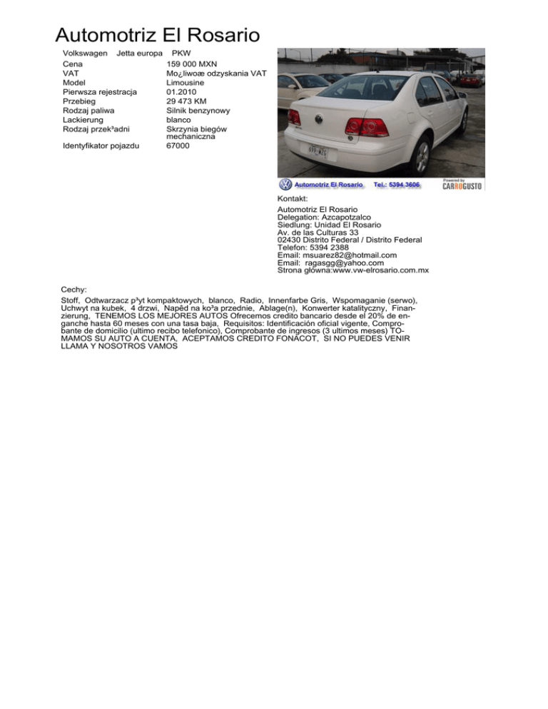 Automotriz El Rosario Volkswagen Jetta europa Cena VAT Model Pierwsza rejestracja Przebieg Rodzaj paliwa Lackierung Rodzaj przek³adni Identyfikator pojazdu PKW 159 000 MXN Mo¿liwoæ odzyskania VAT Limousine 01.2010 29 473 KM Silnik benzynowy blanco Skrzynia biegów mechaniczna 67000 Kontakt: Automotriz El Rosario Delegation: Azcapotzalco Siedlung: Unidad El Rosario Av. de las Culturas 33 02430 Distrito Federal / Distrito Federal Telefon: 5394 2388 Email: [email protected] Email: [email protected] Strona główna:www.vw-elrosario.com.mx Cechy: Stoff, Odtwarzacz p³yt kompaktowych, blanco, Radio, Innenfarbe Gris, Wspomaganie (serwo), Uchwyt na kubek, 4 drzwi, Napêd na ko³a przednie, Ablage(n), Konwerter katalityczny, Finanzierung, TENEMOS LOS MEJORES AUTOS Ofrecemos credito bancario desde el 20% de enganche hasta 60 meses con una tasa baja, Requisitos: Identificación oficial vigente, Comprobante de domicilio (ultimo recibo telefonico), Comprobante de ingresos (3 ultimos meses) TOMAMOS SU AUTO A CUENTA, ACEPTAMOS CREDITO FONACOT, SI NO PUEDES VENIR LLAMA Y NOSOTROS VAMOS
