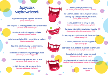 Języczek wędrowniczek Języczek miał jedno ogromne marzenie: (robimy rozmarzoną minę) czas spędzać w podróży przez świata przestrzenie. (otwieramy szeroko usta z zachwytu) Nie służył mu fotel wygodny, ni fajka: (naśladujemy wydychanie powietrza) chciał poznać świat, który opisał ktoś w bajkach! (oblizujemy wargi językiem) Jesienią poznaje polany i lasy, (usta mocno do przodu i naśladujemy szum lasu – szszszszsz) bo woli tam jeździć niż na miejskie wczasy. I cieszy się, kiedy powietrze jest świeże, (robimy głęboki wdech nosem) a idąc, pozdrawia to sowy, to jeże. (usta mocno do przodu i naśladujemy głos sowy: hu, hu) Zaś kiedy śnieżynki w powietrzu fruwają, (kładziemy górne ząbki na dolną wargę i mówimy: fffffff) to wszyscy go chętnie w swych domach witają. (zdziwieni mówimy: O! O!) A tam się wędrowiec do woli wygrzewa, (uf jak gorąco! Uf! Uf!) Czy zimą, czy latem, czy w jesieni porze, (naśladujemy zegar – tik tak, tik tak) śle mnóstwo uśmiechów najpiękniej jak może. (uśmiechamy się, szeroko rozciągając usta) Odwiedza wesołą, spokojną wieś w lecie, (usta mocno do przodu i mówimy: ćśśśś, ćśśś) by łąki słuchały, jak gra im na flecie. (górne zęby na dolną wargę: fi-ju fi-ju fi-ju) lecz tęskni za kwiatkiem, za liściem na drzewach. (robimy bardzo smutną minę, kąciki ust mocno w dół) Nie martwi się jednak i wcale nie smuci, (uśmiechamy się szeroko, kąciki ust w górę) bo gdy przyjdzie wiosna, to do nich powróci! (śmiejemy się głośno i szeroko otwieramy usta: cha, cha, cha, chi, chi, chi) Joanna Szostek logopeda