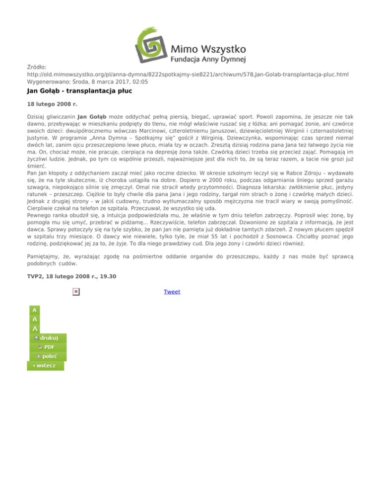 Źródło: http://old.mimowszystko.org/pl/anna-dymna/8222spotkajmy-sie8221/archiwum/578,Jan-Golab-transplantacja-pluc.html Wygenerowano: Środa, 8 marca 2017, 02:05 Jan Gołąb - transplantacja płuc 18 lutego 2008 r. Dzisiaj gliwiczanin Jan Gołąb może oddychać pełną piersią, biegać, uprawiać sport. Powoli zapomina, że jeszcze nie tak dawno, przebywając w mieszkaniu podpięty do tlenu, nie mógł właściwie ruszać się z łóżka; ani pomagać żonie, ani czwórce swoich dzieci: dwuipółrocznemu wówczas Marcinowi, czteroletniemu Januszowi, dziewięcioletniej Wirginii i czternastoletniej Justynie. W programie „Anna Dymna – Spotkajmy się” gościł z Wirginią. Dziewczynka, wspominając czas sprzed niemal dwóch lat, zanim ojcu przeszczepiono lewe płuco, miała łzy w oczach. Zresztą dzisiaj rodzina pana Jana też łatwego życia nie ma. On, chociaż może, nie pracuje, cierpiąca na depresję żona także. Czwórką dzieci trzeba się przecież zająć. Pomagają im życzliwi ludzie. Jednak, po tym co wspólnie przeszli, najważniejsze jest dla nich to, że są teraz razem, a tacie nie grozi już śmierć. Pan Jan kłopoty z oddychaniem zaczął mieć jako roczne dziecko. W okresie szkolnym leczył się w Rabce Zdroju – wydawało się, że na tyle skutecznie, iż choroba ustąpiła na dobre. Dopiero w 2000 roku, podczas odgarniania śniegu sprzed garażu szwagra, niepokojąco silnie się zmęczył. Omal nie stracił wtedy przytomności. Diagnoza lekarska: zwłóknienie płuc, jedyny ratunek – przeszczep. Ciężkie to były chwile dla pana Jana i jego rodziny, targał nim strach o żonę i czwórkę małych dzieci. Jednak z drugiej strony - w jakiś cudowny, trudno wytłumaczalny sposób mężczyzna nie tracił wiary w swoją pomyślność. Cierpliwie czekał na telefon ze szpitala. Przeczuwał, że wszystko się uda. Pewnego ranka obudził się, a intuicja podpowiedziała mu, że właśnie w tym dniu telefon zabrzęczy. Poprosił więc żonę, by pomogła mu się umyć, przebrać w pidżamę... Rzeczywiście, telefon zabrzęczał. Dzwoniono ze szpitala z informacją, że jest dawca. Sprawy potoczyły się na tyle szybko, że pan Jan nie pamięta już dokładnie tamtych zdarzeń. Z nowym płucem spędził w szpitalu trzy miesiące. O dawcy wie niewiele, tylko tyle, że miał 55 lat i pochodził z Sosnowca. Chciałby poznać jego rodzinę, podziękować jej za to, że żyje. To dla niego prawdziwy cud. Dla jego żony i czwórki dzieci również. Pamiętajmy, że, wyrażając zgodę na pośmiertne oddanie organów do przeszczepu, każdy z nas może być sprawcą podobnych cudów. TVP2, 18 lutego 2008 r., 19.30 Tweet