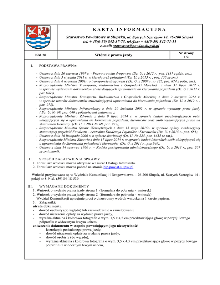 KARTA INFORMACYJNA Starostwo Powiatowe w Słupsku, ul. Szarych Szeregów 14, 76-200 Słupsk tel. + 48(0-59) 842-37-73, tel./fax: + 48(0-59) 842-71-11 e-mail: [email protected] KM.28 I. Nr strony 1/2 PODSTAWA PRAWNA: - - - - II. Wtórnik prawa jazdy Ustawa z dnia 20 czerwca 1997 r. - Prawo o ruchu drogowym (Dz. U. z 2012 r. poz. 1137 z późn. zm.), Ustawa z dnia 5 stycznia 2011 r. o kierujących pojazdami (Dz. U. z 2015 r. , poz. 155 ze zm.), Ustawa z dnia 6 września 2001r. o transporcie drogowym ( Dz. U. z 2007 r. nr 125, poz. 874 z późn, zm.), Rozporządzenie Ministra Transportu, Budownictwa i Gospodarki Morskiej z dnia 31 lipca 2012 r. w sprawie wydawania dokumentów stwierdzających uprawnienia do kierowania pojazdami (Dz. U z 2012 r. poz.1005), Rozporządzenie Ministra Transportu, Budownictwa i Gospodarki Morskiej z dnia 2 sierpnia 2012 r. w sprawie wzorów dokumentów stwierdzających uprawnienia do kierowania pojazdami (Dz. U. z 2012 r. , poz. 973), Rozporządzenie Ministra Infrastruktury z dnia 29 kwietnia 2002 r. w sprawie wymiany praw jazdy ( Dz. U. Nr 69, poz. 640 z późniejszymi zmianami ), Rozporządzenie Ministra Zdrowia z dnia 8 lipca 2014 r. w sprawie badań psychologicznych osób ubiegających się o uprawnienia do kierowania pojazdami, kierowców oraz osób wykonujących pracę na stanowisku kierowcy (Dz. U. z 2014 Nr 69, poz. 937), Rozporządzenie Ministra Spraw Wewnętrznych z dnia 15 maja 2015r. w sprawie opłaty ewidencyjnej stanowiącej przychód Funduszu – centralna Ewidencja Pojazdów i Kierowców (Dz. U. z 2015 r., poz. 681), Ustawa z dnia 16 listopada 2006 r. o opłacie skarbowej (Dz. U. Nr 225, poz. 1635 ze zm.), Rozporządzenie Ministra Zdrowia z dnia 17 lipca 2014 r. w sprawie badań lekarskich osób ubiegających się o uprawnienia do kierowania pojazdami i kierowców (Dz. U. z 2014 r., poz.949), Ustawa z dnia 14 czerwca 1960 r. – Kodeks postępowania administracyjnego (Dz. U. z 2013 r., poz. 267 ze zmianami). SPOSÓB ZAŁATWIENIA SPRAWY 1. Formularz wniosku można otrzymać w Biurze Obsługi Interesanta. 2. Formularz wniosku można pobrać na stronie bip.powiat.slupsk.pl Wnioski przyjmowane są w Wydziale Komunikacji i Drogownictwa – 76-200 Słupsk, ul. Szarych Szeregów 14 pokój nr 8-9 tel. (59) 84-18-539. III. WYMAGANE DOKUMENTY 1. Wniosek o wydanie prawa jazdy strona 1 (formularz do pobrania - wniosek) 2. Wniosek o wydanie prawa jazdy strona 2 (formularz do pobrania - wniosek) Wydział Komunikacji uprzejmie prosi o dwustronny wydruk wniosku na 1 karcie papieru. 3. Załączniki: utrata dokumentu - dowód osobisty (do wglądu) lub zaświadczenie o zameldowaniu - dowód uiszczenia opłaty za wydanie prawa jazdy, - wyraźna aktualna i kolorowa fotografia o wym. 3,5 x 4,5 cm przedstawiająca głowę w pozycji lewego półprofilu z widocznym lewym uchem, zniszczenie dokumentu w stopniu powodującym jego nieczytelność - kserokopia posiadanego prawa jazdy, - dowód uiszczenia opłaty za wydanie prawa jazdy, - dowód osobisty (do wglądu), - wyraźna aktualna i kolorowa fotografia o wym. 3,5 x 4,5 cm przedstawiająca głowę w pozycji lewego półprofilu z widocznym lewym uchem, Wtórnik prawa jazdy KM.28 Nr strony 2/2 zmiana danych umieszczonych w posiadanym prawie jazdy (zmiana nazwiska, adresu, terminu ważności) - dowód osobisty (do wglądu), - kserokopia posiadanego prawa jazdy, - orzeczenie lekarskie w przypadku przedłużenia terminu ważności, - wyraźna aktualna i kolorowa fotografia o wym. 3,5 x 4,5 cm przedstawiająca głowę w pozycji lewego półprofilu z widocznym lewym uchem, - dowód uiszczenia opłaty za prawo jazdy. IV. OPŁATY Opłaty administracyjne: - za wydanie prawa jazdy - 100,00 zł, - opłata ewidencyjna – 0,50 zł, Opłata administracyjna: - wpłata w kasie Urzędu - wpłata przelewem na konto: Starostwo Powiatowe w Słupsku 76-200 Słupsk ul. Szarych Szeregów 14 Bank Spółdzielczy w Ustce konto Nr 63 9315 0004 0050 6818 2000 0050 (z dopiskiem dokonywanej operacji, np. "Opłata za prawo jazdy") Dowód wpłaty prosimy dołączyć do danej procedury. Informujemy, że w/w konto dotyczy tylko i wyłącznie opłat administracyjnych oraz danej procedury urzędowej V. TERMIN ZAŁATWIENIA SPRAWY Prawa jazdy produkowane są w Polskiej Wytwórni Papierów Wartościowych w Warszawie-czas oczekiwania - około trzech tygodni. TRYB ODWOŁAWCZY Od decyzji przysługuje stronie odwołanie do Samorządowego Kolegium Odwoławczego w Słupsku za pośrednictwem Starosty Słupskiego w terminie 14 dni od daty jej doręczenia. VI. VII. INFORMACJE DODATKOWE Informację na temat tego, czy druk prawa jazdy jest już do odbioru w tut. Urzędzie, można sprawdzić na stronie internetowej: www.info-car.pl/infocar/prawo-jazdy/sprawdz-status.html. VIII. OSOBA ZAŁATWIAJĄCA SPRAWĘ Staniuk Aleksandra, pok. 8-9 (parter), (59) 84-18-539 Kołodziejska Aneta, pok. 8-9 (parter), (59) 84-18-539 KM.28 Wydanie V z dnia 21.10.2015 roku Strona 2/2