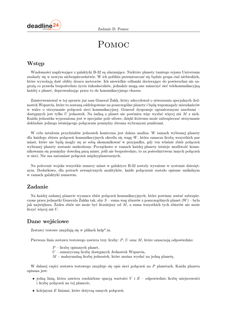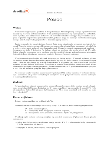 Zadanie D. Pomoc Pomoc Wstęp Wiadomości napływające z galaktyki B-32 są alarmujące. Niektóre planety tamtego rejonu Universum znalazły się w nowym niebezpieczeństwie. W ich pobliżu przemieszczać się będzie grupa ciał niebieskich, które wywołają dość obfity deszcz meteorów. Ich niewielkie odłamki docierające do powierzchni nie zagrożą co prawda bezpośrednio życiu żukoskoczków, jednakże mogą one zniszczyć sieć telekomunikacyjną każdej z planet, doprowadzając przez to do komunikacyjnego chaosu. Zainterweniował w tej sprawie już sam Generał Żukk, który zdecydował o utworzeniu specjalnych Jednostek Wsparcia, które to zostaną oddelegowane na poszczególne planety i będą wspomagały mieszkańców w walce o utrzymanie połączeń sieci komunikacyjnej. Generał dysponuje ograniczonymi zasobami – dostępnych jest tylko U jednostek. Na żadną z planet nie powinien więc wysłać więcej niż M z nich. Każda jednostka wyposażona jest w specjalne pole siłowe, dzięki któremu może zabezpieczać utrzymanie dokładnie jednego istniejącego połączenia pomiędzy dwoma wybranymi punktami. W celu ustalenia przydziałów jednostek konieczna jest dalsza analiza. W ramach wybranej planety dla każdego zbioru połączeń komunikacyjnych określa się wagę W , która oznacza liczbę wszystkich par miast, które nie będą mogły się ze sobą skomunikować w przypadku, gdy ten właśnie zbiór połączeń wybranej planety zostanie uszkodzony. Początkowo w ramach każdej planety istnieje możliwość komunikowania się pomiędzy dowolną parą miast, jeśli nie bezpośrednio, to za pośrednictwem innych połączeń w sieci. Nie ma natomiast połączeń międzyplanetarnych. Na polecenie wojska wszystkie numery miast w galaktyce B-32 zostały wyrażone w systemie dziesiętnym. Dodatkowo, dla potrzeb zewnętrznych analityków, każde połączenie zostało opisane unikalnym w ramach galaktyki numerem. Zadanie Na każdej zadanej planecie wyznacz zbiór połączeń komunikacyjnych, które powinny zostać zabezpieczone przez jednostki Generała Żukka tak, aby S – suma wag zbiorów z poszczególnych planet (W ) – była jak największa. Żaden zbiór nie może być liczniejszy od M , a suma wszystkich tych zbiorów nie może liczyć więcej niż U . Dane wejściowe Zestawy testowe znajdują się w plikach help*.in. Pierwsza linia zestawu testowego zawiera trzy liczby: P , U oraz M , które oznaczają odpowiednio: P – liczbę opisanych planet, U – sumaryczną liczbę dostępnych Jednostek Wsparcia, M – maksymalną liczbę jednostek, które można wysłać na jedną planetę. W dalszej części zestawu testowego znajduje się opis sieci połączeń na P planetach. Każda planeta opisana jest: jedną linią, która zawiera rozdzielone spacją wartości V i E – odpowiednio liczbę miejscowości i liczbę połączeń na tej planecie, kolejnymi E liniami, które dotyczą samych połączeń. Zadanie D. Pomoc Opis każdego połączenia to trzy liczby rozdzielone spacją: numer połączenia oraz dwa numery miast, które go dotyczą. Na każdej planecie miasta mają niezależne numery (od 1 do V ). Pomiędzy parą miast istnieje co najwyżej jedno połączenie. 1 < P 6 200 1 < V 6 2000 1 6 E 6 10000 1 6 U 6 5000 1 6 M 6 50 Dane wyjściowe W pierwszej linii odpowiedzi należy umieścić S – sumę wag wybranych zbiorów ze wszystkich planet. W kolejnych P liniach należy opisać planety pod względem wybranych zbiorów połączeń, które zostaną zabezpieczone. Opisy planet należy podać w takiej samej kolejności, w jakiej znajdują się one w pliku wejściowym. Każdy opis powinien zawierać wyłącznie numery wybranych połączeń na odpowiedniej planecie lub cyfrę 0. Numery połączeń należy rozdzielać spacją oraz uporządkować rosnąco. W przypadku, gdy na odpowiednią planetę nie chcemy wysłać żadnych jednostek w odpowiadającej jej linii wpisujemy 0. Przykład Dla danych wejściowych: 3 3 2 9 11 1 1 2 2 1 3 3 2 3 4 3 4 5 4 5 6 4 7 7 4 9 8 5 6 9 5 7 10 6 7 11 7 8 3 3 20 1 2 21 1 3 22 2 3 7 8 12 1 2 13 1 7 14 2 3 15 3 4 16 3 7 17 4 5 18 4 6 19 5 6 Zadanie D. Pomoc Jeden z możliwych wyników to: 32 5 6 0 15 Ocena Jeśli spełnione są wszystkie poniższe warunki: dane wyjściowe są poprawnie sformatowane, na żadnej planecie nie umieszczono więcej niż M jednostek, w sumie nie próbowano rozmieścić więcej niż U jednostek, numery połączeń są poprawne w ramach każdej planety, wartość S jest poprawnie wyliczona, to ocena za dany zestaw jest równa wartości S. W przeciwnym wypadku ocena wynosi 0.