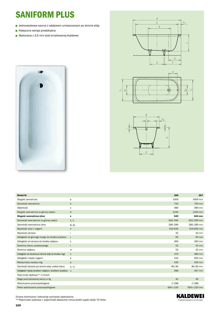 SANIFORM PLUS Jednoosobowa wanna z odpływem umieszczonym po stronie stóp Klasyczna wersja prostokątna Wykonana z 3,5 mm stali emaliowanej Kaldewei 366 367 a 1400 1600 mm 750 mm Model-Nr Długość zewnętrzna Szerokość zewnętrzna b 750 Głębokość c 480 480 mm Długość wewnętrzna (w górnej części) d 1240 1440 mm Długość wewnętrzna (dno) e 645 844 mm Szerokość wewnętrzna (w górnej części) f1; f2 620; 590 620; 590 mm Szerokość wewnętrzna (dno) g1; g2 280; 280 280; 280 mm Wysokość wraz z nogami h 615-635 615-635 mm Wysokość obrzeża i 32 32 mm Odległość od górnego brzegu do środka przelewu j 65 65 mm Odległość od obrzeża do środka odpływu k 360 360 mm Średnica otworu przelewowego l 52 52 mm Średnica odpływu m 52 52 mm Odległość od obrzeża po stronie stóp do środka nogi n 470 480 mm Odległość między nogami o 415 605 mm Maksymalny rozstaw nóg p 430 430 mm Szerokość obrzeża (po stronie stóp, wzdłuż boku) s1; s2 80; 85 80; 85 mm 268 267 mm Odległość między środkiem odpływu i środkiem przelewu u Pojemność użytkowa** w litrach Waga poemaliowanej wanny w kg Wykończenie przeciwpoślizgowe Pełne wykończenie przeciwpoślizgowe Zmiany techniczne i tolerancje wymiarów zastrzeżone. ** Pojemność użytkowa = pojemność absolutna minus średni wypór około 70 litrów 100 42 49 mm 쏗 288 쏗 288 mm 600 x 220 600 x 220 mm