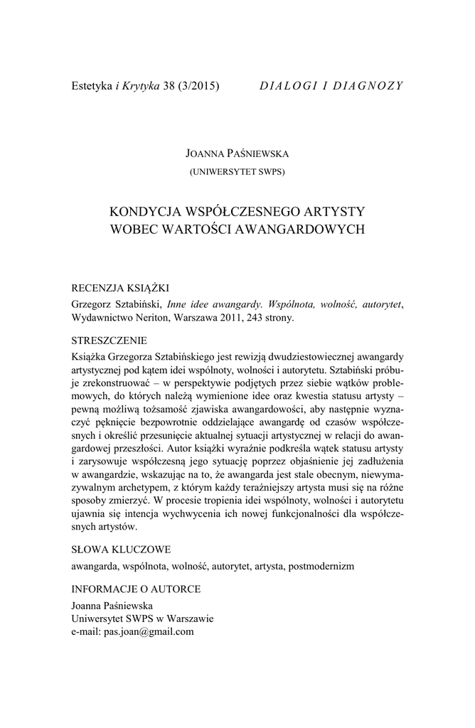 Estetyka i Krytyka 38 (3/2015) DIALOGI I DIAGNOZY JOANNA PAŚNIEWSKA (UNIWERSYTET SWPS) KONDYCJA WSPÓŁCZESNEGO ARTYSTY WOBEC WARTOŚCI AWANGARDOWYCH RECENZJA KSIĄŻKI Grzegorz Sztabiński, Inne idee awangardy. Wspólnota, wolność, autorytet, Wydawnictwo Neriton, Warszawa 2011, 243 strony. STRESZCZENIE Książka Grzegorza Sztabińskiego jest rewizją dwudziestowiecznej awangardy artystycznej pod kątem idei wspólnoty, wolności i autorytetu. Sztabiński próbuje zrekonstruować – w perspektywie podjętych przez siebie wątków problemowych, do których należą wymienione idee oraz kwestia statusu artysty – pewną możliwą tożsamość zjawiska awangardowości, aby następnie wyznaczyć pęknięcie bezpowrotnie oddzielające awangardę od czasów współczesnych i określić przesunięcie aktualnej sytuacji artystycznej w relacji do awangardowej przeszłości. Autor książki wyraźnie podkreśla wątek statusu artysty i zarysowuje współczesną jego sytuację poprzez objaśnienie jej zadłużenia w awangardzie, wskazując na to, że awangarda jest stale obecnym, niewymazywalnym archetypem, z którym każdy teraźniejszy artysta musi się na różne sposoby zmierzyć. W procesie tropienia idei wspólnoty, wolności i autorytetu ujawnia się intencja wychwycenia ich nowej funkcjonalności dla współczesnych artystów. SŁOWA KLUCZOWE awangarda, wspólnota, wolność, autorytet, artysta, postmodernizm INFORMACJE O AUTORCE Joanna Paśniewska Uniwersytet SWPS w Warszawie e-mail: [email protected] Joanna Paśniewska 150 ______________________________________________________________________________________________________________________________________________________________________________________________________ Książka Grzegorza Sztabińskiego jest wielopoziomowa i wielowątkowa. Zamysł autora nie kończy się na rewizji dwudziestowiecznej awangardy artystycznej pod kątem wskazanych w tytule, a jego zdaniem niewyartykułowanych dotąd w sposób jednoznacznie odrębny, idei wspólnoty, wolności i autorytetu. Sztabiński próbuje zrekonstruować – w perspektywie podjętych przez siebie wątków problemowych, do których należą wymienione idee oraz kwestia statusu artysty – pewną możliwą (choć nie absolutną, z czego autor doskonale zdaje sobie sprawę) tożsamość zjawiska awangardowości, aby następnie wyznaczyć pęknięcie bezpowrotnie oddzielające awangardę od czasów współczesnych i określić przesunięcie aktualnej sytuacji artystycznej w relacji do awangardowej przeszłości. Ta wielopoziomowość jest tyleż ambitnym wyzwaniem badawczym, co w pewnym sensie taktyką metodologiczną, dlatego że łączy się z koniecznością określenia przez autora własnego miejsca, usytuowania się w dyskursach opisujących współczesność, oraz z potrzebą ujęcia awangardy w ramy czasowe. Sztabiński analizę poszczególnych wątków w obrębie dziedziny awangardowej poprzedza wstępem, przedstawiającym ich dzieje w czasach antycznych i nowożytnych, a następnie śledzi losy wyróżnionych przez siebie problemów w dyskursach postmodernistycznych. Takie przednowoczesne i ponowoczesne oflankowanie spina klamrą centralny obszar rozważań i mocuje awangardę w szerokim horyzoncie, co z jednej strony ukazuje ją jako konieczność na linii historycznych przemian, konsekwentny w swoich czasach wykwit nowoczesności, a z drugiej doprawia do niej postmodernistycznego cenzora, który wskazuje na awangardowe aporie i paradoksy oraz jej metafizyczne uwikłania. Autor książki uwzględnia wszystkie kluczowe teorie awangardy stworzone przez takich badaczy, jak José Ortega y Gasset, Theodor Adorno, Renato Poggioli, Peter Bürger, z których każdy opisuje tę formację z innego punktu widzenia i inaczej rozkłada akcenty interpretacyjne. Ukazuje to, że zagadnienie awangardowości nie jest jednolicie pojmowane, wobec czego jest dziedziną otwartą i wymagającą rewizji. Sztabiński pisze: „Patrzę na awangardę z perspektywy tego, co wydarzyło się w czasie ostatnich trzech dekad”1. W retrospektywie tej czytelny jest nacisk położony na dystans dzielący współczesne czasy (których początek ustalony jest mniej więcej na przełomie lat 1 G. Sztabiński, Inne idee awangardy. Wspólnota, wolność, autorytet, Warszawa 2011, s. 9. Kondycja współczesnego artysty... 151 ______________________________________________________________________________________________________________________________________________________________________________________________________ siedemdziesiątych i osiemdziesiątych XX wieku) od awangardy, dystans, który zdążył wypełnić się mnogością postmodernistycznych teorii, na ogół oddzielających praktyki awangardowe od praktyk współczesnych grubą kreską i przez to spychających awangardowe modele działania i myślenia w domenę archeologii. Na tym etapie dyskursu badacz, zajmując własne, krytyczne stanowisko, również doszukuje się kontynuacji teoretycznego dookreślania awangardyzmu, przy czym z uwagi na to, że „jakości” postmodernistyczne budowane są w oparciu o przeciwstawienie się specyficznym dla awangardy „jakościom” modernistycznym, dookreślenia te mają charakter pośredni i negatywny. Autor wspiera się na ustaleniach zawartych w bogatym dorobku Stefana Morawskiego, znakomitego badacza i klasyfikatora awangardy, którego pamięci książka jest dedykowana. Podobnie jak on wyznacza cezury zjawiska awangardyzmu, opisując tym pojęciem zarówno klasyczną, przedwojenną Wielką Awangardę, jak i neoawangardę lat sześćdziesiątych i siedemdziesiątych, w której mimo odmiennych okoliczności społeczno-kulturowych uwydatniły się wszystkie postawy i dążenia awangardy pierwszej połowy wieku. Awangarda klasyczna i nowa awangarda to zjawiska tyleż artystyczne, co pozaartystyczne, angażujące się w wiele systemów światopoglądowych i ideologicznych odnoszących się do bieżącego stan
