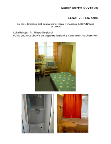 Numer oferty: 097c/08 CENA: 70 PLN/doba Do ceny doliczana jest opłata klimatyczna wynosząca 3,80 PLN/doba za osobę Lokalizacja: Al. Niepodległości Pokój jednoosobowy ze wspólna łazienką i aneksem kuchennym Numer oferty: 097c/08 LOKALIZACJA: Al. Niepodległości Lp. PRZEDMIOT OCENY UWAGI 1. Nowe/stare budownictwo Lata siedemdziesiąte 2. Nowe/stare meble Nowe i stare meble 3. Parking na posesji/GaraŜ Parking ogólnodostępny przy posesji 4. Balkon / taras / ogródek Nie 5. Telewizor (Kablówka, TV Sat), Radio TV kablowa i radio 6. Dostęp do telefonu Nie 7. Dostęp do internetu Nie 8. Kuchnia Wspólna kuchnia na trzy pokoje 9. Łazienka Łazienka z kabina prysznicową oraz WC wspólna na trzy pokoje 10. Pościel, ręczniki Pościel 11. Dostęp do szafy / półek Tak 12. Pobyt ze zwierzątkiem Tak 14. Niepełnosprawni (winda, podjazd) Obiekt nieprzystosowany 15. Plac zabaw dla dzieci Nie 16. Lokalizacja • Centrum – Dworzec PKP • PlaŜa, park • Dzielnica • Komunikacja miejska Osoby palące 17. Niedaleko centrum, przy głównej ulicy, 5 minut do głównego deptaka Bohaterów Monte Cassino, 10 minut do plaŜy Tak