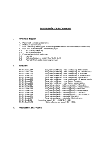 ZAWARTOŚĆ OPRACOWANIA I. OPIS TECHNICZNY 1. Przedmiot i zakres opracowania 2. Podstawa opracowania 3. Opis konstrukcji istniejących budynków przewidzianych do modernizacji i rozbudowy 4. Opis prac rozbiórkowych i modernizacyjnych 4.1. Budynek dydaktyczny 4.2. Budynek specjalny 5. Elementy konstrukcji rozbudowy 5.1. Łącznik 5.2. Klatka schodowa w osiach C.A./ C.16- C.18 5.3. Podnośniki dla osób niepełnosprawnych II. RYSUNKI Pb:TII:Kon:A/01A Pb:TII:Kon:A/01B Pb:TII:Kon:A/02A Pb:TII:Kon:A/02B Pb:TII:Kon:A/03A Pb:TII:Kon:A/03B Pb:TII:Kon:A/04A Pb:TII:Kon:A/04B Pb:TII:Kon:C/05A Pb:TII:Kon:C/05B Pb:TII:Kon:C/06A Pb:TII:Kon:C/06B Pb:TII:Kon:C/07A Pb:TII:Kon:C/07B Pb:TII:Kon:C/08A Pb:TII:Kon:C/08B Pb:TII:Kon:B/09 Pb:TII:Kon:C1/10 III. Budynek dydaktyczny – rzut kondygnacji 01.Rozbiórki. Budynek dydaktyczny – rzut kondygnacji 01. Modernizacja. Budynek dydaktyczny – rzut kondygnacji 0. Rozbiórki. Budynek dydaktyczny – rzut kondygnacji 0. Modernizacja. Budynek dydaktyczny – rzut kondygnacji +1.Rozbiórki. Budynek dydaktyczny – rzut kondygnacji +1. Modernizacja. Budynek dydaktyczny – rzut dachu. Rozbiórki. Budynek dydaktyczny – rzut dachu. Modernizacja. Budynek specjalny – rzut kondygnacji 01. Rozbiórki. Budynek specjalny – rzut kondygnacji 01. Modernizacja. Budynek specjalny – rzut kondygnacji 0. Rozbiórki. Budynek specjalny – rzut kondygnacji 0. Modernizacja. Budynek specjalny – rzut kondygnacji +1. Rozbiórki. Budynek specjalny – rzut kondygnacji +1. Modernizacja. Budynek specjalny – rzut dachu. Rozbiórki. Budynek specjalny – rzut dachu. Modernizacja. Łącznik w osiach B.01 – B.02/ B.A - B.D. Klatka schodowa w osiach D.01- D.02. OBLICZENIA STATYCZNE I. 1. OPIS TECHNICZNY PRZEDMIOT I ZAKRES OPRACOWANIA Przedmiotem tej części opracowania jest projekt budowlany modernizacji Budynku Dydaktycznego oraz Budynku Specjalnego, będących częścią kompleksu budynków XXXIX Liceum Ogólnokształcącego im. Lotnictwa Polskiego zlokalizowanego w Warszawie przy ul. Lindego 20. Zakres projektu obejmuje określenie metody i kolejności rozbiórki fragmentów elementów konstrukcyjnych oraz projekt wykonania nowych elementów konstrukcyjnych koniecznych do prawidłowego uŜytkowania budynków zgodnie z nowym programem uŜytkowym. Niniejszy projekt posiada stopień szczegółowości i zakres rzeczowy zgodny z właściwymi przepisami Rozporządzenia Ministra Infrastruktury z dnia 3 lipca 2003 r. w sprawie szczegółowości zakresu i formy projektu budowlanego (Dz.U. Nr 120 poz.1133) i słuŜy wyłącznie procedurze uzyskania pozwolenia na budowę. 2. PODSTAWA OPRACOWANIA Podstawą opracowania jest : - 3. Archiwalny projekt wstępny szkoły wraz z pawilonem sportowym zlokalizowanej w Warszawie na osiedlu Młociny przy ul. Lindego 20 , wykonany przez Miastoprojekt Stolica – Północ w 1962 roku Wizja lokalna przedmiotu rozbiórki wykonana przez autorów niniejszego opracowania w dniu 05.10.2006 r. Ekspertyza techniczna wykonana w listopadzie 2006 r. przez uprawnionego rzeczoznawcę mgr inŜ. Zbigniewa Kubiaka potwierdzająca moŜliwość wykonania modernizacji. Architektoniczny projekt budowlany modernizacji i rozbudowy budynków : dydaktycznego i specjalnego. OPIS KONSTRUKCJI ISTNIEJĄCYCH BUDYNKÓW PRZEWIDZIANYCH DO MODERNIZACJI I ROZBUDOWY Modernizowane budynki : dydaktyczny i specjalny są częścią kompleksu budynków XXXIX Liceum ogólnokształcącego im. Lotnictwa Polskiego zlokalizowanego przy ul. Lindego 20 w Warszawie. a) BUDYNEK DYDAKTYCZNY Budynek dydaktyczny jest budynkiem dwukondygnacyjnym podpiwniczonym wykonanym w technologii tradycyjnej. Ściany konstrukcyjne w układzie podłuŜnym wykonano jako murowane, natomiast stropy jako gęstoŜebrowe systemu Ackermana w dwu sześciometrowych traktach. Stropy oparte są na podłuŜnych ścianach zewnętrznych oraz podłuŜnej ścianie środkowej. Konstrukcja dachu wykonana jest z płyt korytkowych rozpiętości 6 m z jednostronnym spadkiem. Płyty oparte są na podłuŜnych ścianach konstrukcyjnych. Budynek ma wymiary w rzucie 70x12 m i usytuowany jest podłuŜną osią w kierunku wschód zachód. W północnych naroŜnikach budynku zlokalizowano klatki schodowe komunikujące wszystkie kondygnacje budynku. Sztywność przestrzenną obiektu zapewniają podłuŜne ściany konstrukcyjne jak równieŜ poprzeczne ściany usztywniające, w tym ściany naroŜnych klatek schodowych. Od strony północnej do budynku dydaktycznego przylega parterowy budynek administracyjny o wymiarach w rzucie ok. 11x11 m . Budynek administracyjny połączony jest z dydaktycznym w osiach A.13 – A.15 niewielkim łącznikiem w poziomie parteru. Podpiwniczenie budynku zrealizowano jako częściowe głownie w południowej części o raz w rzucie klatek schodowych. Od strony północnej w poziomie piwnicy zlokalizowano kanał techniczny c.o. Przestrzenie pomiędzy ścianami konstrukcyjnymi są w głównej mierze zasypane. b) BUDYNEK SPECJALNY Budynek specjalny jest budynkiem dwukondygnacyjnym podpiwniczonym wykonanym w technologii tradycyjnej. Ściany konstrukcyjne w układzie podłuŜnym wykonano jako murowane, natomiast stropy jako gęstoŜebrowe systemu Ackermana w dwu sześciometrowych traktach zewnętrznych i jednym , środkowym trakcie korytarzowym o szerokości 2,70 m. Stropy oparte są na podłuŜnych ścianach zewnętrznych oraz podłuŜnych ścianach środkowych. Ściany zewnętrzne podłuŜne wykonane są z elementów prefabrykowanych w postaci Ŝelbetowych ramek długości 220 cm i wysokości równej wysokości kondygnacji. Ramki Składają się z 2 słupków połączonych nadproŜem i Ŝelbetowym pasmem podokiennym. Konstrukcja dachu wykonana jest z płyt korytkowych rozpiętości 6,00 i 2,70 m z jednostronnym spadkiem. Płyty oparte są na podłuŜnych ścianach konstrukcyjnych. Budynek ma wymiary w rzucie 40x15,6 m i usytuowany jest podłuŜną osią w kierunku wschód zachód. Budynek posiada 1 klatkę schodową zl