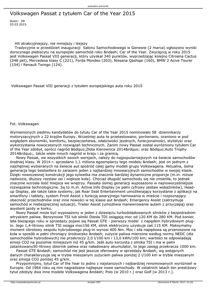 autosalon pomorski Volkswagen Passat z tytułem Car of the Year 2015 Autor: IW 03.03.2015. Hit atrakcyjniejszy, nie mniejszy i lżejszy Tradycyjnie w przeddzień inauguracji Salonu Samochodowego w Genewie (2 marca) ogłoszono wyniki dorocznego plebiscytu na europejski samochód roku – Car of the Year. Zwycięzcą w roku 2015 jest Volkswagen Passat VIII generacji, który uzyskał 340 punktów, wyprzedzając kolejno Citroena Cactus (248 pkt), Mercedesa klasy C (221), Forda Mondeo (203), Nissana Qashqai (160), BMW 2 Acive Tourer (154) i Renault Twingo (124). Volkswagen Passat VIII generacji z tytułem europejskiego auta roku 2015 Fot. Volkswagen Wymienionych siedmiu kandydatów do tytułu Car of the Year 2015 nominowało 58 dziennikarzy motoryzacyjnych z 22 krajów Europy. Wcześniej auta te przetestowano, porównano, oceniono w pod względem ekonomiki, komfortu, bezpieczeństwa, właściwości jezdnych, funkcjonalności, stylistyki oraz wykorzystania nowoczesnych rozwiązań technicznych. Zanim nowy Passat został wyróżniony tytułem Car of the Year zdobył, oprócz nagród „Złota Kierownica 2014” oraz „Auto Trophy 2014”, także wiele innych nagród w kraju i za granicą. Nowy Passat, we wszystkich swoich wersjach, należy do najpopularniejszych na świecie samochodów średniej klasy. W 2014 r. sprzedano 1,1 miliona egzemplarzy tego modelu – jest on jednym z najchętniej wybieranych na świecie aut spośród całej gamy modeli grupy Volkswagena. Aktualna, ósma generacja tego bestsellera to zarazem jeden z najbardziej innowacyjnych samochodów w swojej klasie. Dzięki nowoczesnej konstrukcji jego sylwetka ma znacznie bardziej dynamiczne proporcje (m.in. niższe nadwozie, dłuższy rozstaw osi i większe koła). Chociaż długość samochodu się nie zmieniła, to jednak znacznie wzrosła ilość miejsca we wnętrzu. Passata ósmej generacji wyposażono w najnowocześniejsze rozwiązania technologiczne. Są to m.in. Active Info Display (w pełni cyfrowy zestaw wskaźników), Headup Display, ale także takie systemy, jak Rear Seat Entertainment umożliwiający korzystanie z aplikacji na smartfony i tablety, system Front Assist z funkcją awaryjnego hamowania w mieście i rozpoznający obecność przechodniów oraz inne nowości w tej klasie aut – Emergency Assist (zatrzymuje samochód w niebezpiecznej sytuacji), Trailer Assist (umożliwia manewrowanie autem z przyczepą) oraz asystent jazdy w korku. Nowy Passat może być wyposażony w jeden z dziesięciu turbodoładowanych silników z bezpośrednim wtryskiem paliwa. Benzynowe TSI lub silniki Diesla TDI osiągają moc od 120 KM do 280 KM. Pod koniec lata bieżącego roku w sprzedaży pojawi się Passat GTE - pierwszy model z napędem hybrydowym plugin. Jego 1,4-litrowy silnik TSI osiąga moc156 KM, silnik elektryczny uzyskuje zaś 115 KM. Maksymalny moment obrotowy zespołu hybrydowego plug-in wynosi 400 Nm. Moc i siła napędowa są przenoszone na koła w sposób w pełni chroniący środowisko – zużycie paliwa mierzone według normy NEDC (dla samochodów hybrydowych) nie przekroczy 2,0 l/100 km i 13,0 kWh/100 km; wartości te odpowiadają emisji CO2 na poziomie mniejszym niż 45 g/km. Jeśli auto korzysta z silnika TSI i ma w pełni zatankowany50-litrowy zbiornik paliwa oraz naładowany akumulator, to jego zasięg przekracza 1000 km. Passat GTE – samochód nie jest jeszcze oferowany w sprzedaży – wg wstępnych danych charakteryzuje się w trybie mieszanym zużyciem paliwa poniżej 2 l/100 km w trybie mieszanym oraz emisja CO2 poniżej 45 g/km. Przypomnijmy, tytuł Car of the Year to jedno z najstarszych i najbardziej renomowanych wyróżnień w Europie. Od 1964 roku są nim nagradzane najlepsze nowe samochody. W ostatnich latach ten prestiżowy tytuł zdobyły dwa inne modele Volkswagena – Polo (w 2010 r.) oraz Golf (w 2013 r.). http://autosalonpomorski.pl Kreator PDF Utworzono 8 March, 2017, 01:05