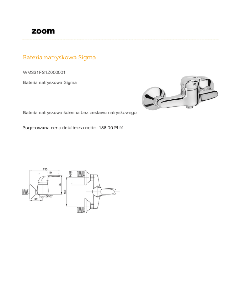 Bateria natryskowa Sigma WM331FS1Z000001 Bateria natryskowa Sigma Bateria natryskowa ścienna bez zestawu natryskowego Sugerowana cena detaliczna netto: 188.00 PLN