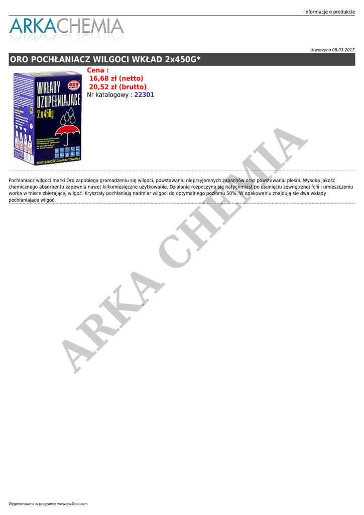 Informacje o produkcie Utworzono 08-03-2017 ORO POCHŁANIACZ WILGOCI WKŁAD 2x450G* Cena : 16,68 zł (netto) 20,52 zł (brutto) H EM IA Nr katalogowy : 22301 AR K A C Pochłaniacz wilgoci marki Oro zapobiega gromadzeniu się wilgoci, powstawaniu nieprzyjemnych zapachów oraz powstawaniu pleśni. Wysoka jakość chemicznego absorbentu zapewnia nawet kilkumiesięczne użytkowanie. Działanie rozpoczyna się natychmiast po usunięciu zewnętrznej folii i umieszczeniu worka w misce zbierającej wilgoć. Kryształy pochłaniają nadmiar wilgoci do optymalnego poziomu 50%. W opakowaniu znajdują się dwa wkłady pochłaniające wilgoć. Wygenerowano w programie www.oscGold.com